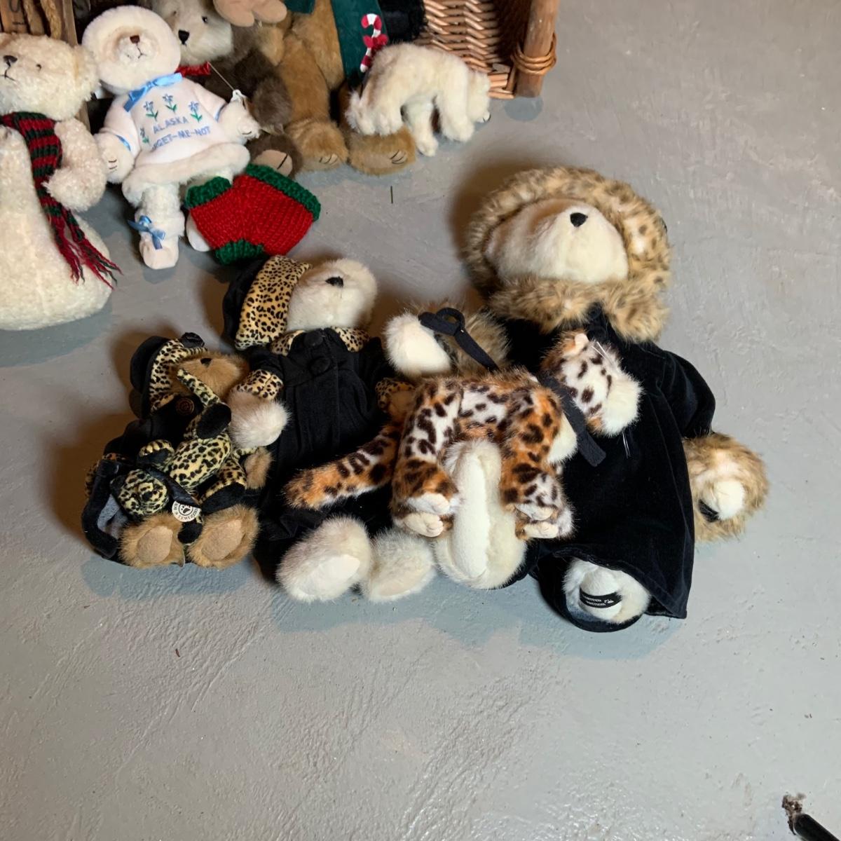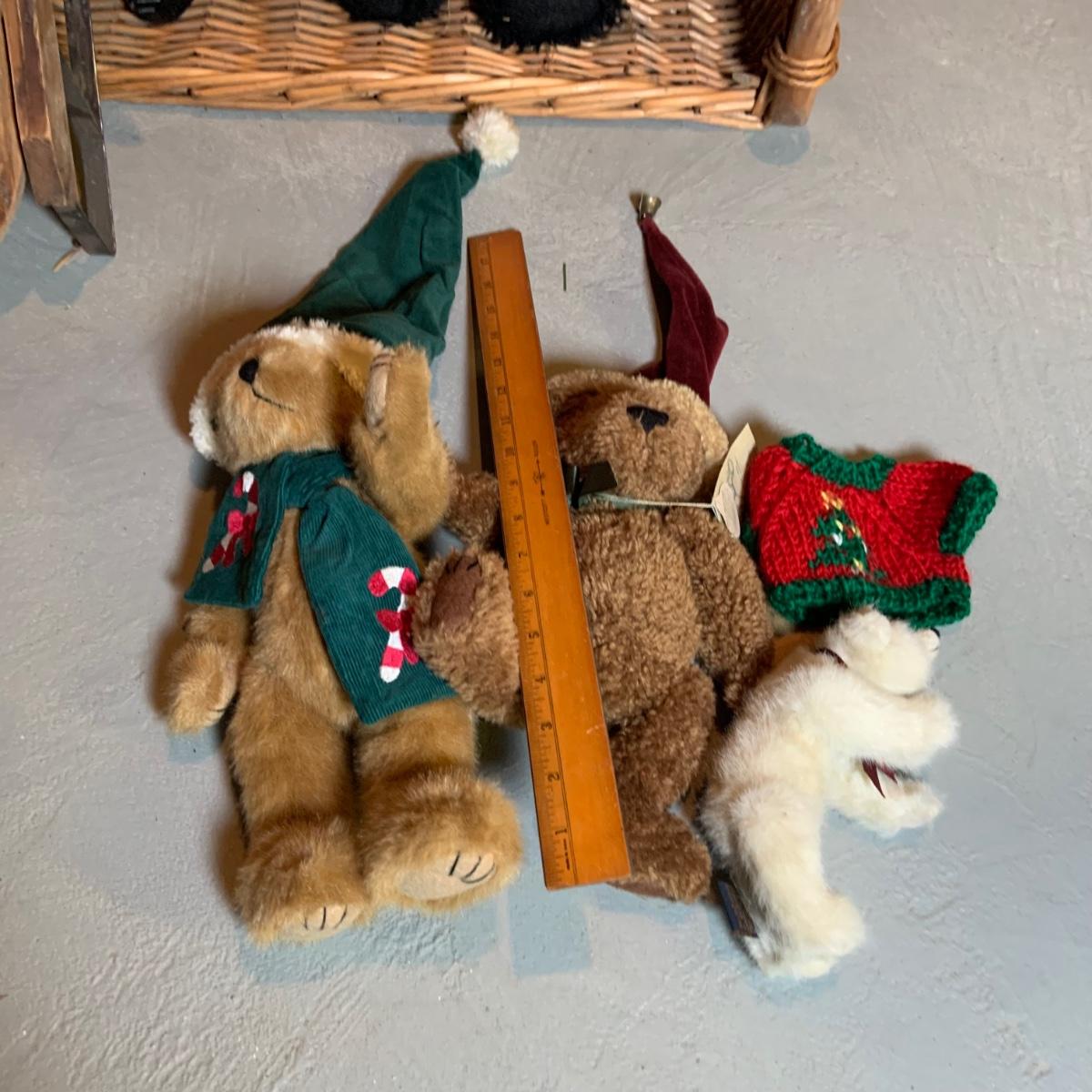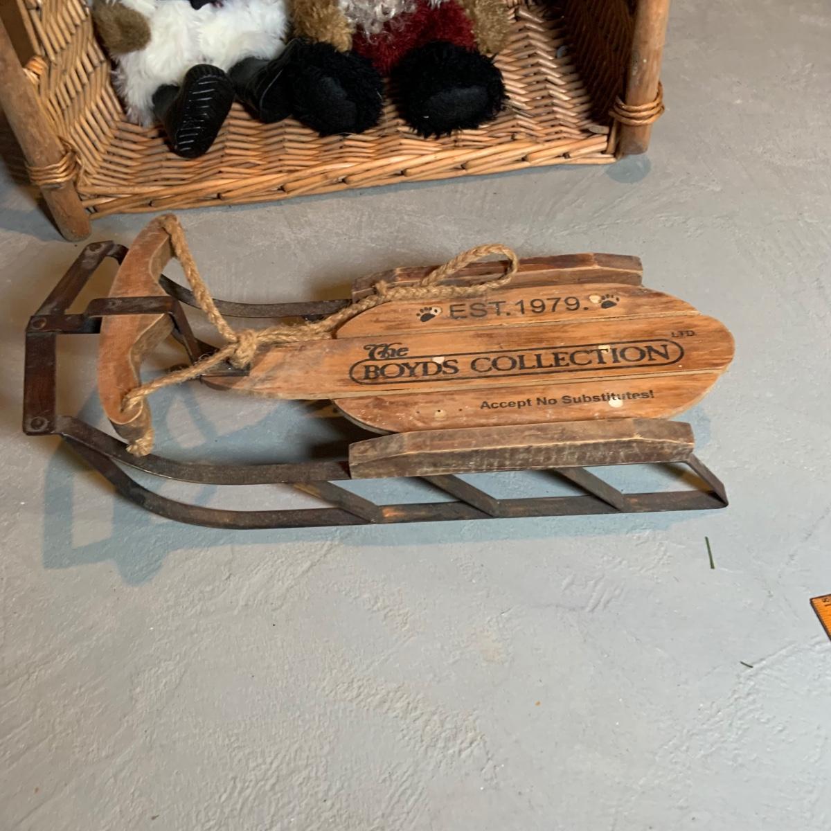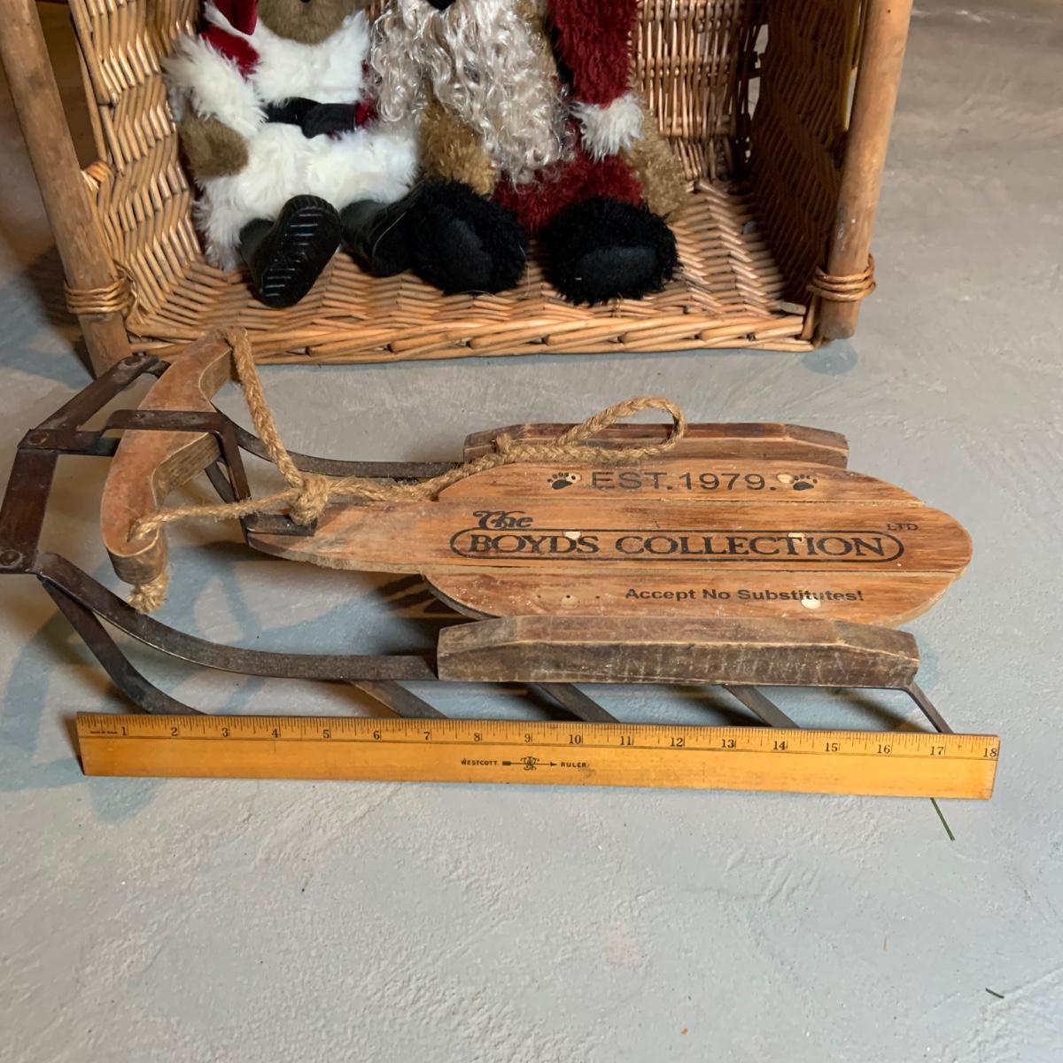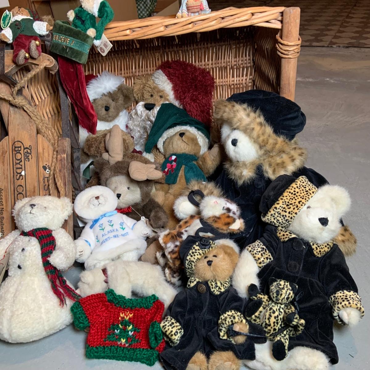 LOT:73: Basket Full of Holiday Boyds Bears, Bear-Sized Sled and More