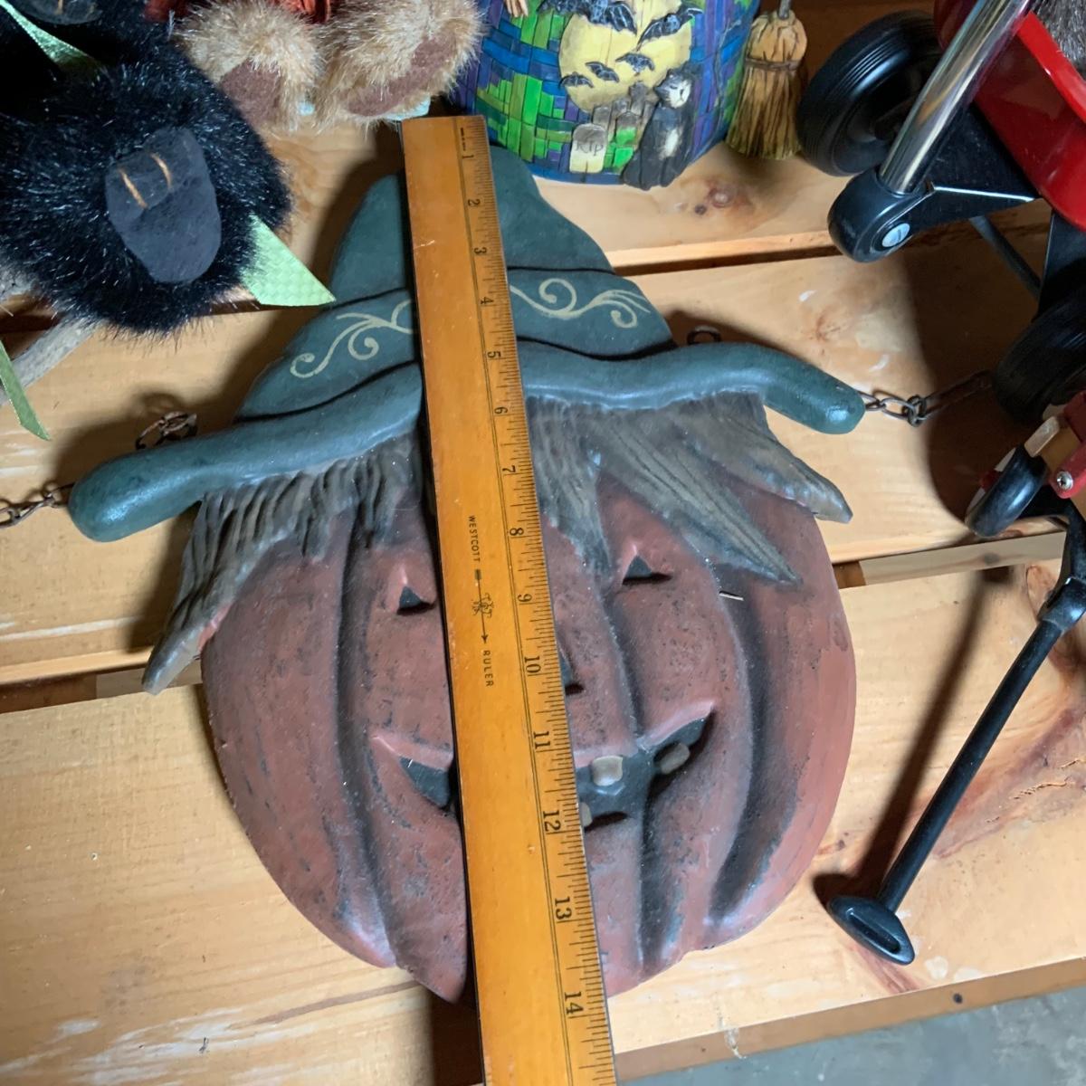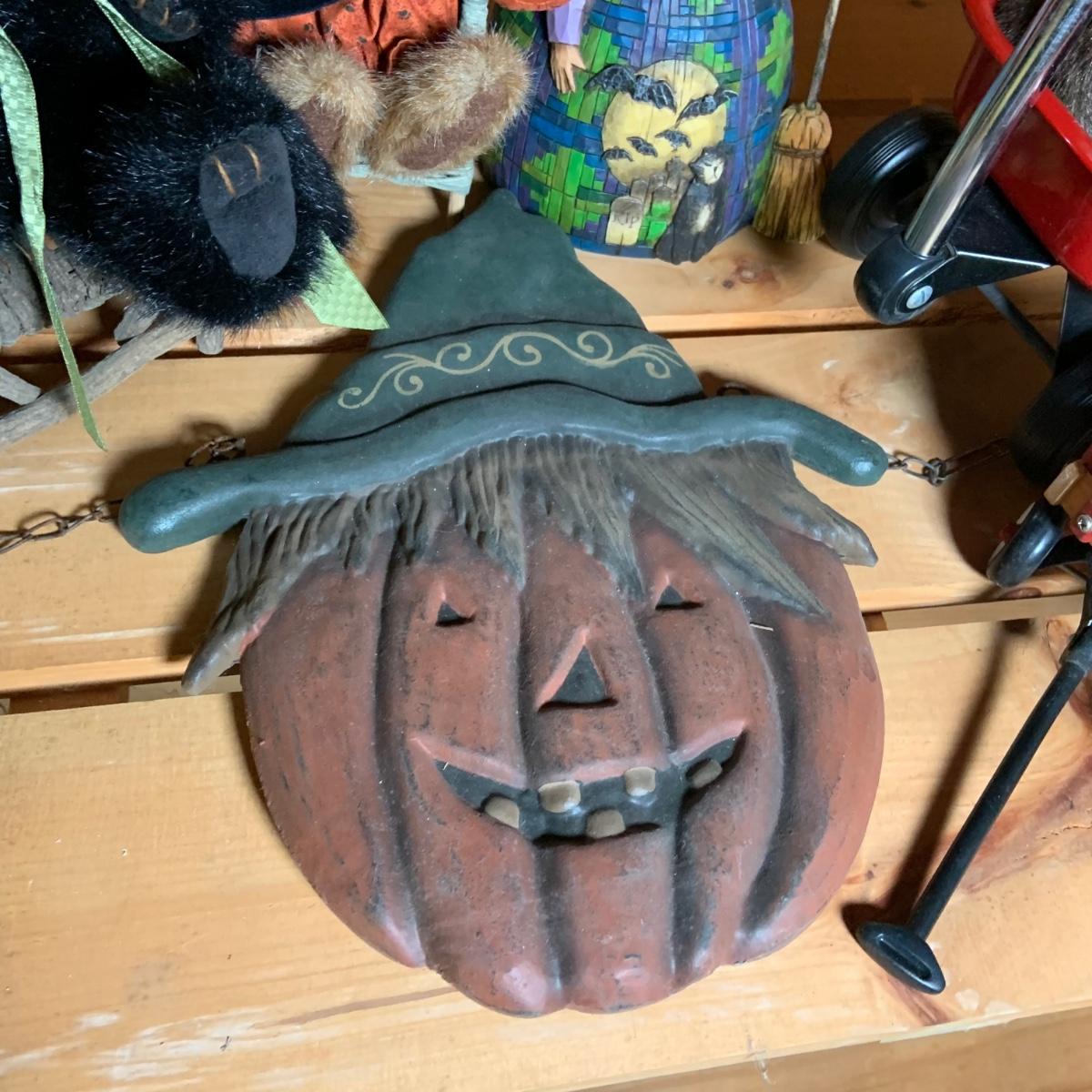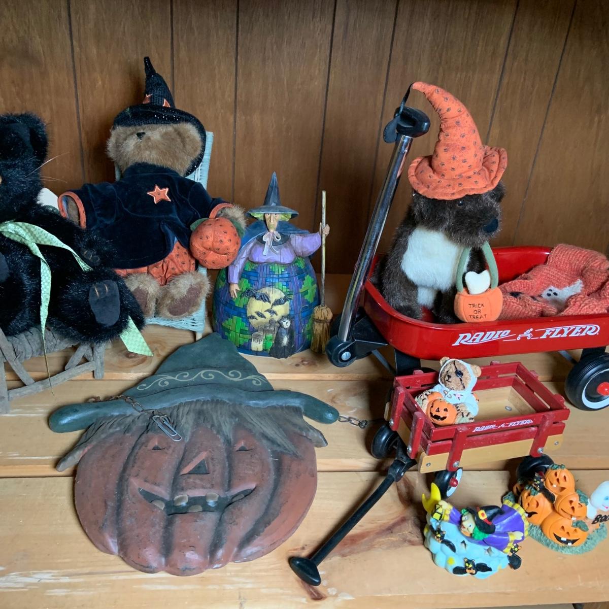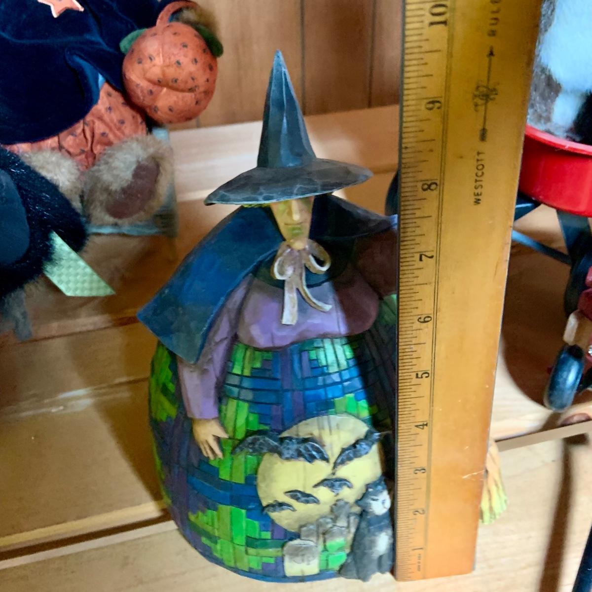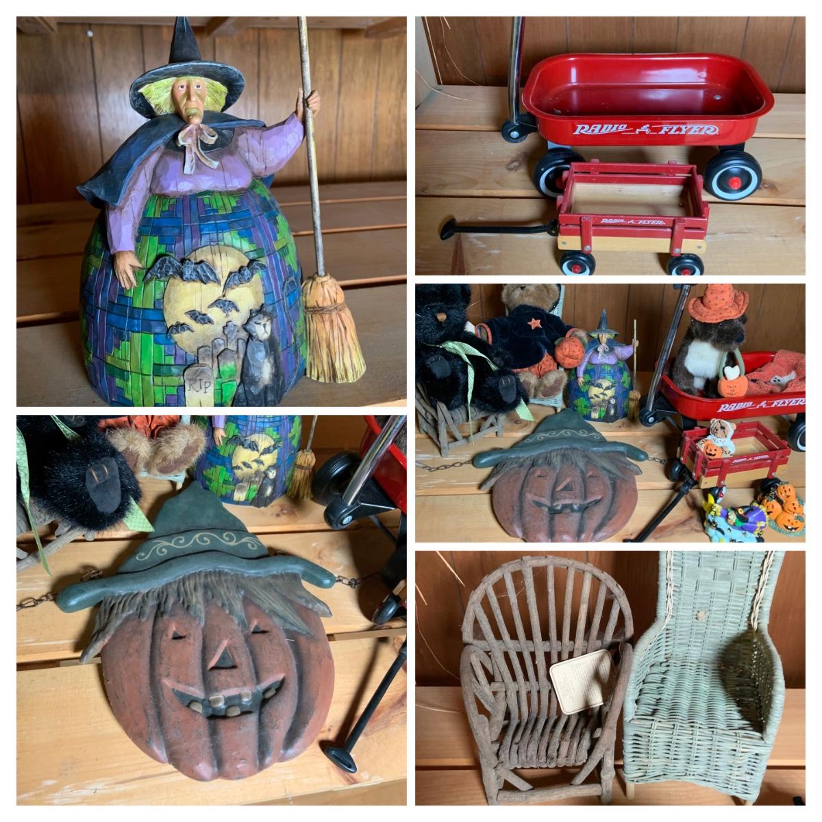 LOT:74: Jim Shore Heartwood Creek "Let the Magic Begin" Witch and Other Halloween Decor Including Boyds Bears, 2-Sided Jack-o-Lantern Sign, Toy Wagons and More