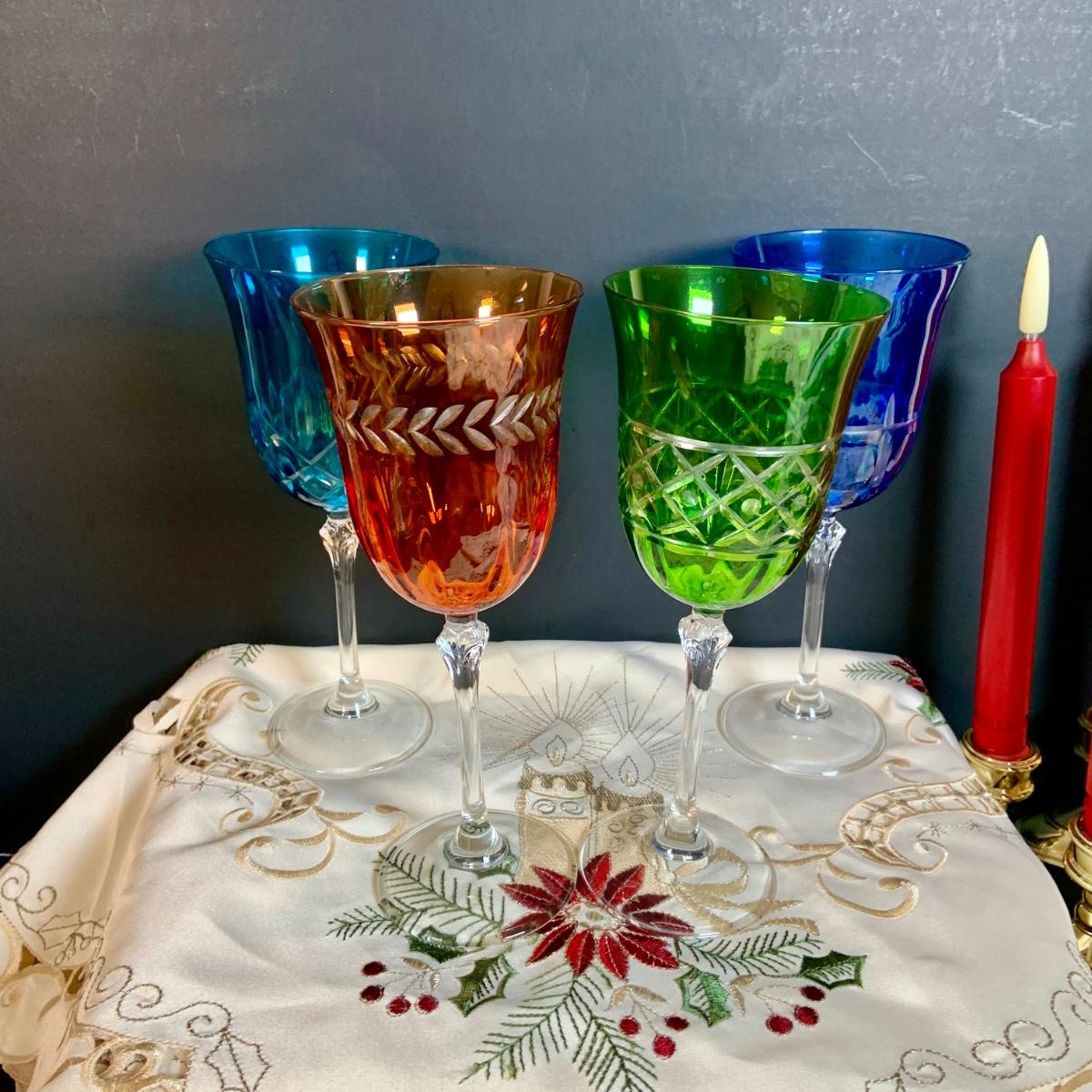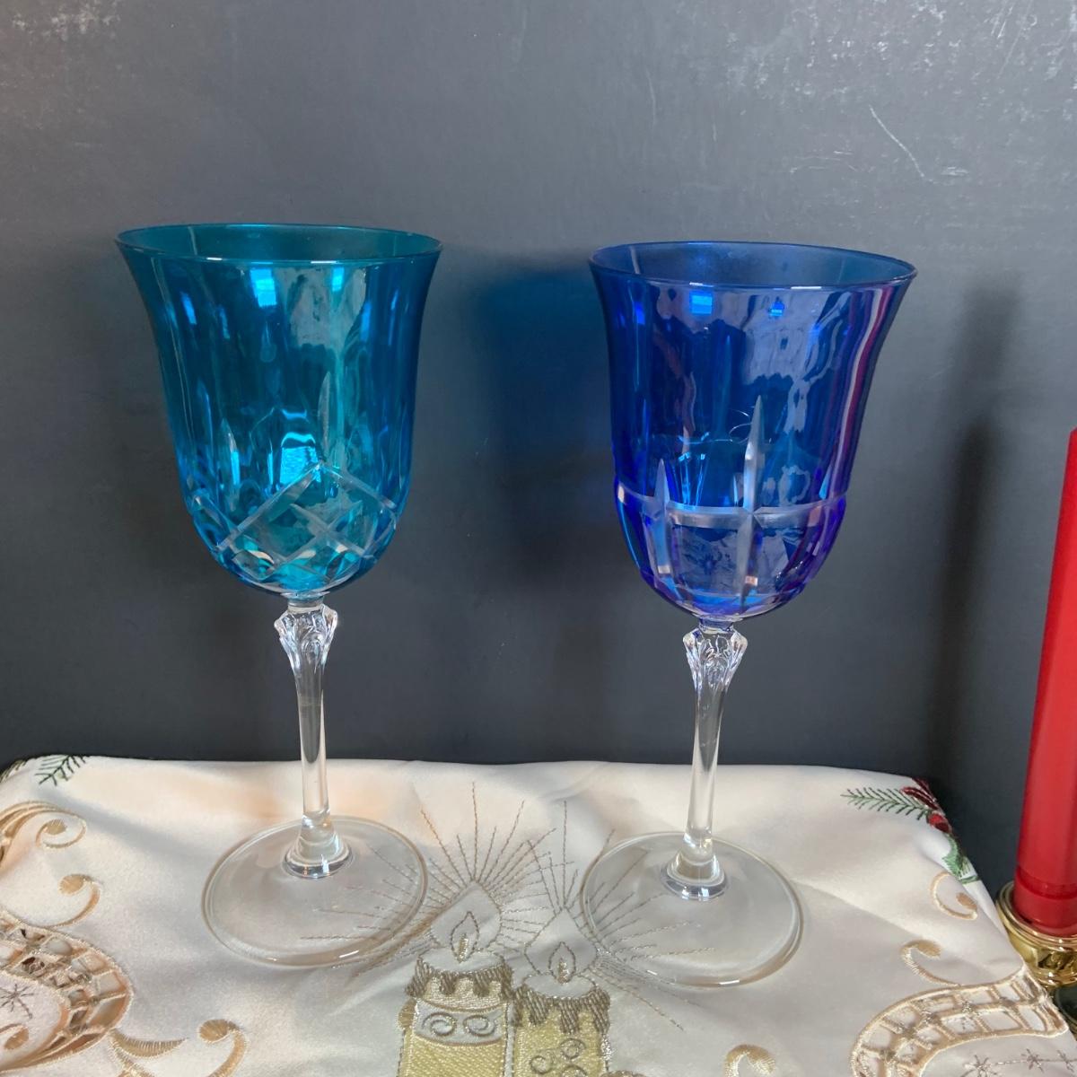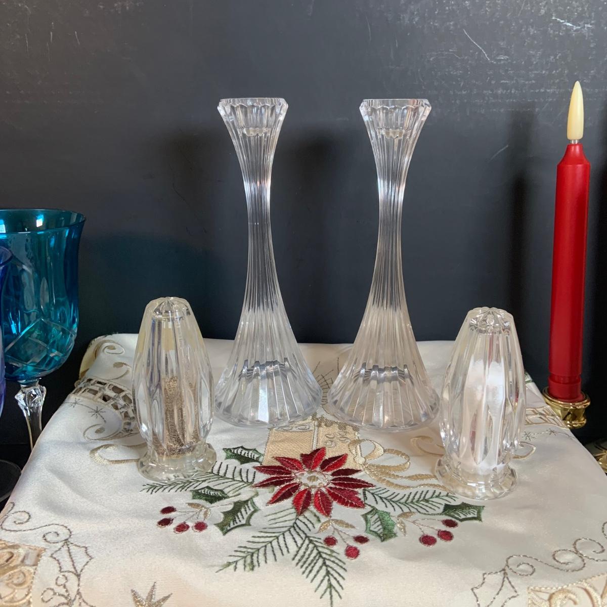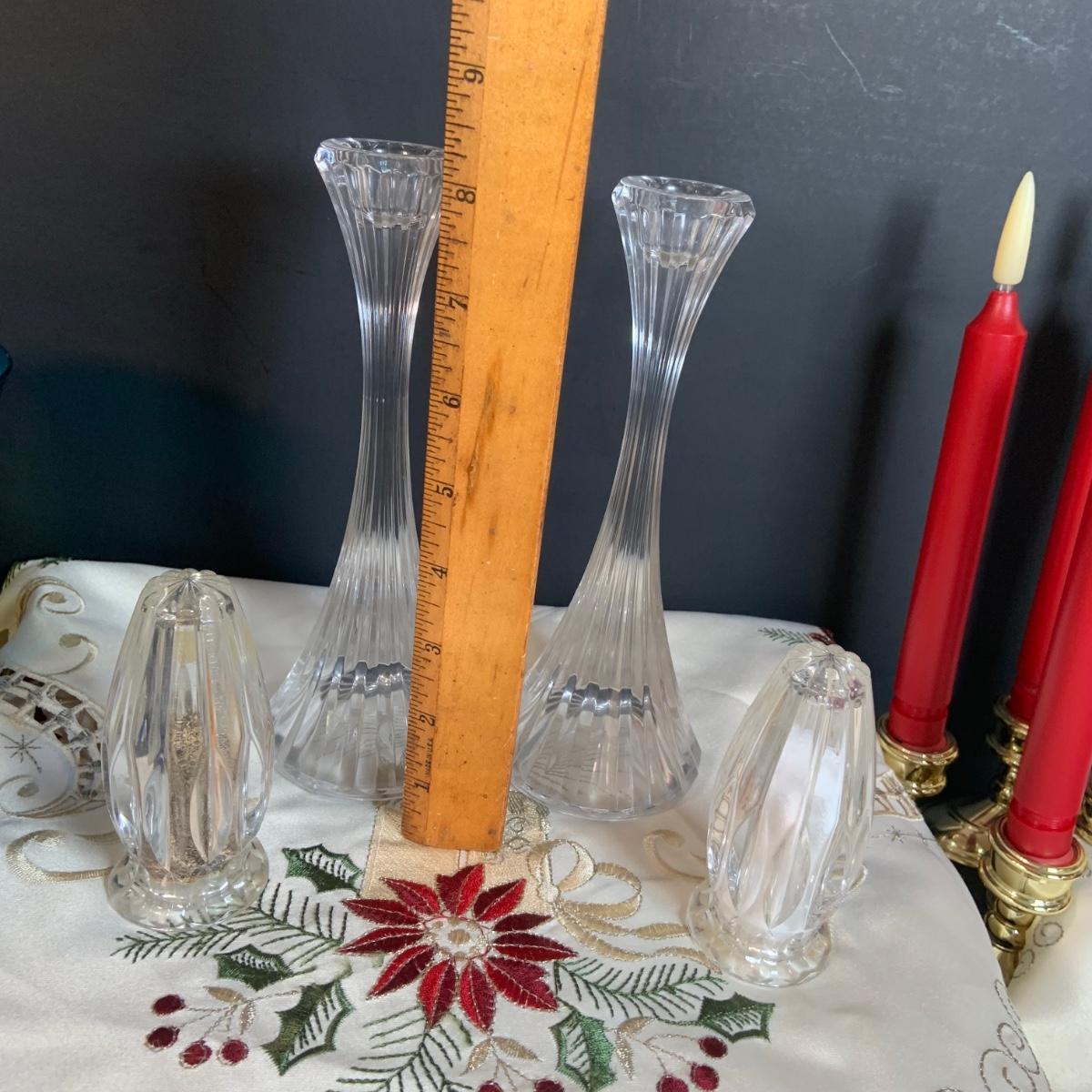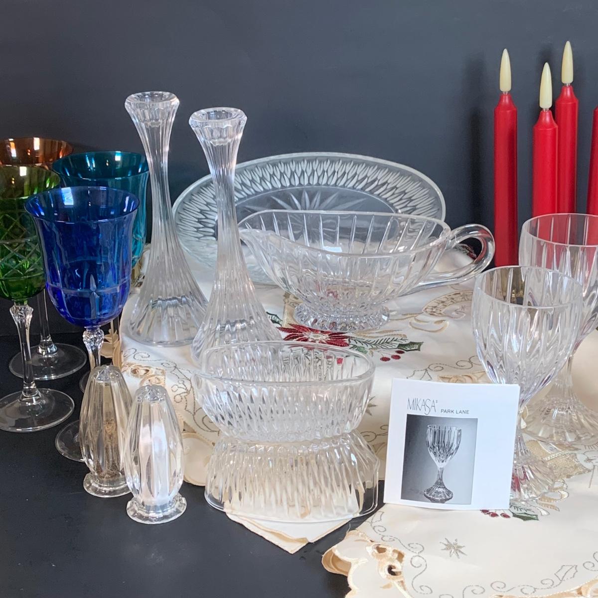 LOT:78: Mikasa Park Lane Crystal Glasses, Service Items Including Candle Holders, Salt and Pepper Shakers and More; Also Included are Colored Cut Crystal Goblets, Vintage Flamless Candles and More