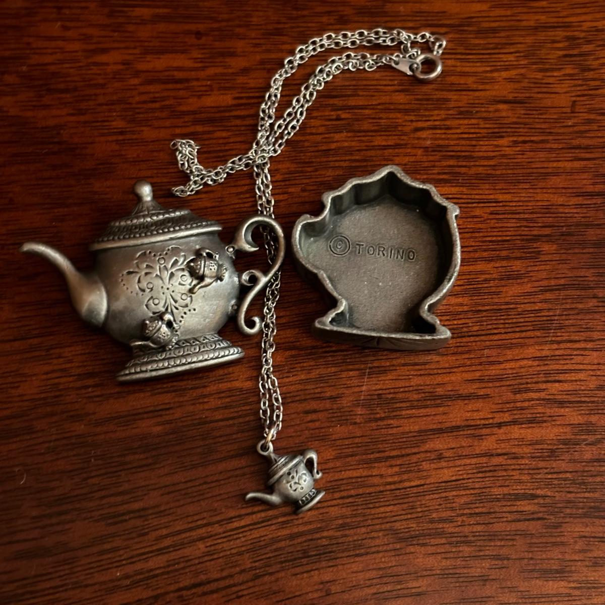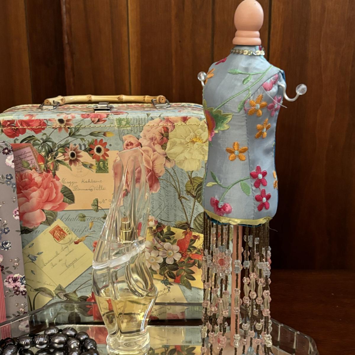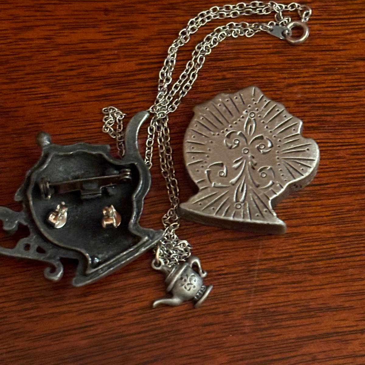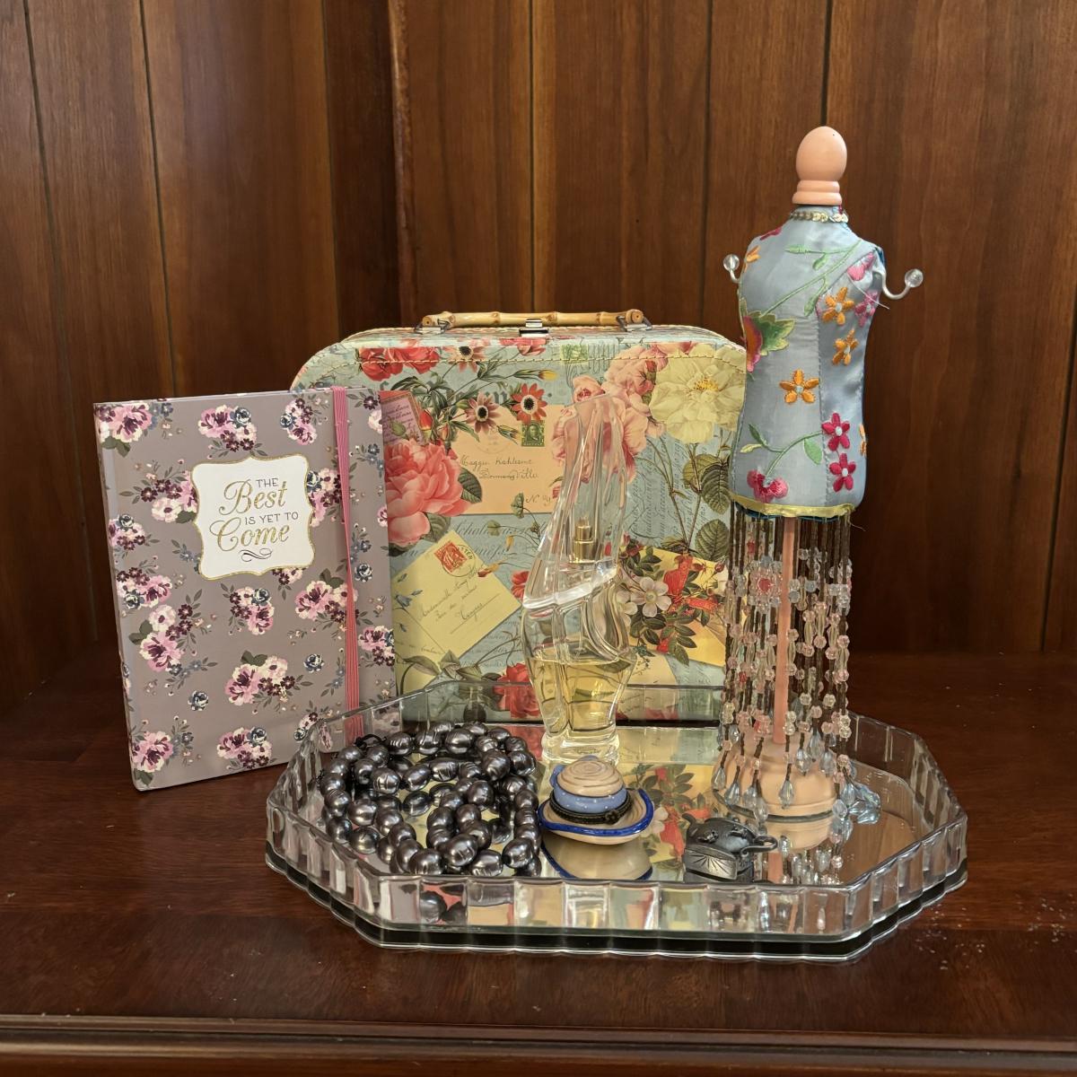 LOT 82: Ladies Dresser Collection: Donna Karan Perfume, Chico's Beaded Necklace, Trinket Box, Torino Teapot Pewter Brooch Pin Necklace Earring Jewelry Trinket Box Set Mirrored Tray & More