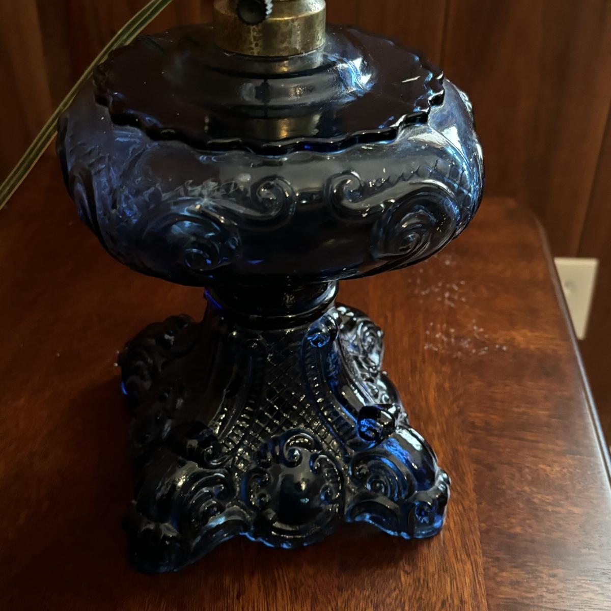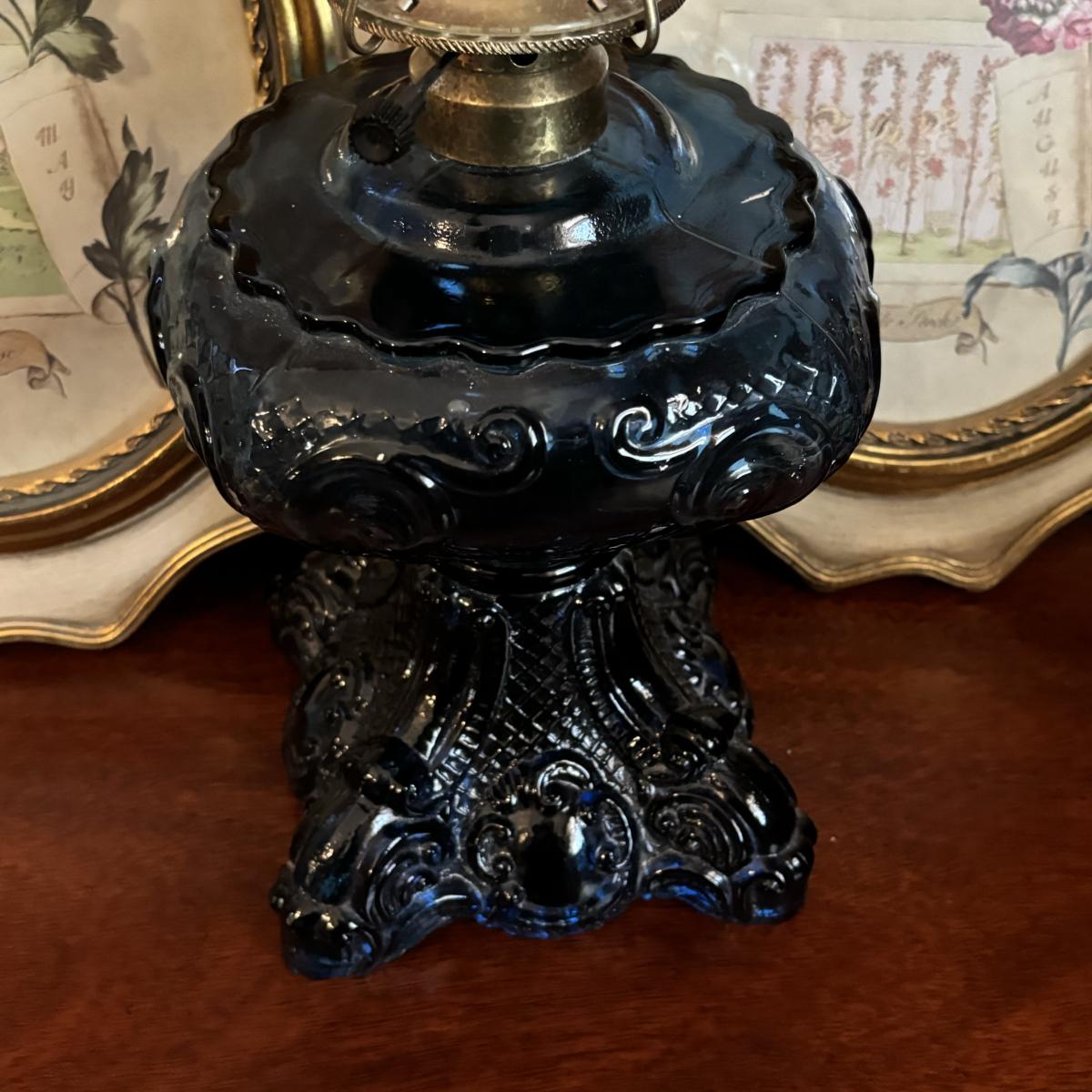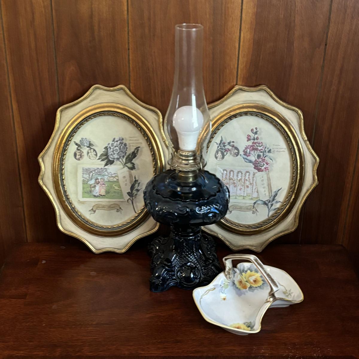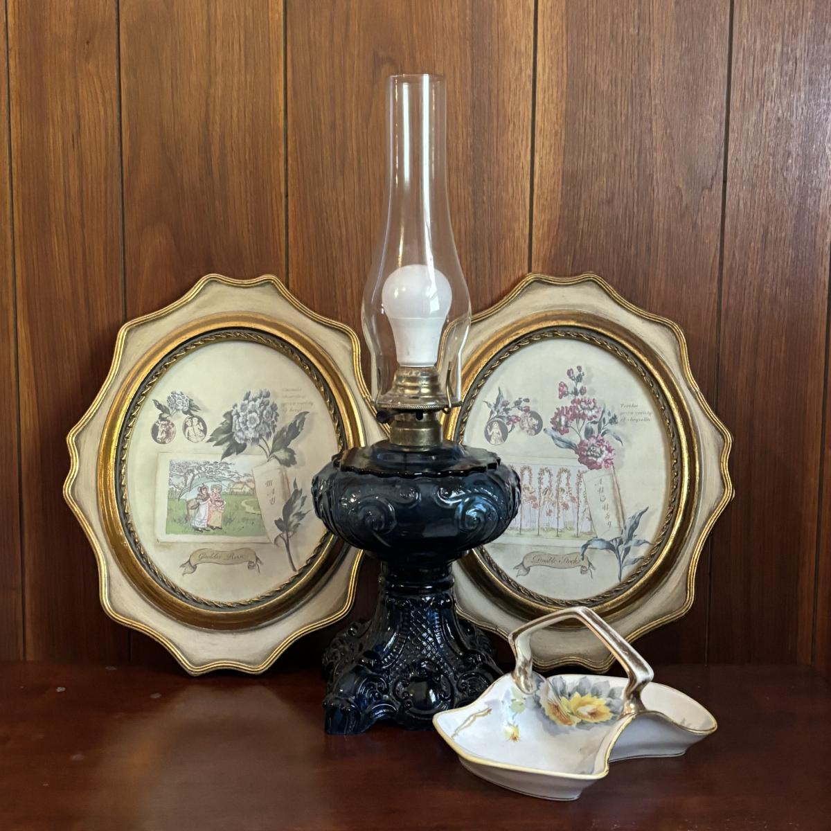 LOT 86: Blue Oil Lamp Style Lamp, Oval Prints Floral of the Month August & May, Nippon Tray/Dish