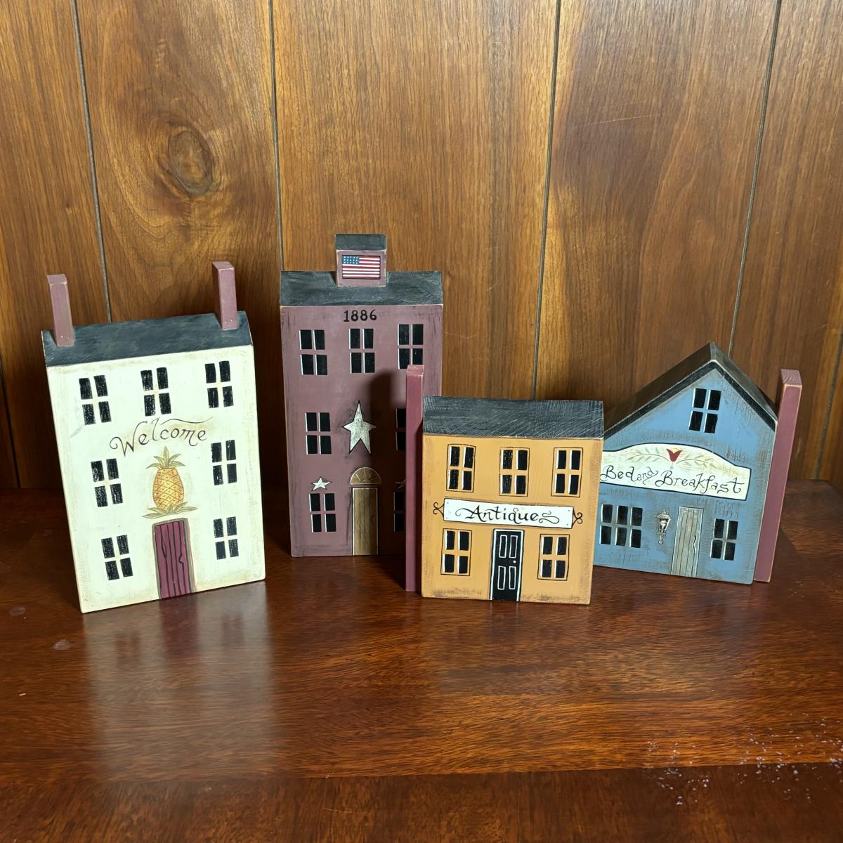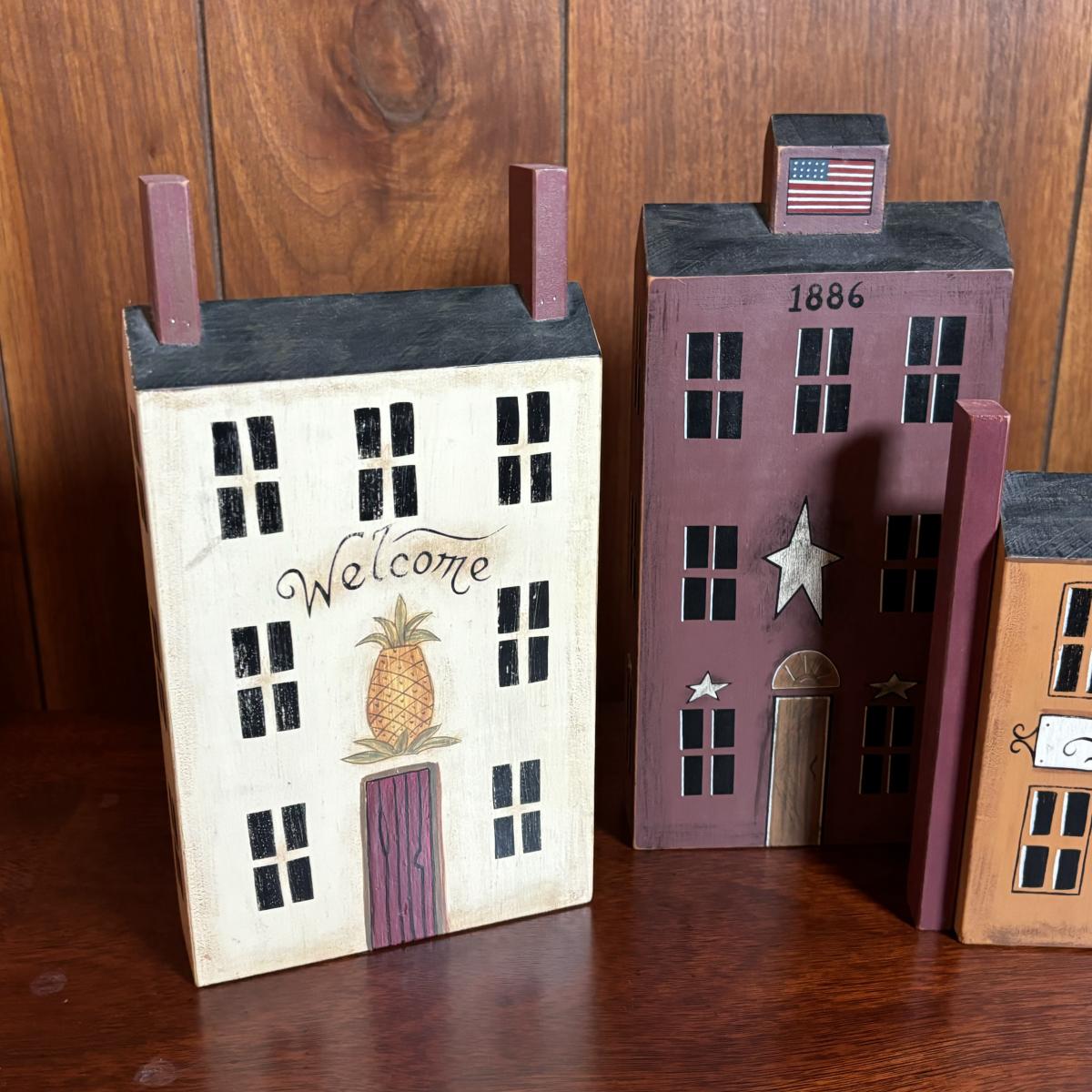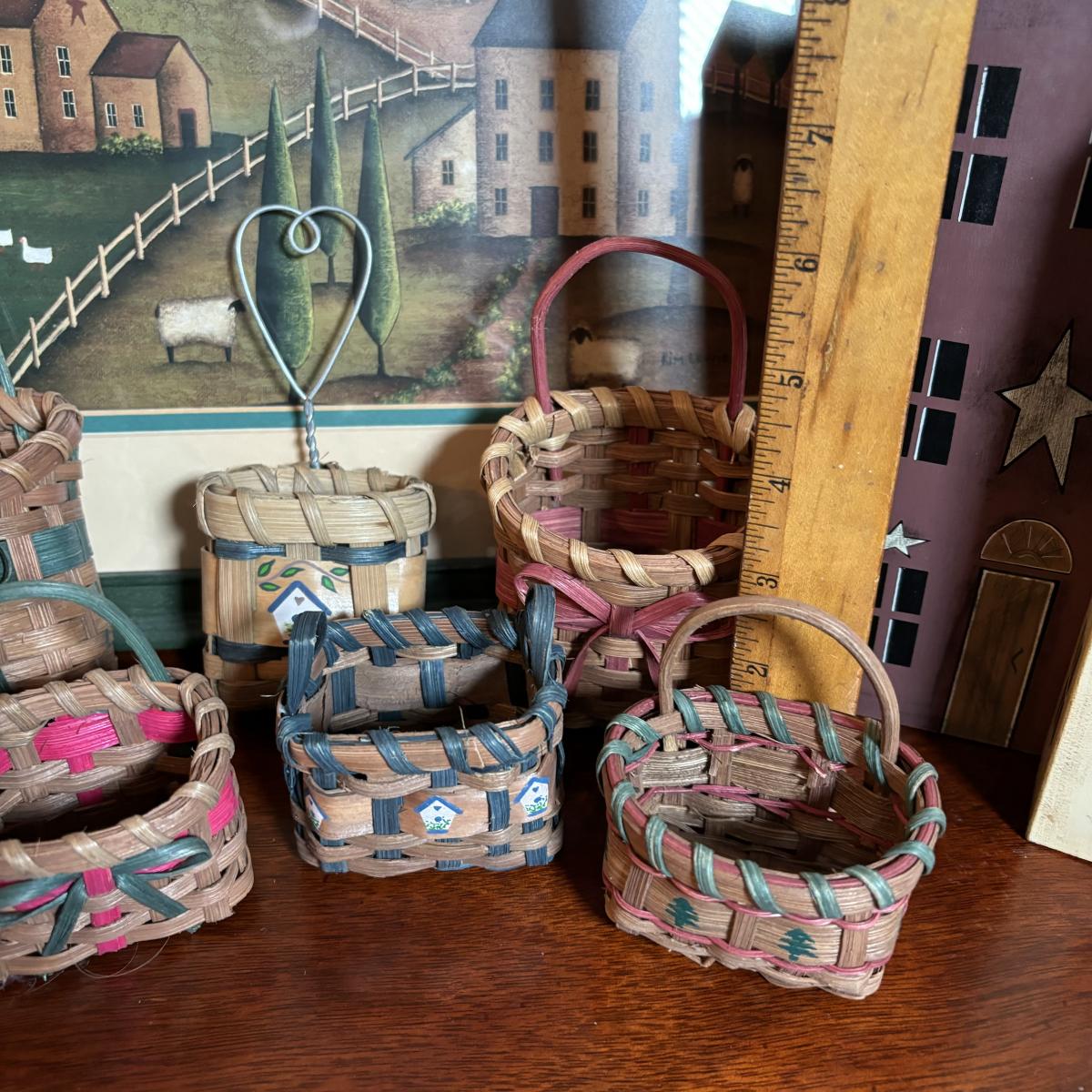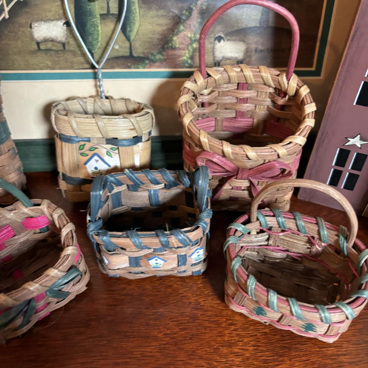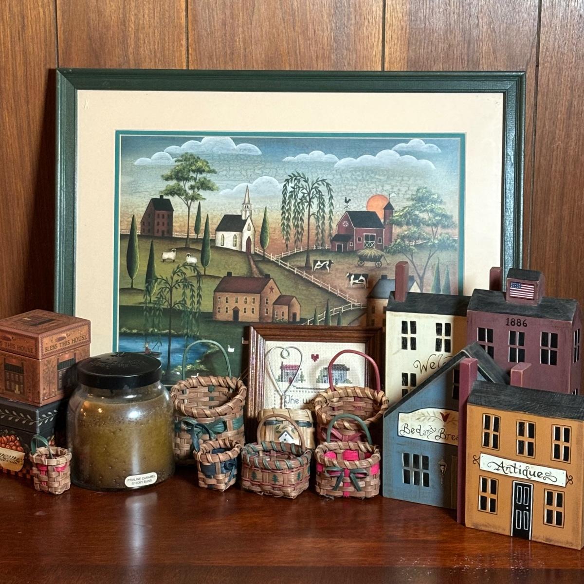 LOT 96: Folk Art Primitive Home Decor: Bob Huffman Wooden Buildings, Kim Lewis Print, Miniature Baskets & More
