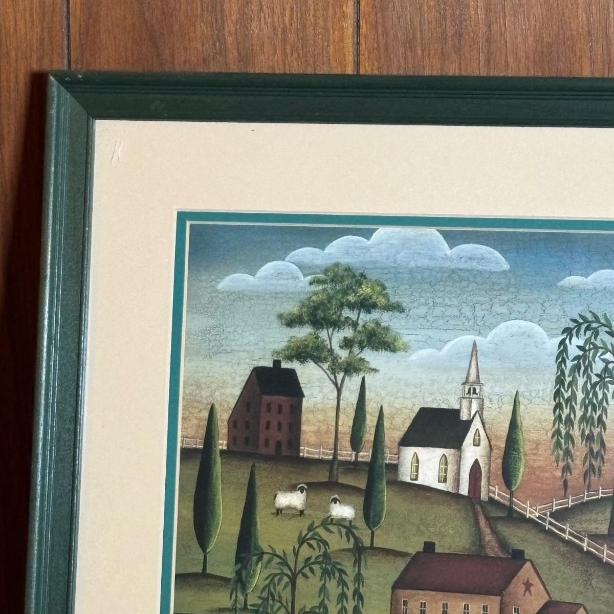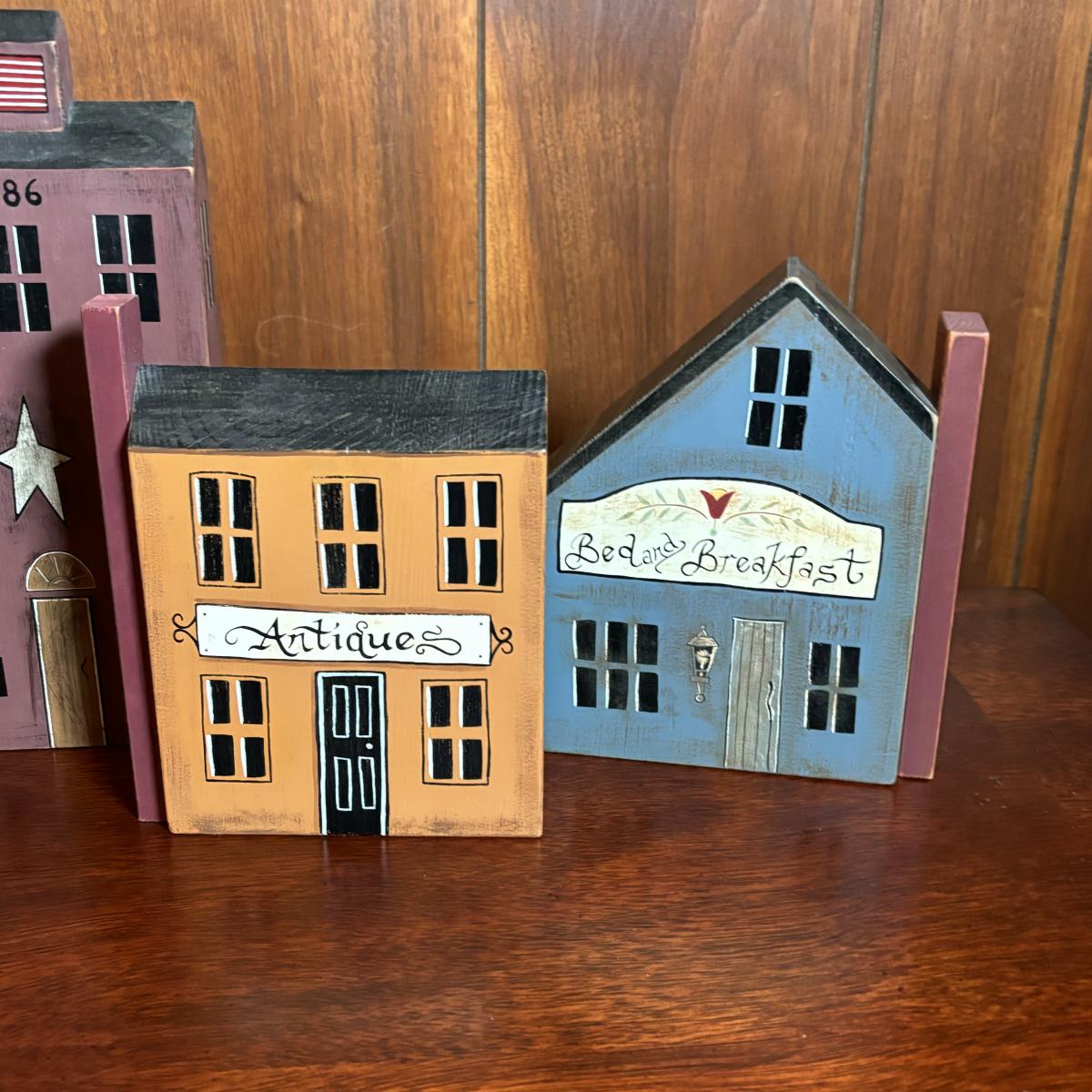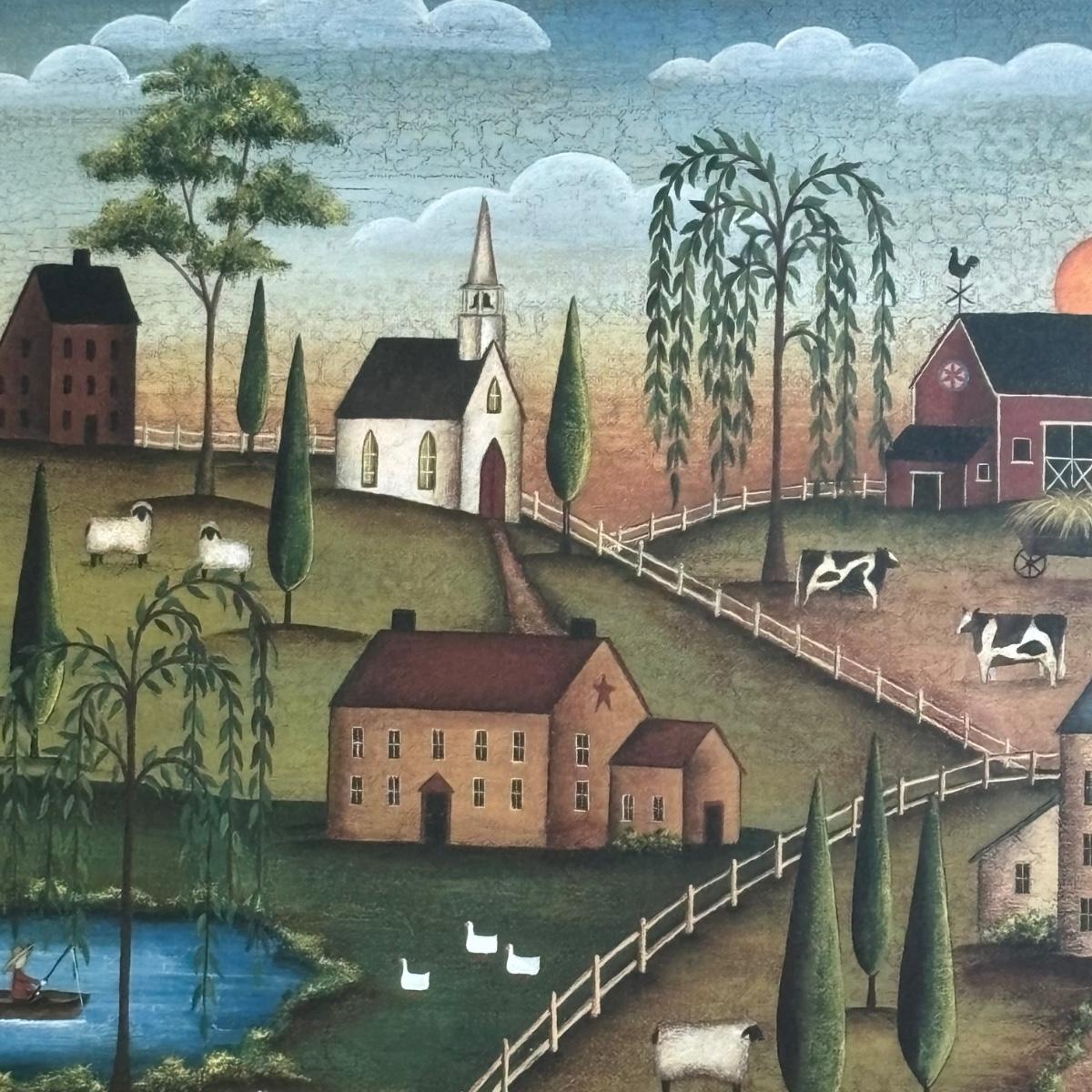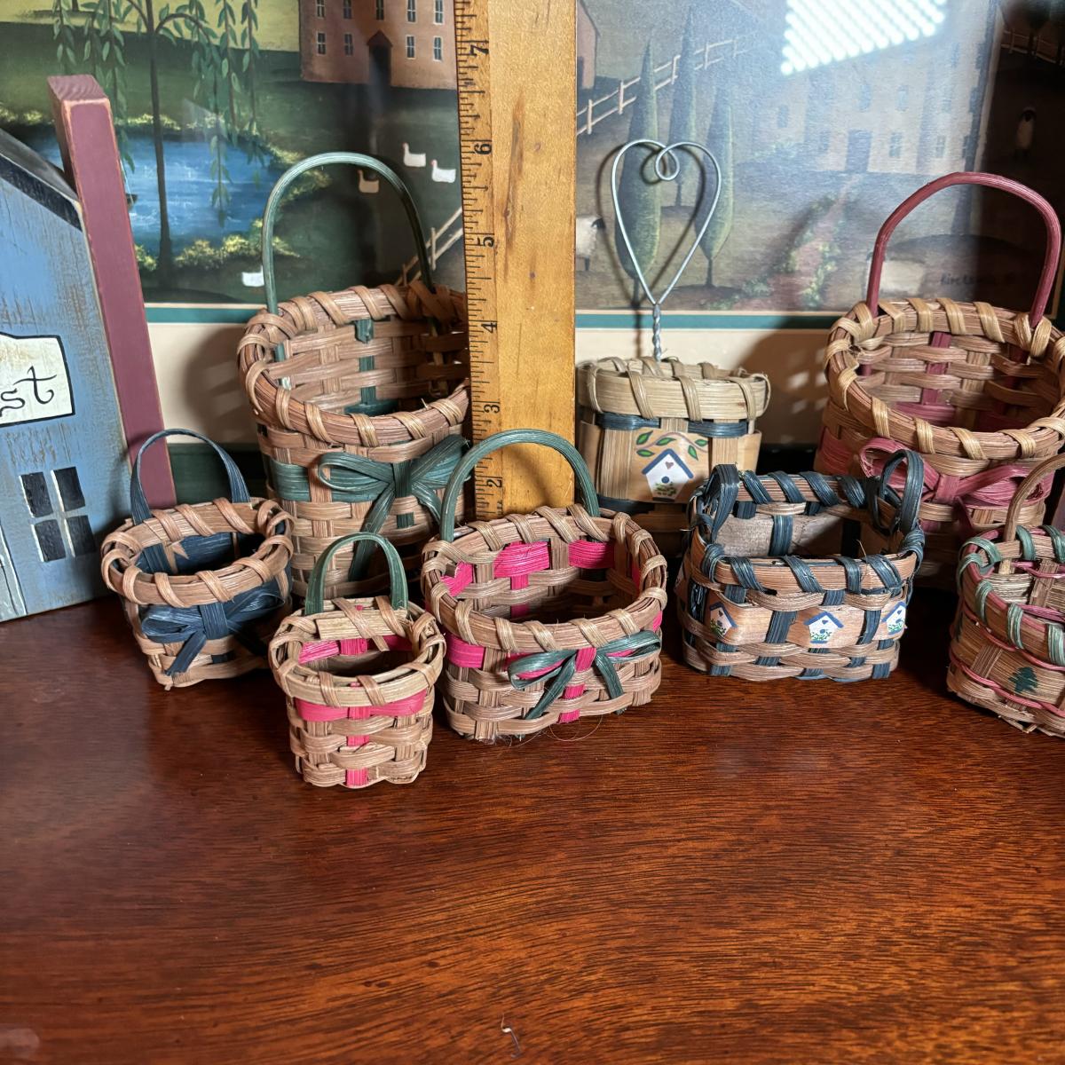 LOT 96: Folk Art Primitive Home Decor: Bob Huffman Wooden Buildings, Kim Lewis Print, Miniature Baskets & More