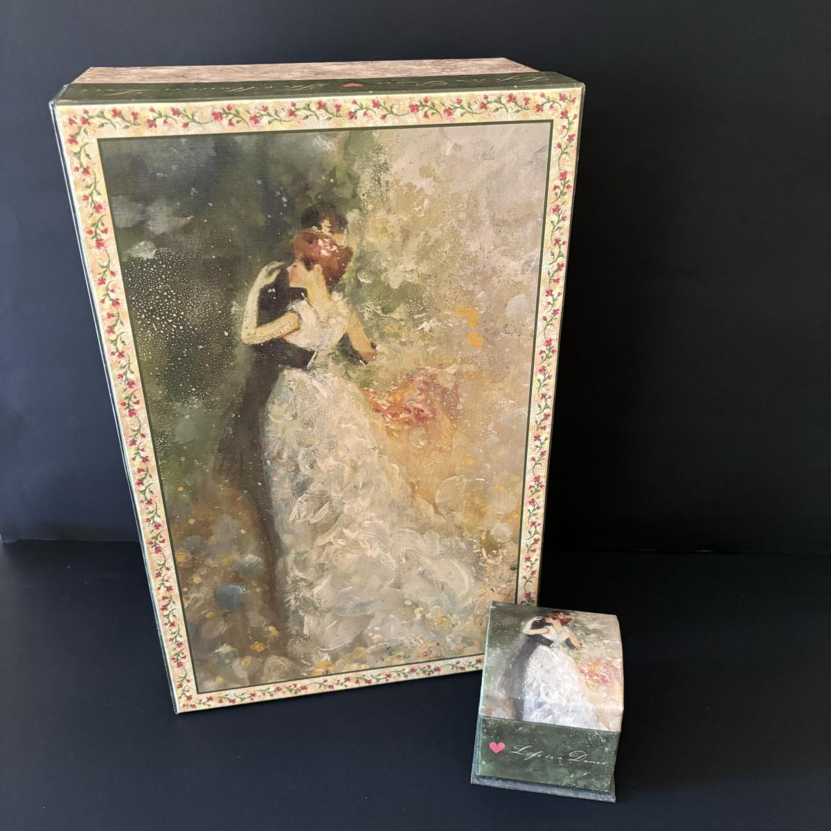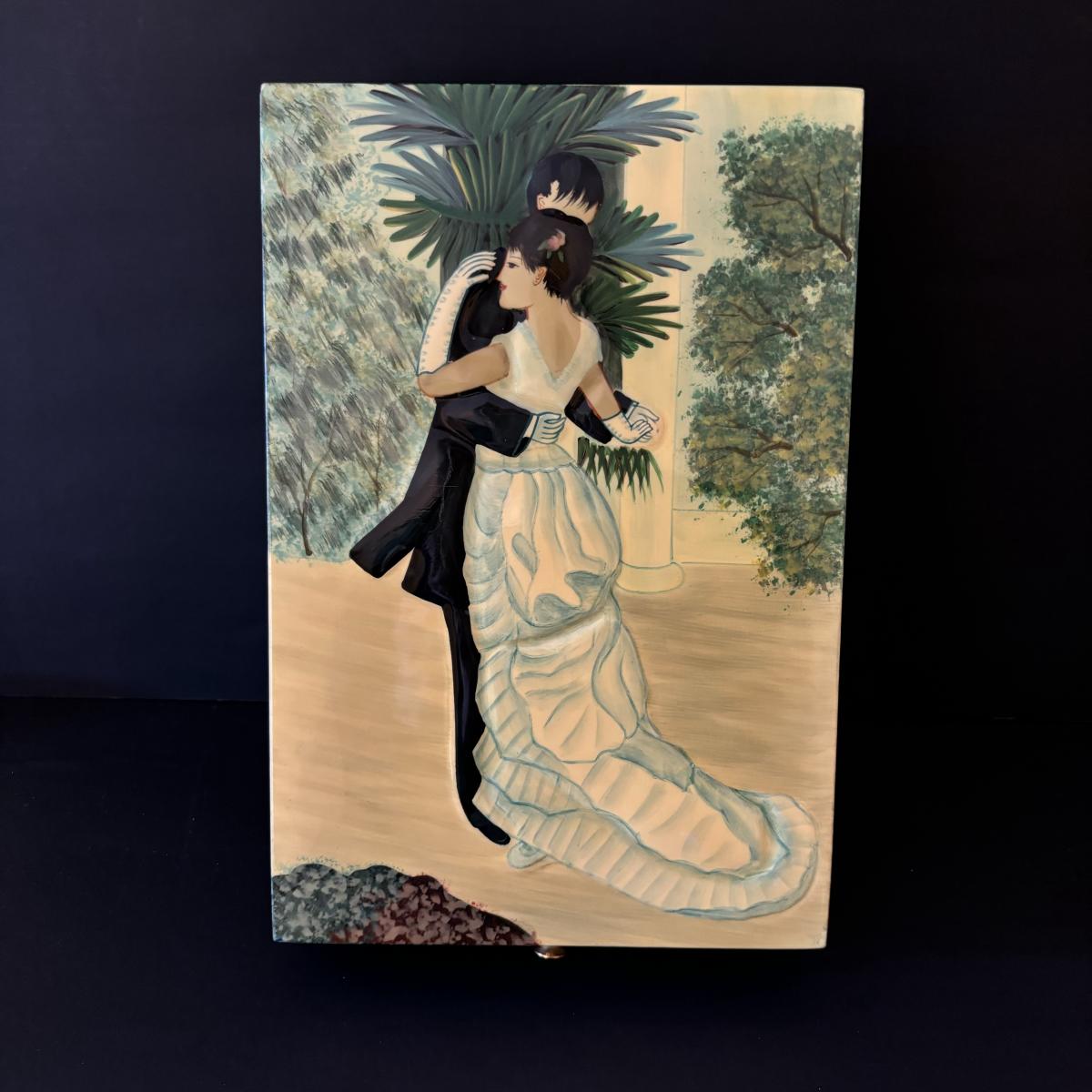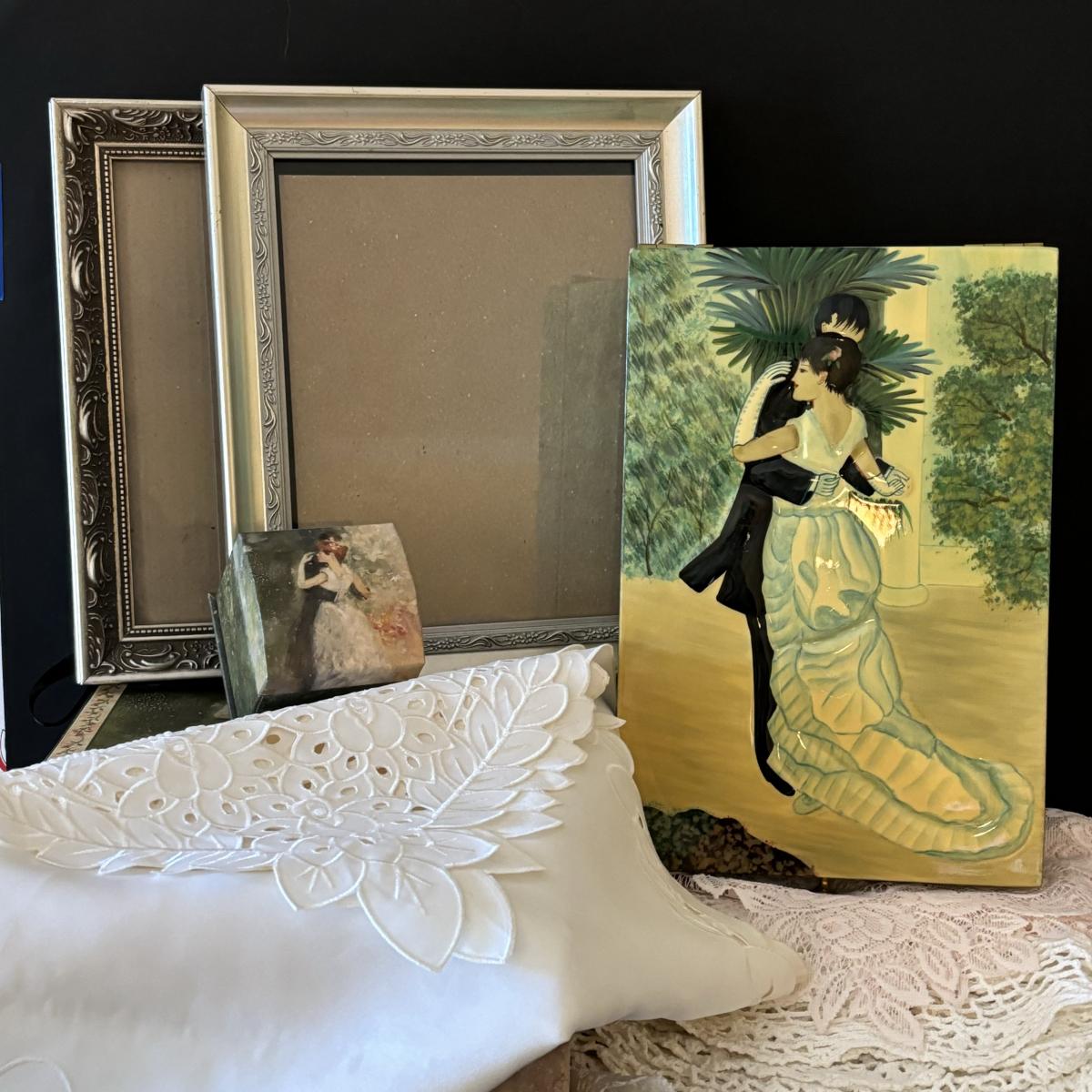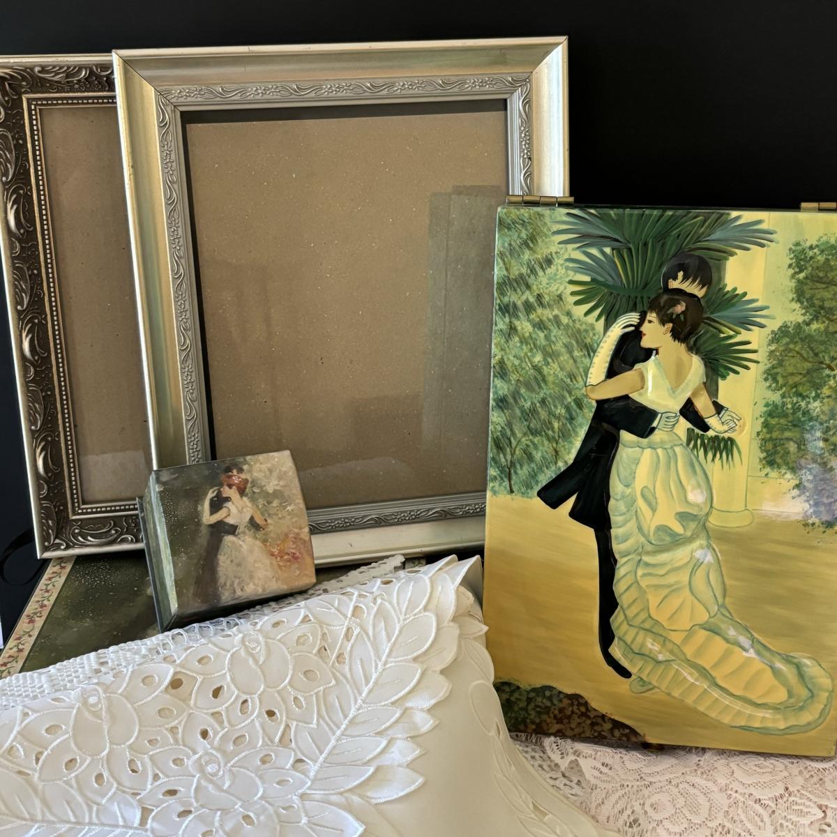 LOT 99: Beautiful Art Deco "Dance in the City 1883, Pierre Auguste Renoir" Jewelry Box, Lace/Linens, Matching Storage Boxes, Picture Frames