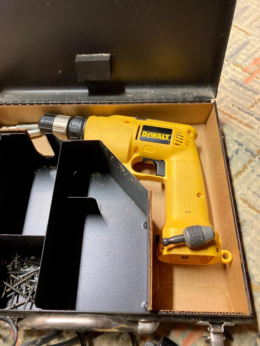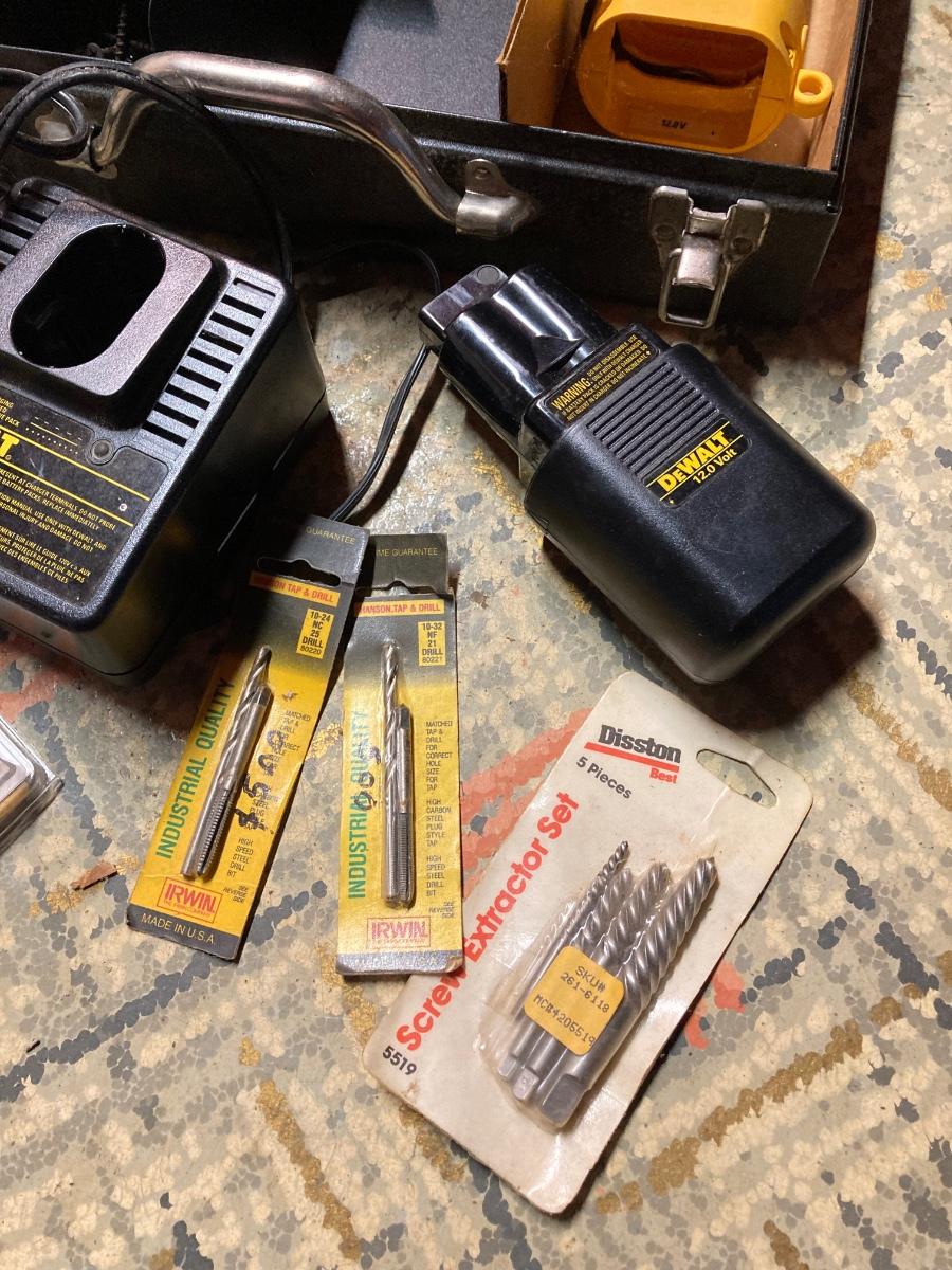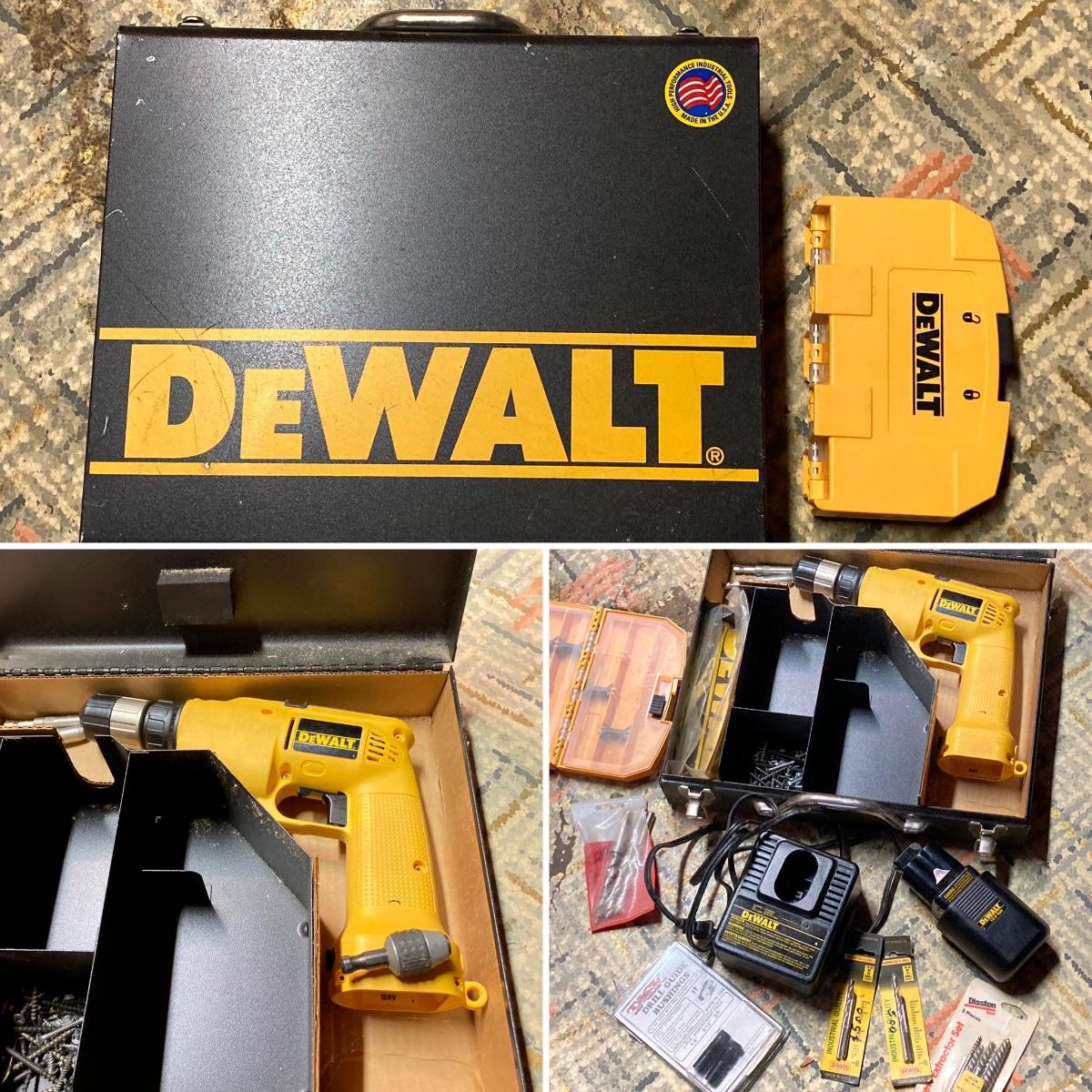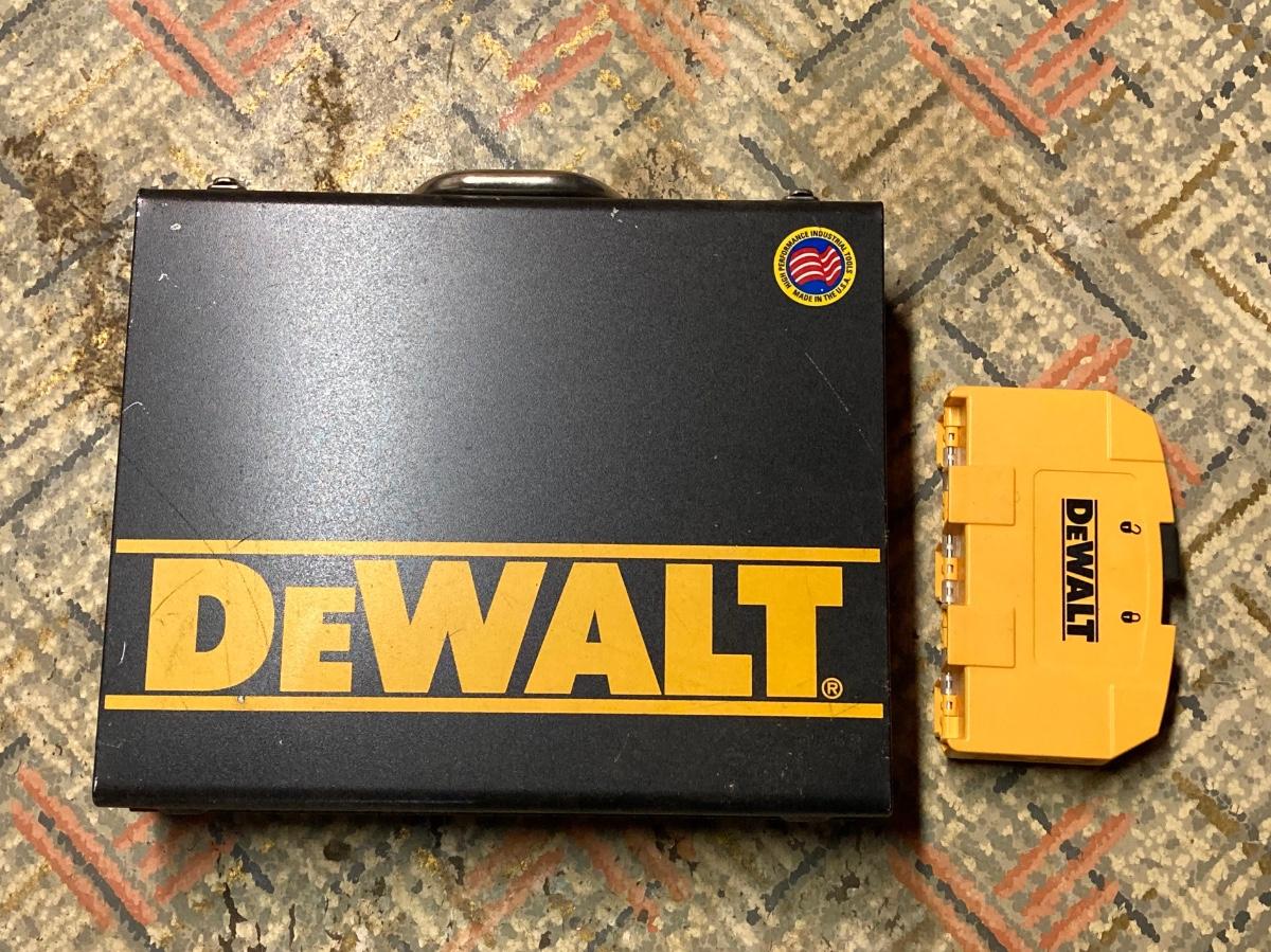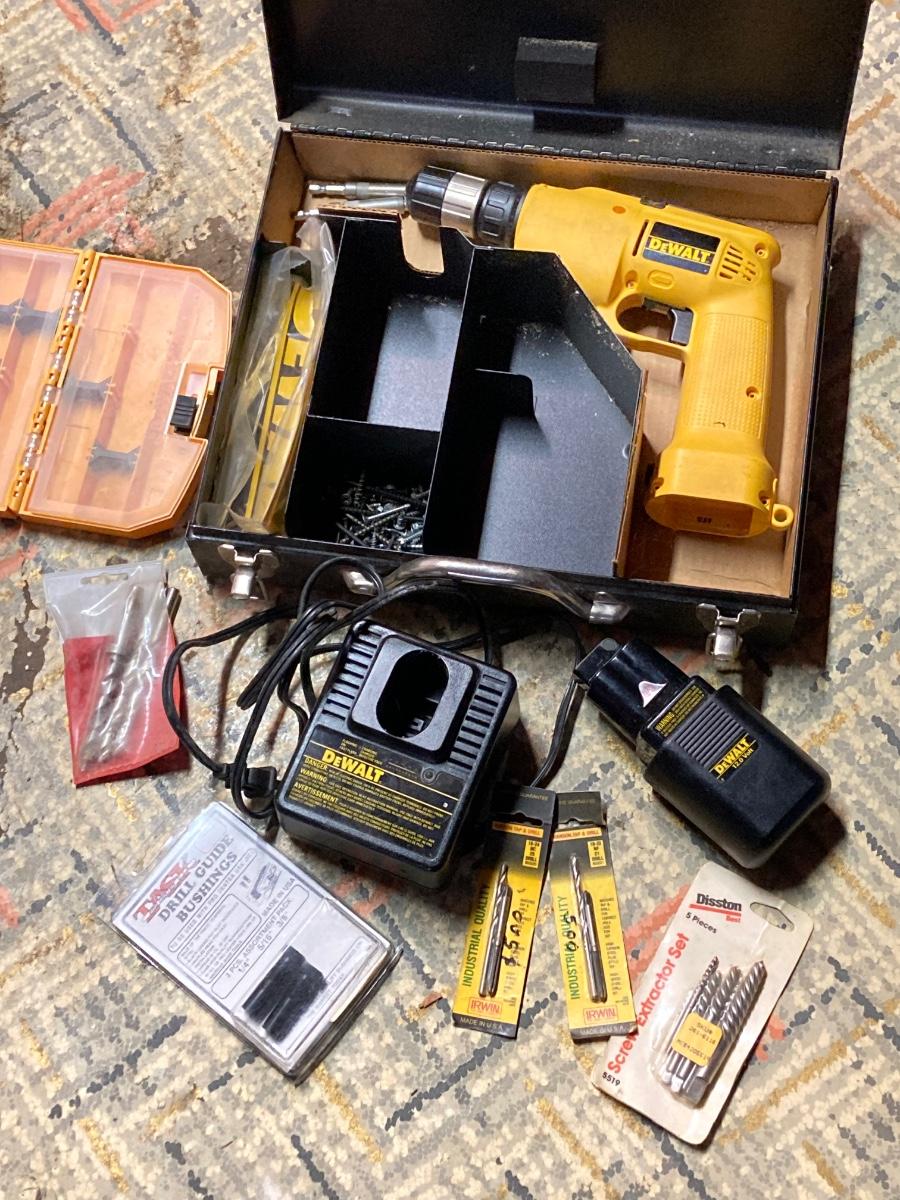 LOT 113: Dewalt Cordless Drill and Case, Battery Charger, Battery, Drill Bit Case and More