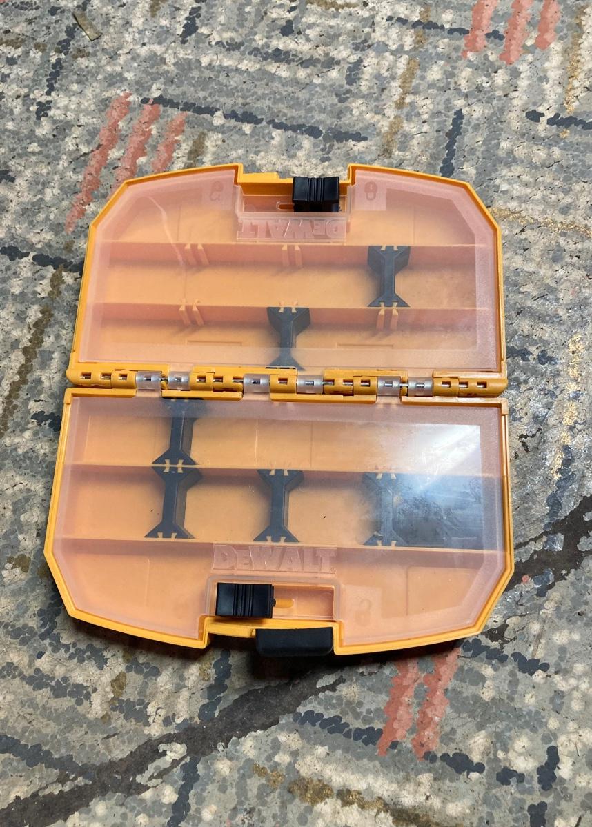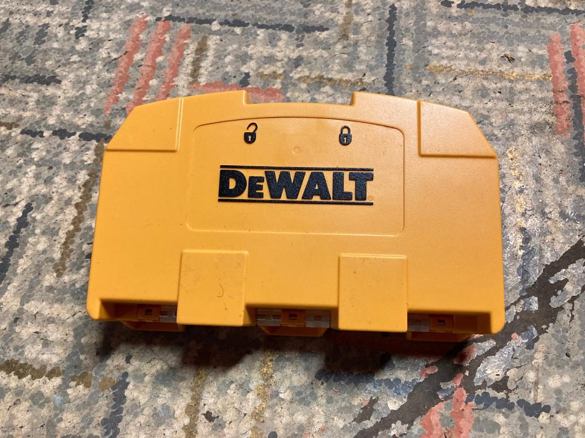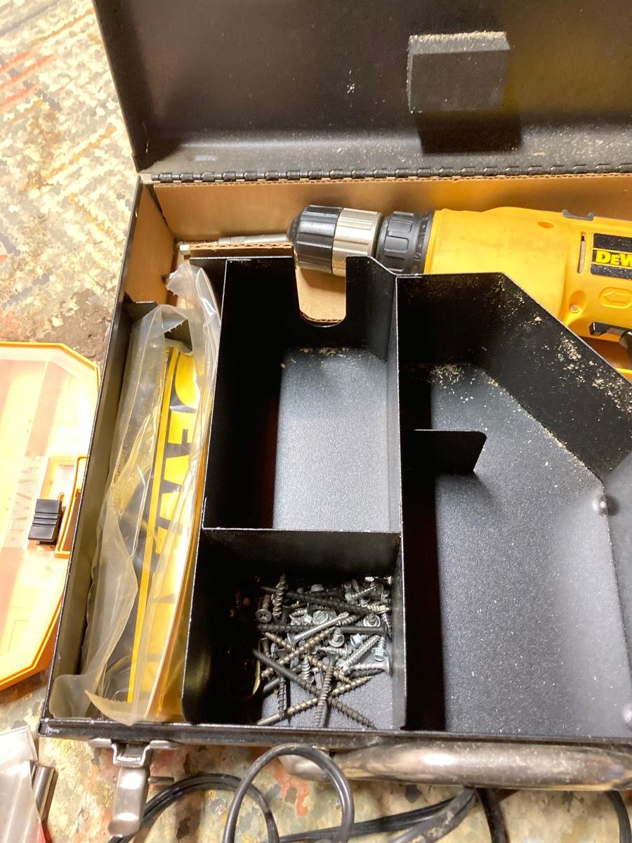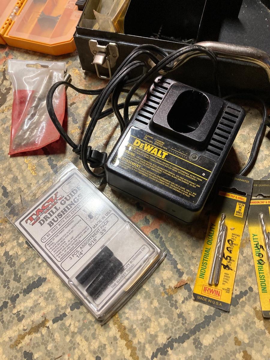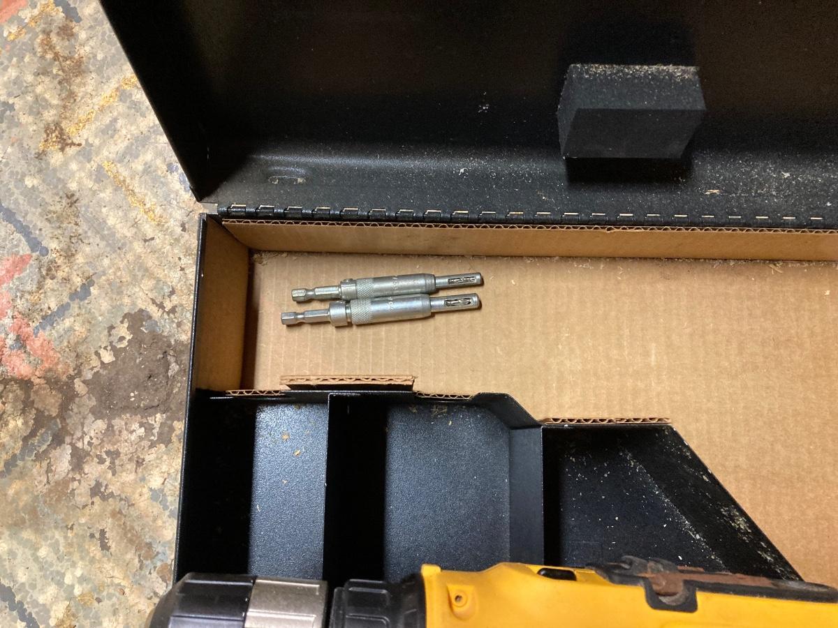 LOT 113: Dewalt Cordless Drill and Case, Battery Charger, Battery, Drill Bit Case and More