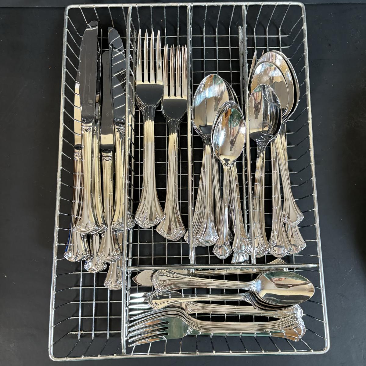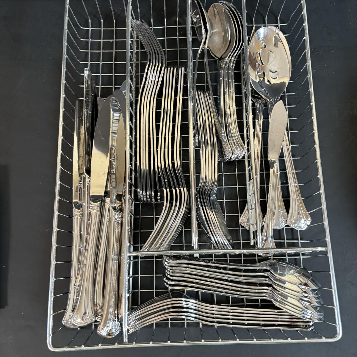 Flatware includes: 8 knives, 12 dinner forks, 6 small forks, 8 teaspoons, 12 soup spoons, 4 serving pieces
