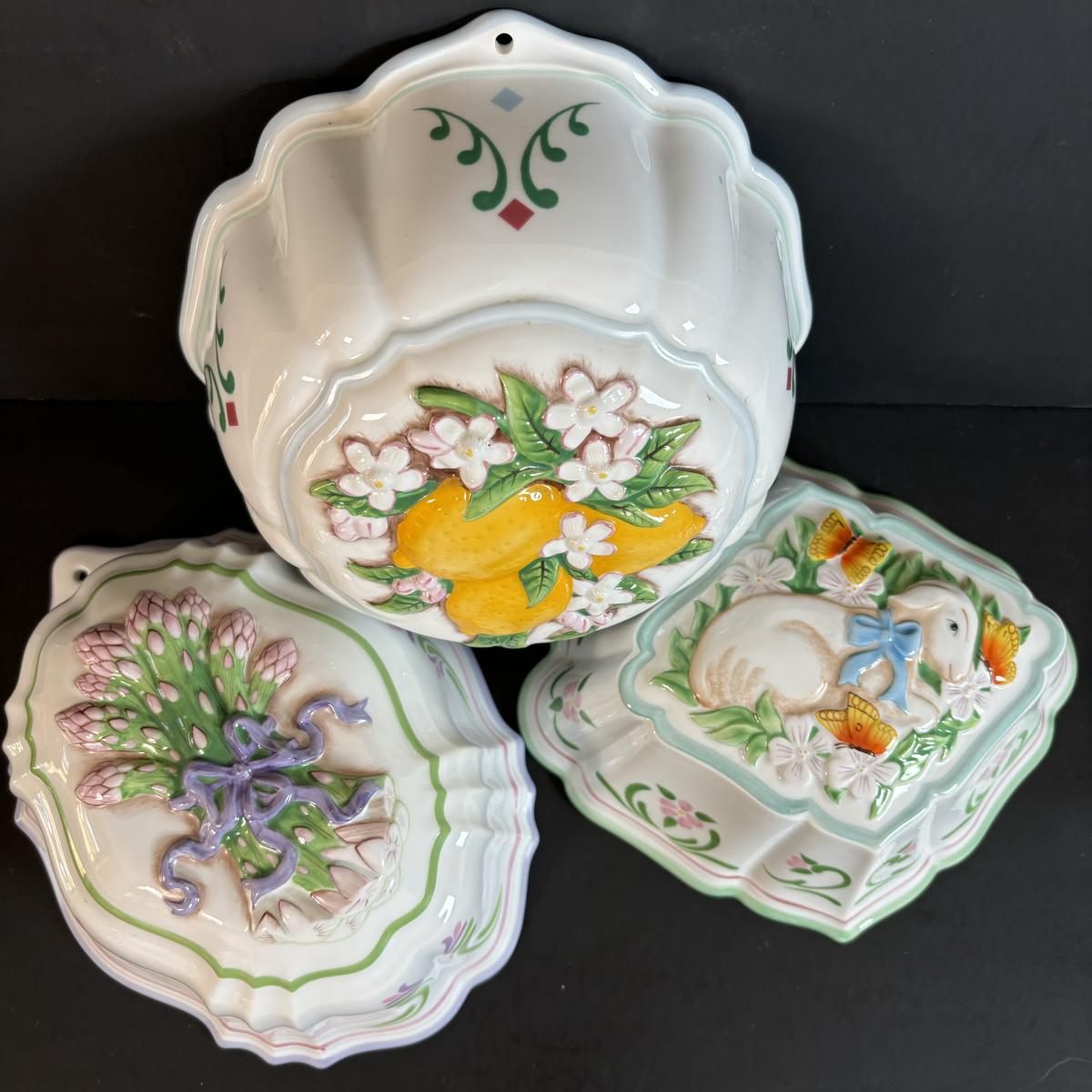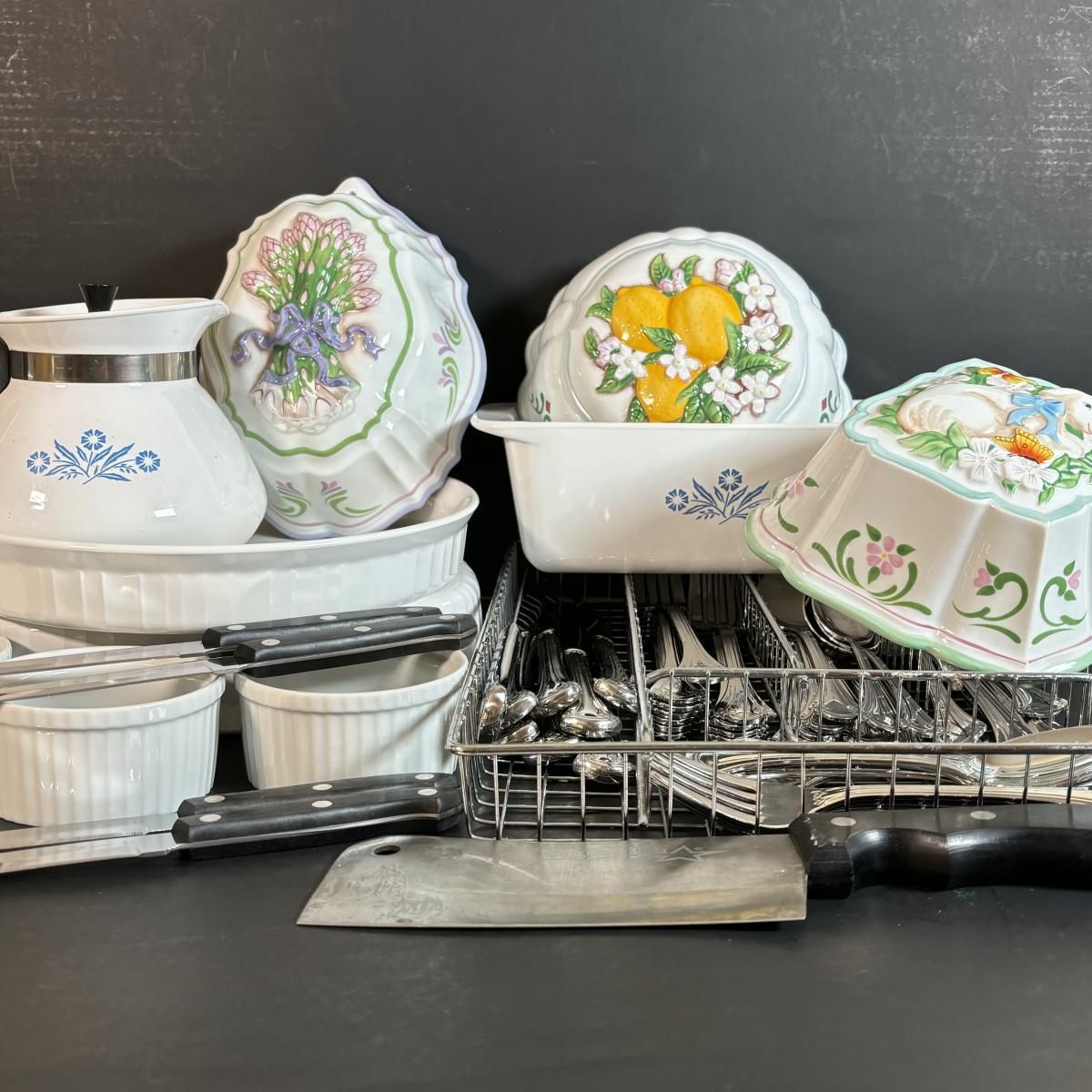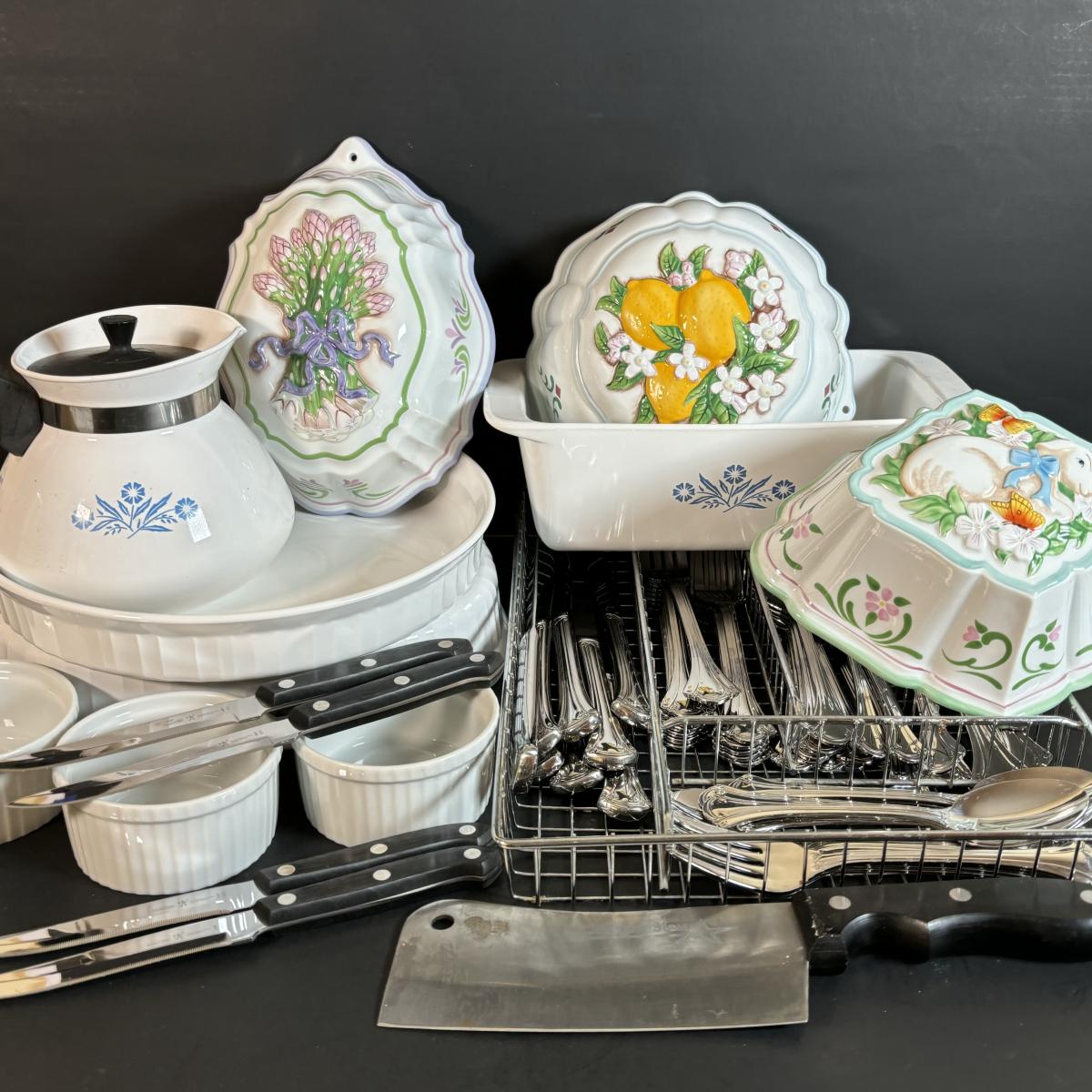 LOT 143: Franklin Mint Le Corden Bleu Jello Mold Wall Hangings, Henkle Knives, Wallace Flatware, Blue Corn Flower Corning Ware & More