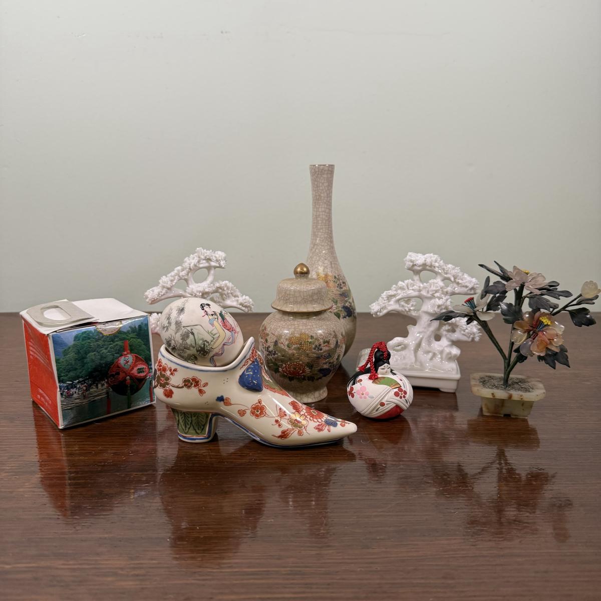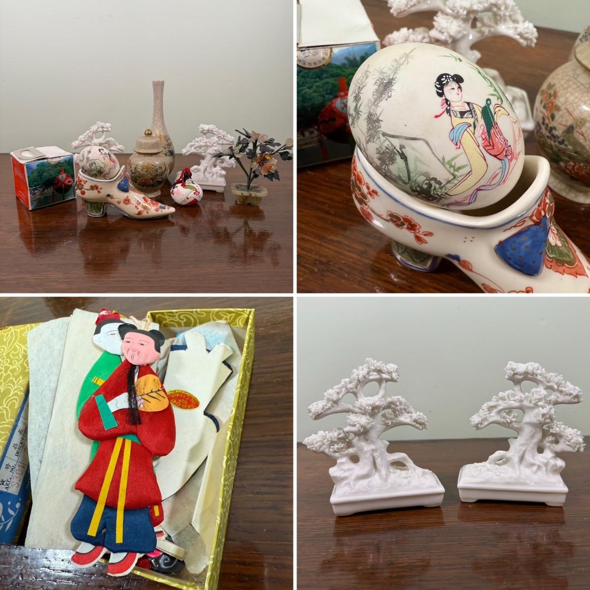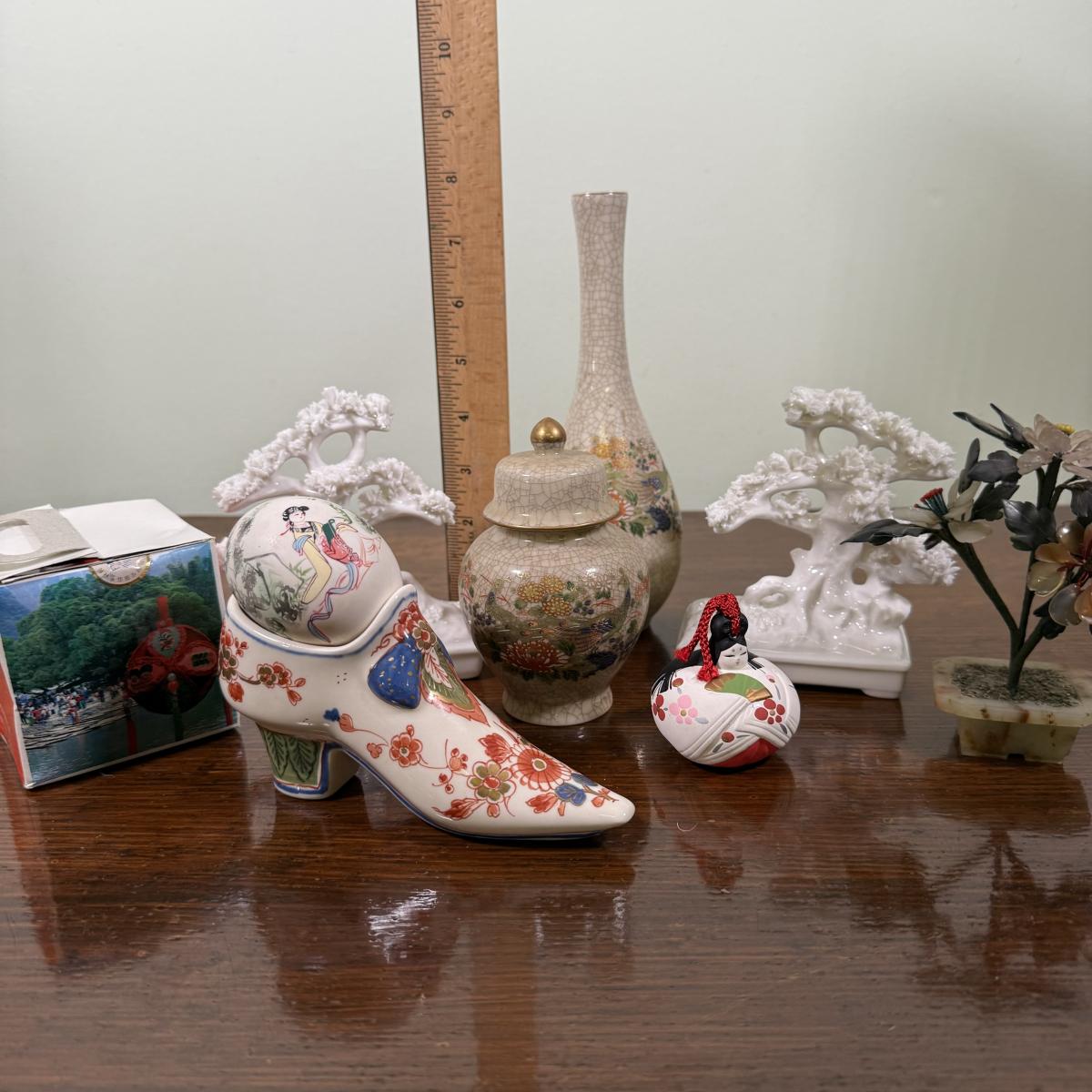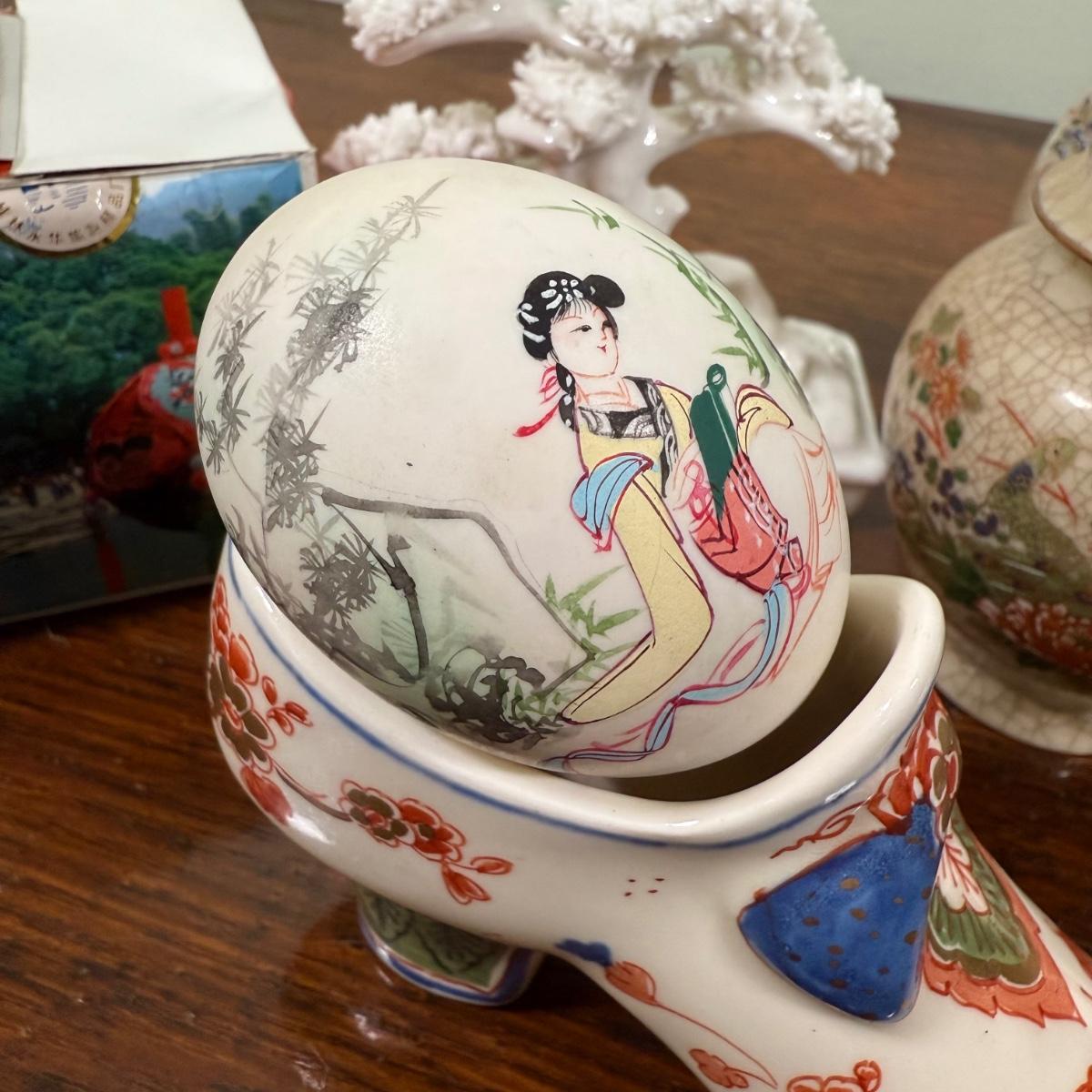 LOT 102B: Chinese Fabric Dolls in Box, Hand Painted Egg, Victorian Shoe, Stone Bonsai & White Porcelain Bonsai Trees