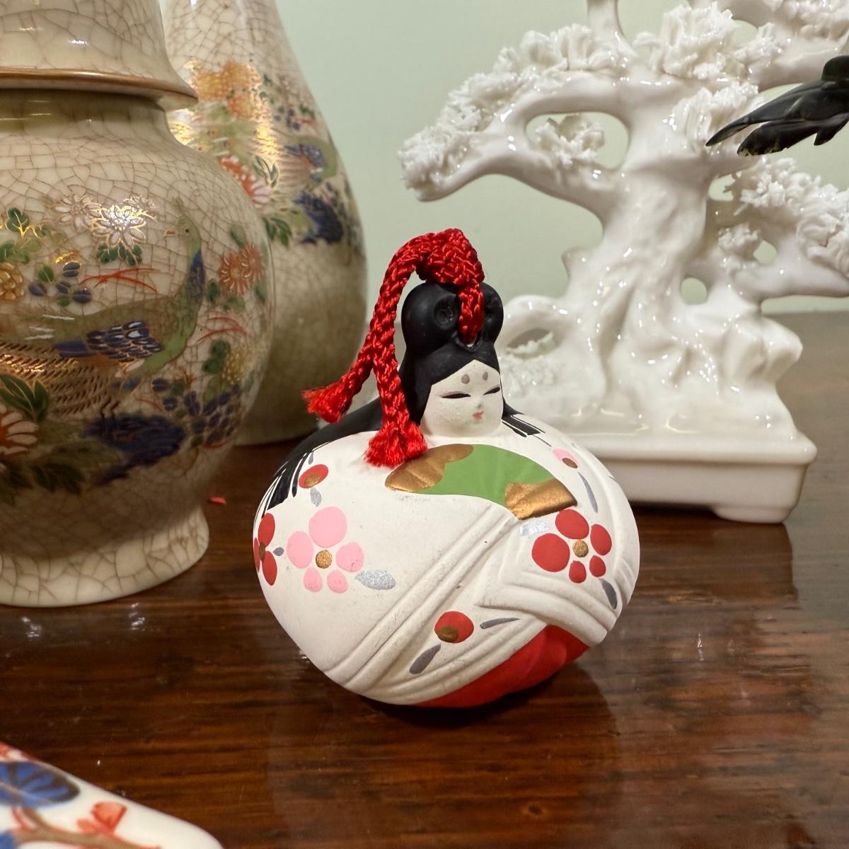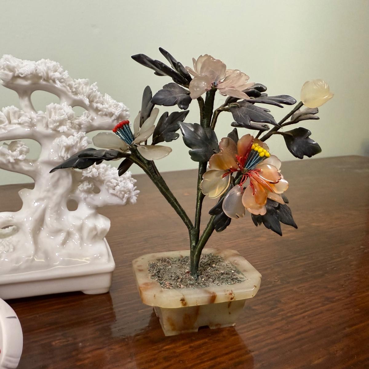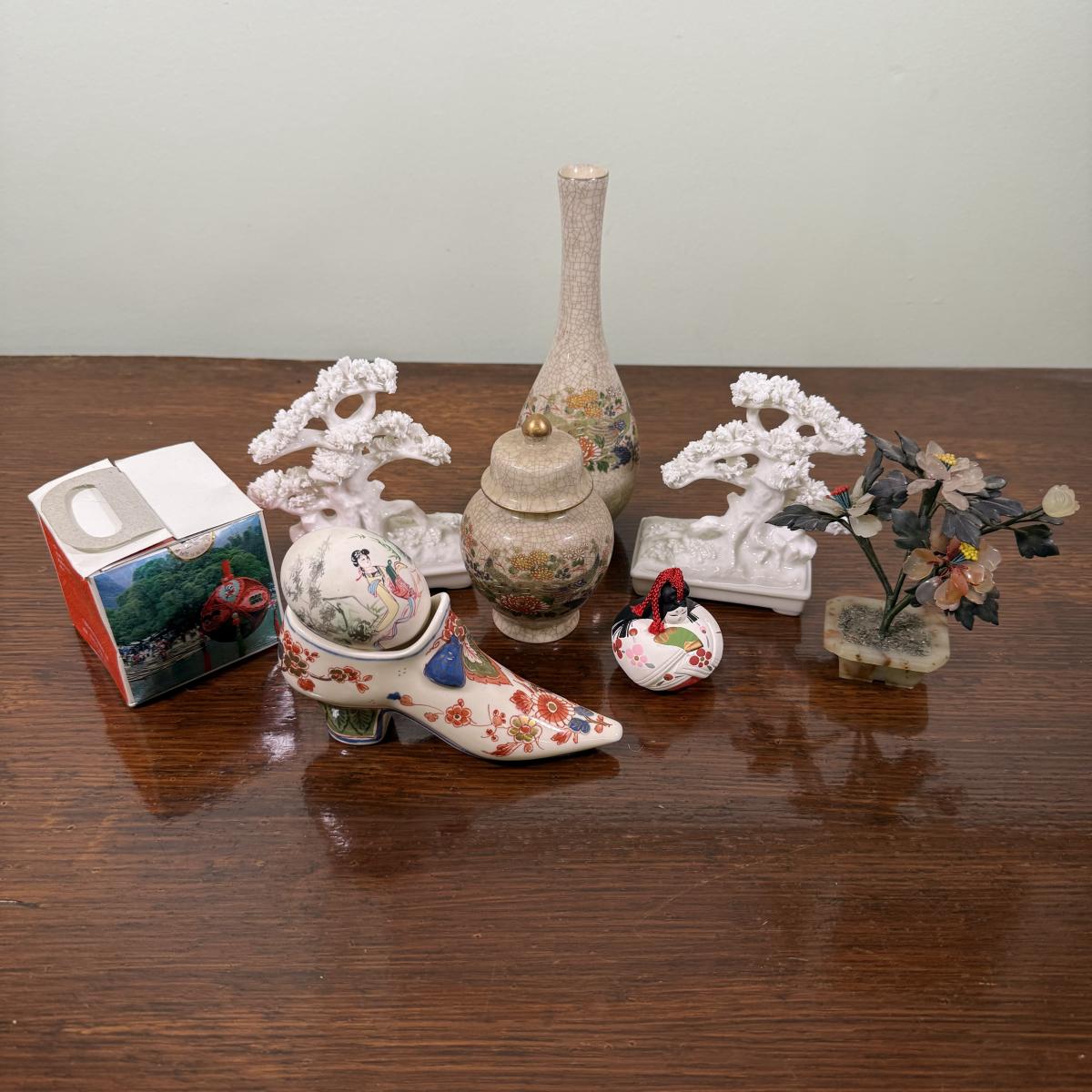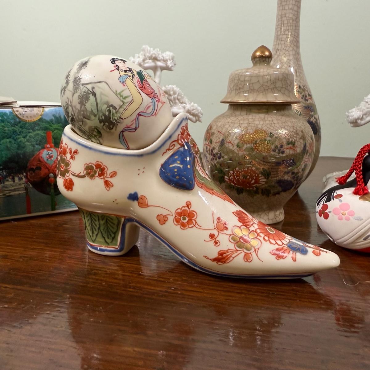 LOT 102B: Chinese Fabric Dolls in Box, Hand Painted Egg, Victorian Shoe, Stone Bonsai & White Porcelain Bonsai Trees