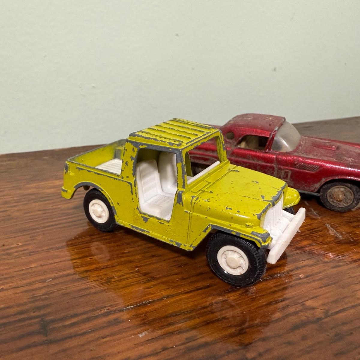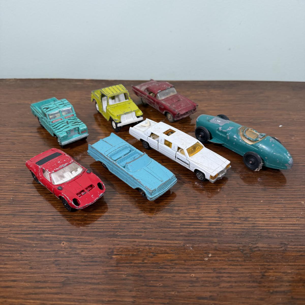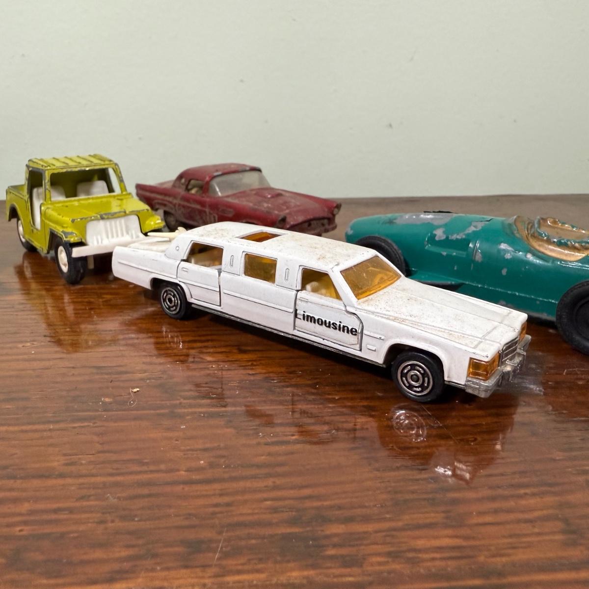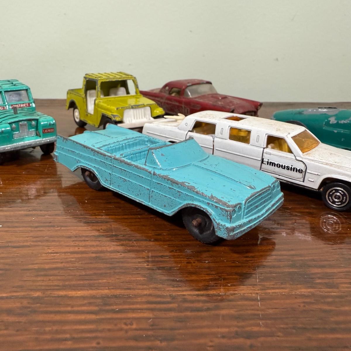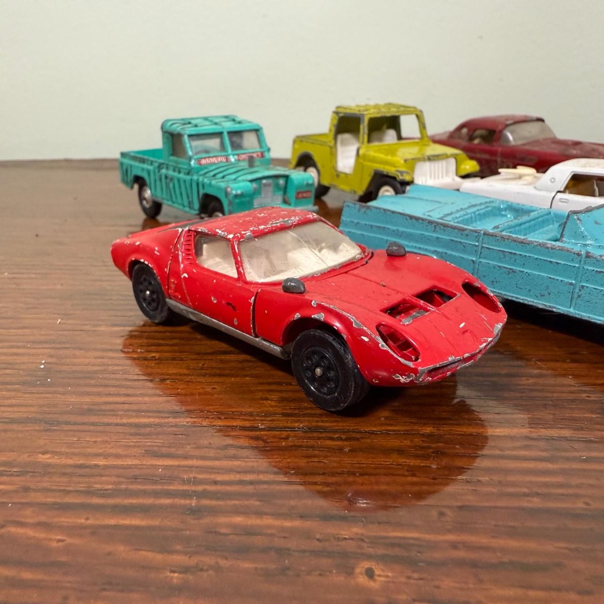LOT 108B: Collection of Vintage Toy Cars about 1/40 Scale - 1989 Tootsietoy Jeep, Zee Macau 1956 Ford T-Bird, French Mojorette Limo, Corgi Toys Lamborghini Miura P400 & Land Rover 109" WB