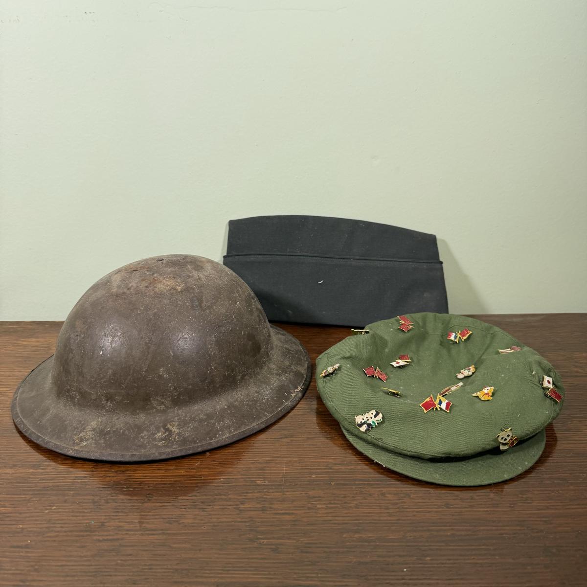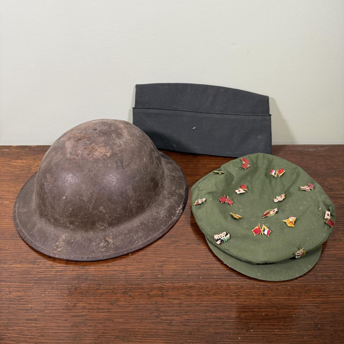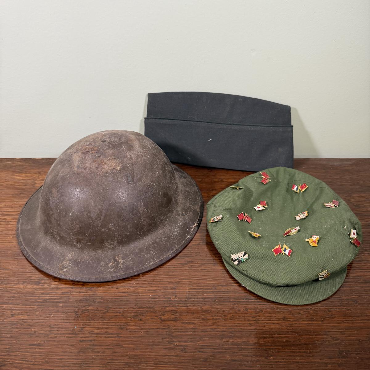 LOT 109B: Vintage WWI/WWII Brodie Helmet, Military Cap w/ Pins & Garrison Cap
