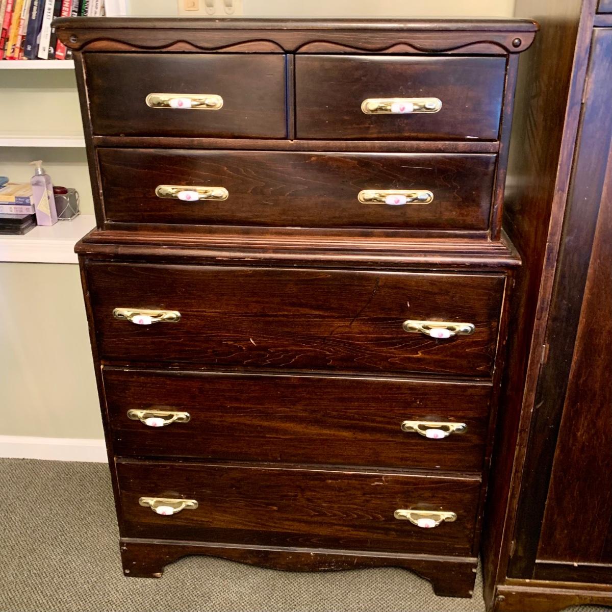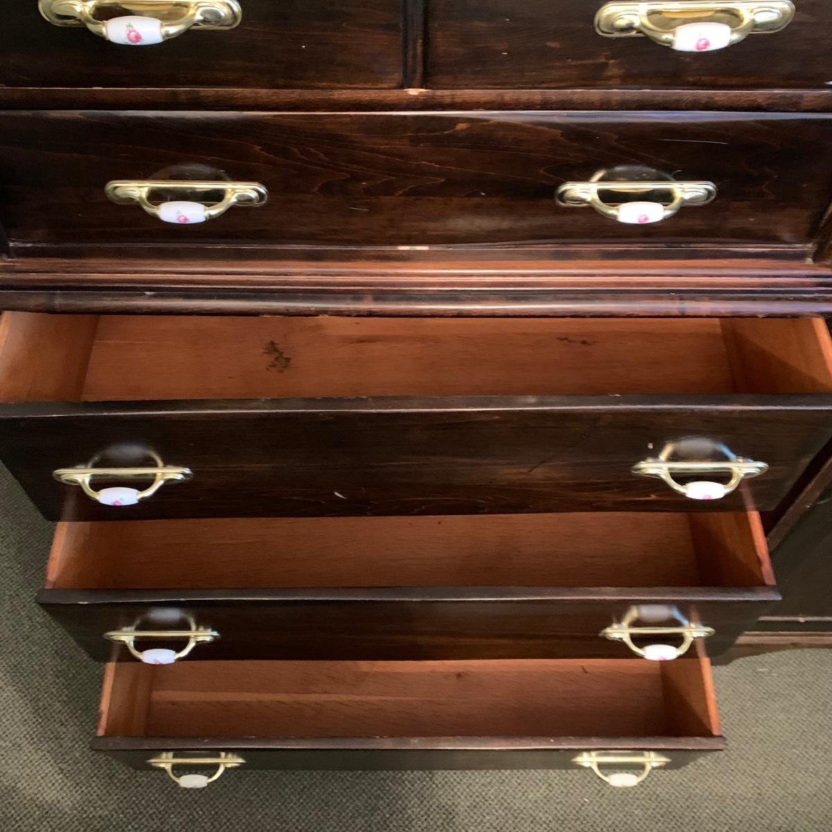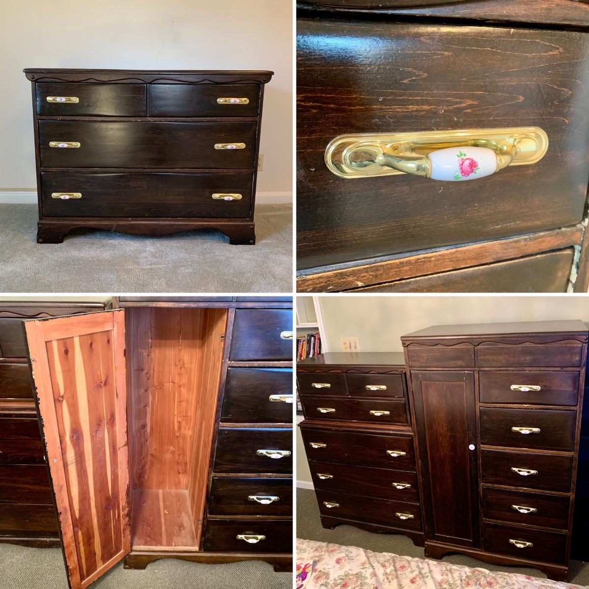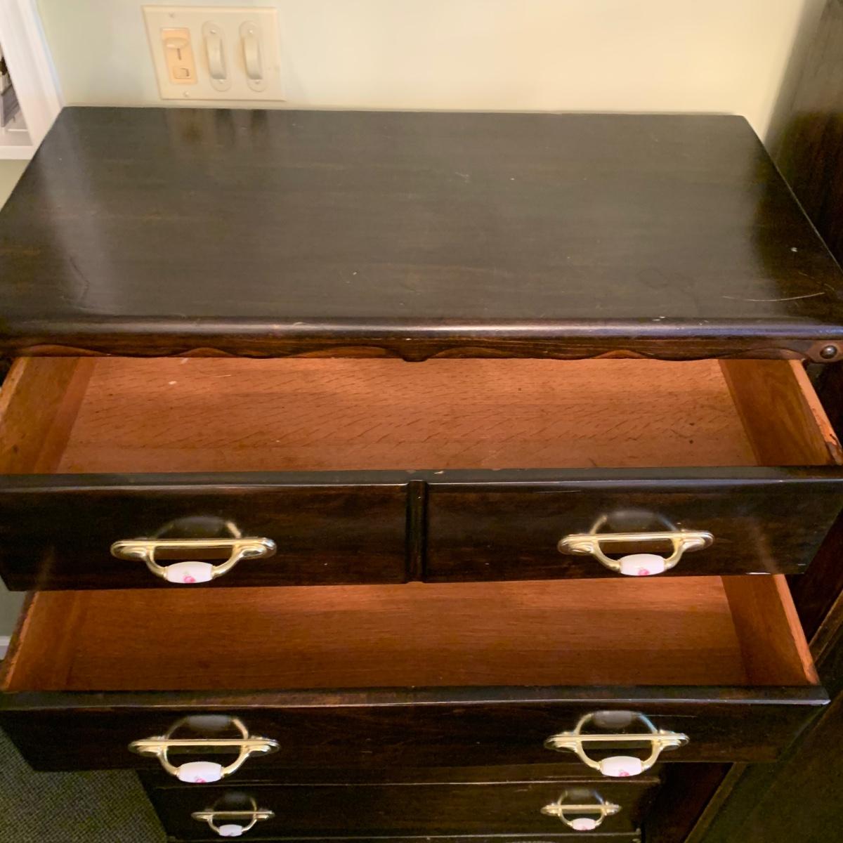 LOT 132 M & Y: Dark Wood Rose Handles Bedroom Set: 3 Drawer Dresser, 5 Drawer Wardrobe, & 5 Drawer Chest Of Drawers