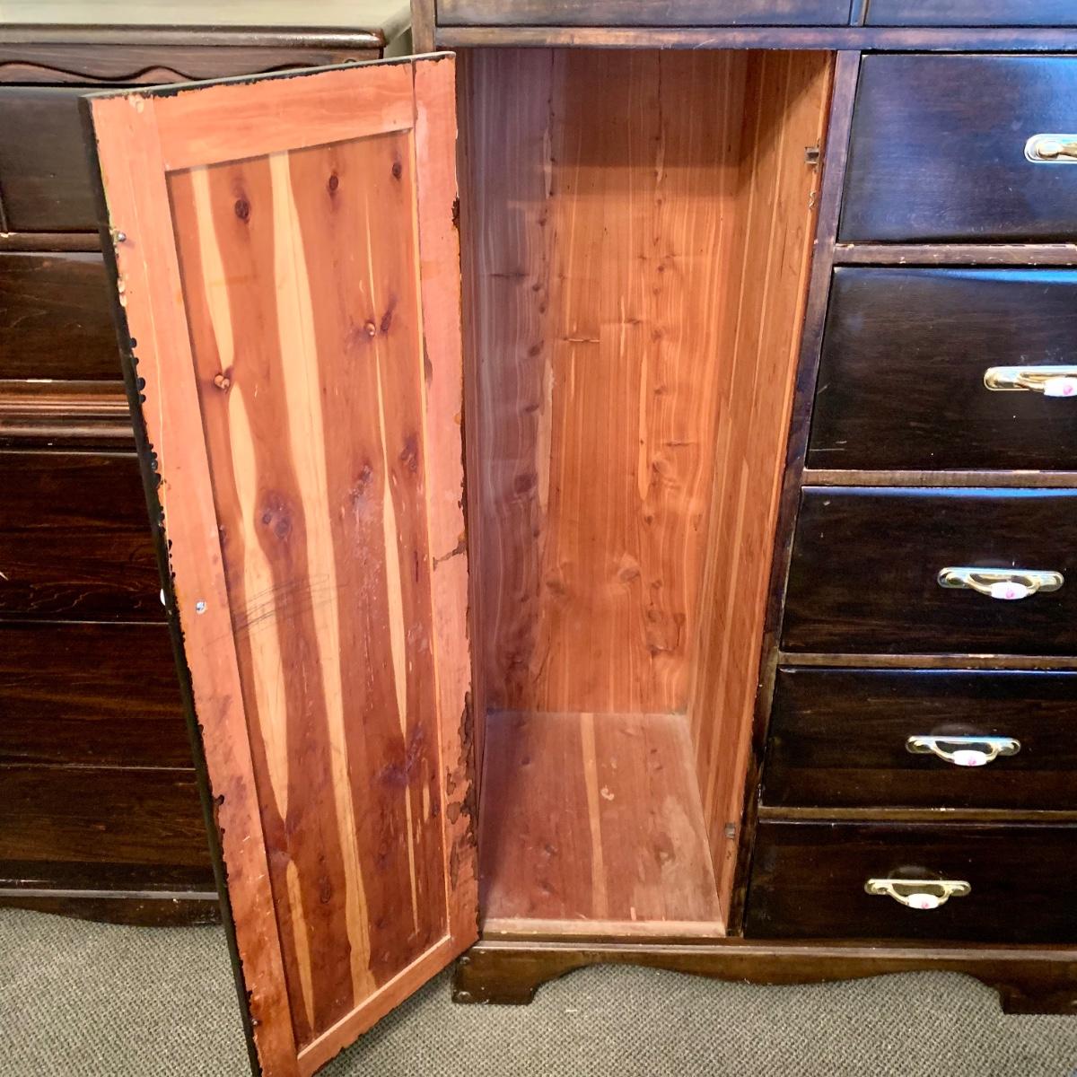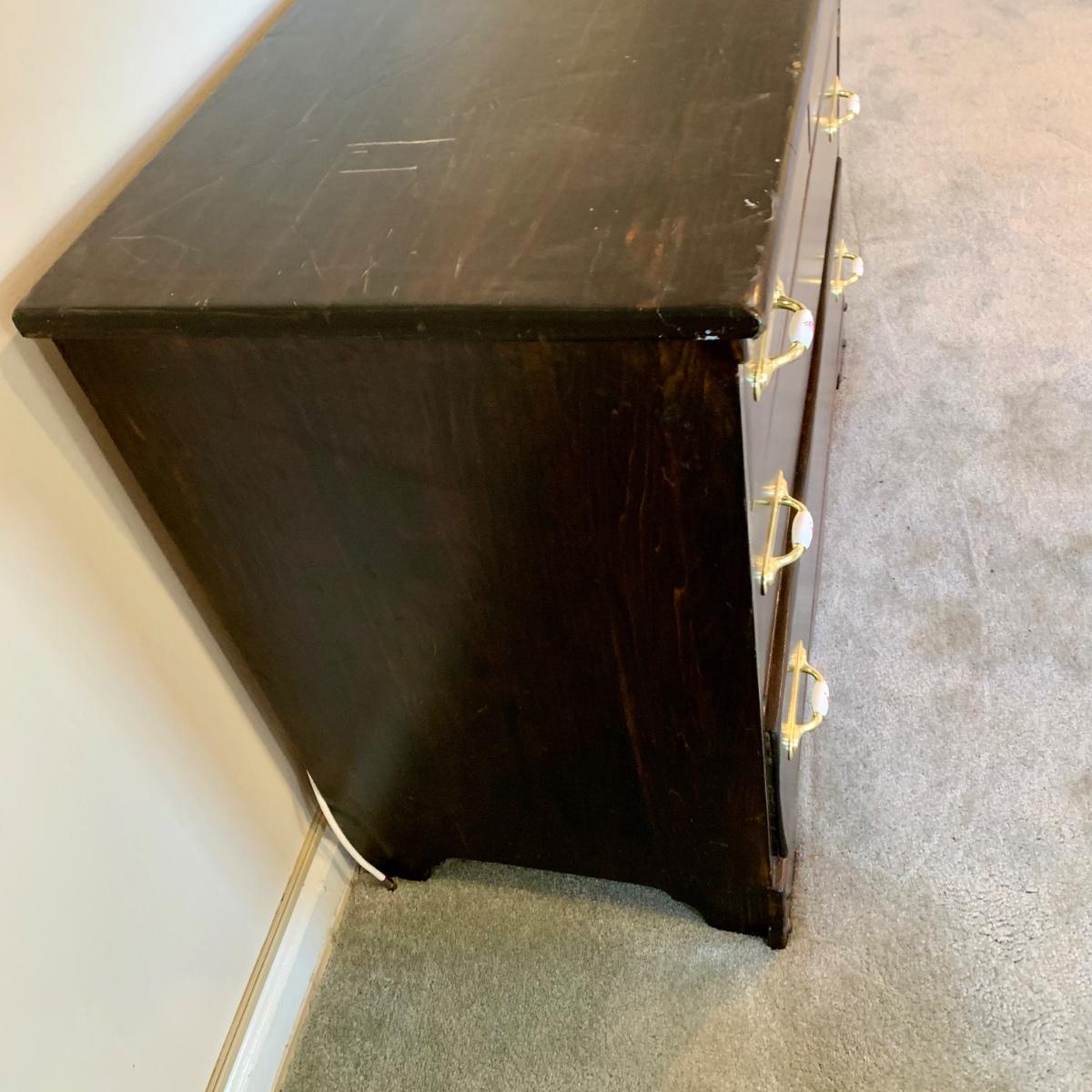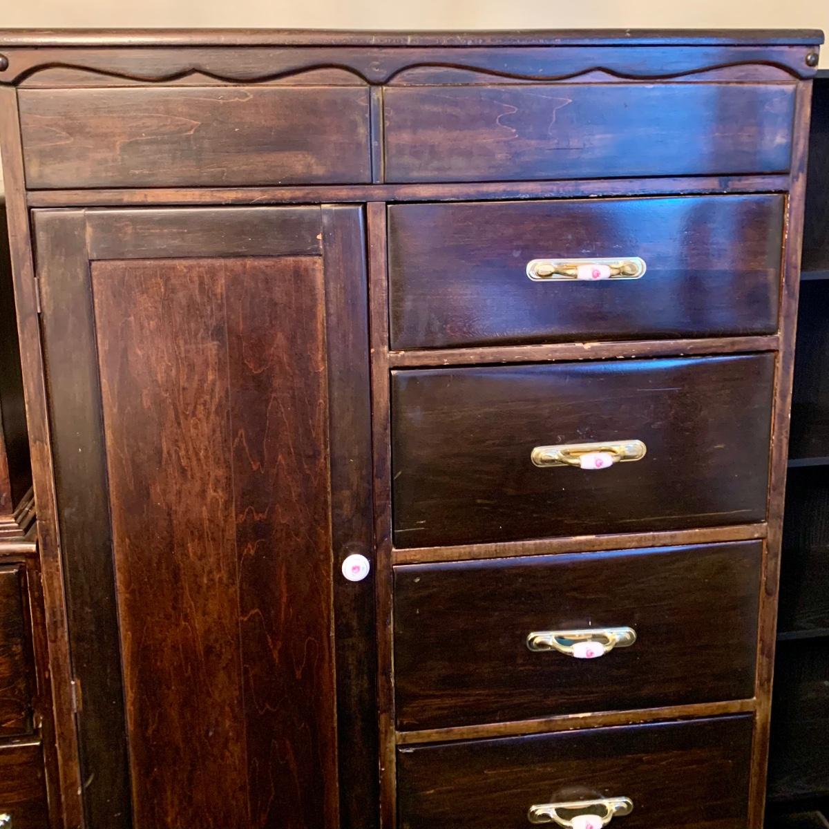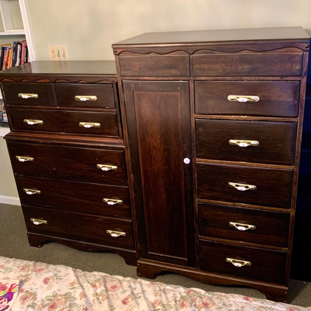 LOT 132 M & Y: Dark Wood Rose Handles Bedroom Set: 3 Drawer Dresser, 5 Drawer Wardrobe, & 5 Drawer Chest Of Drawers