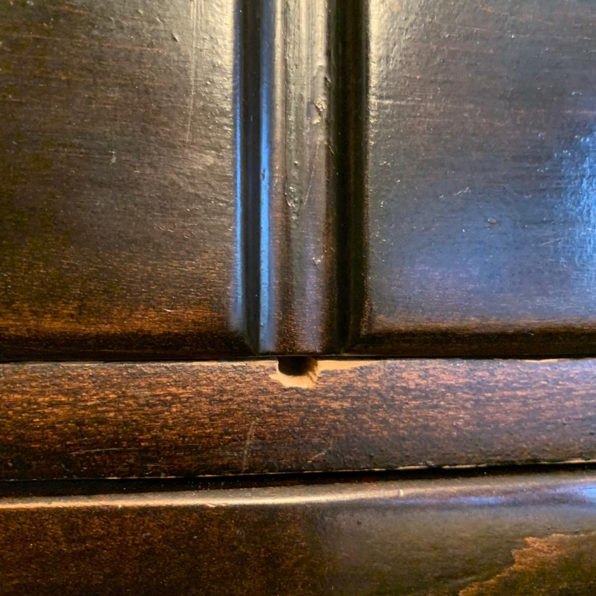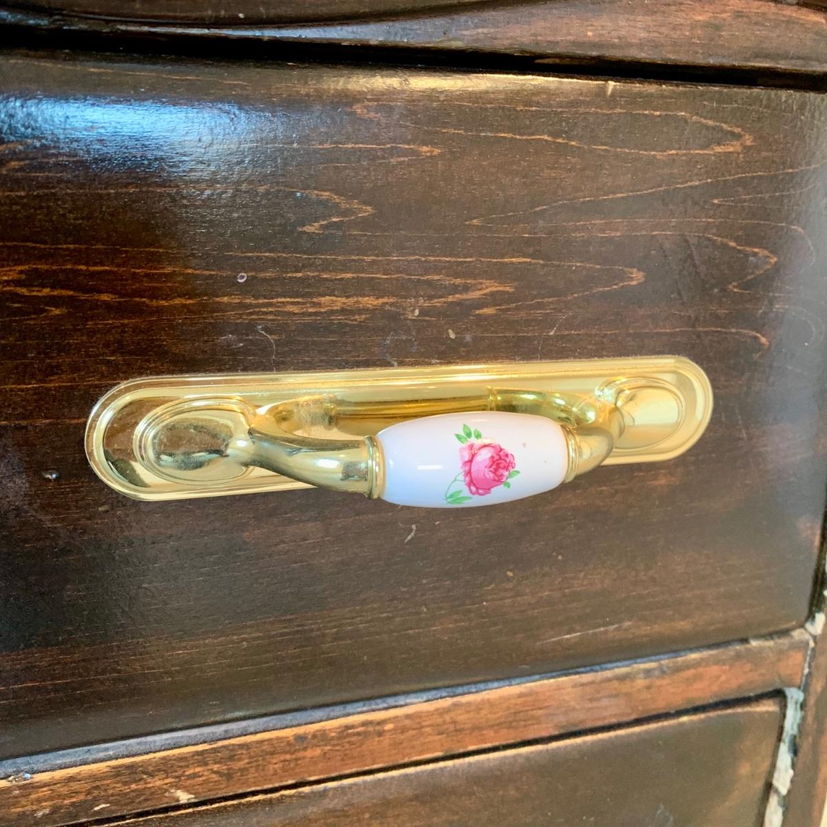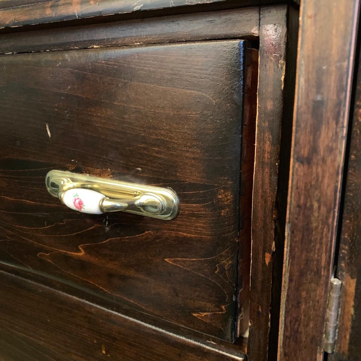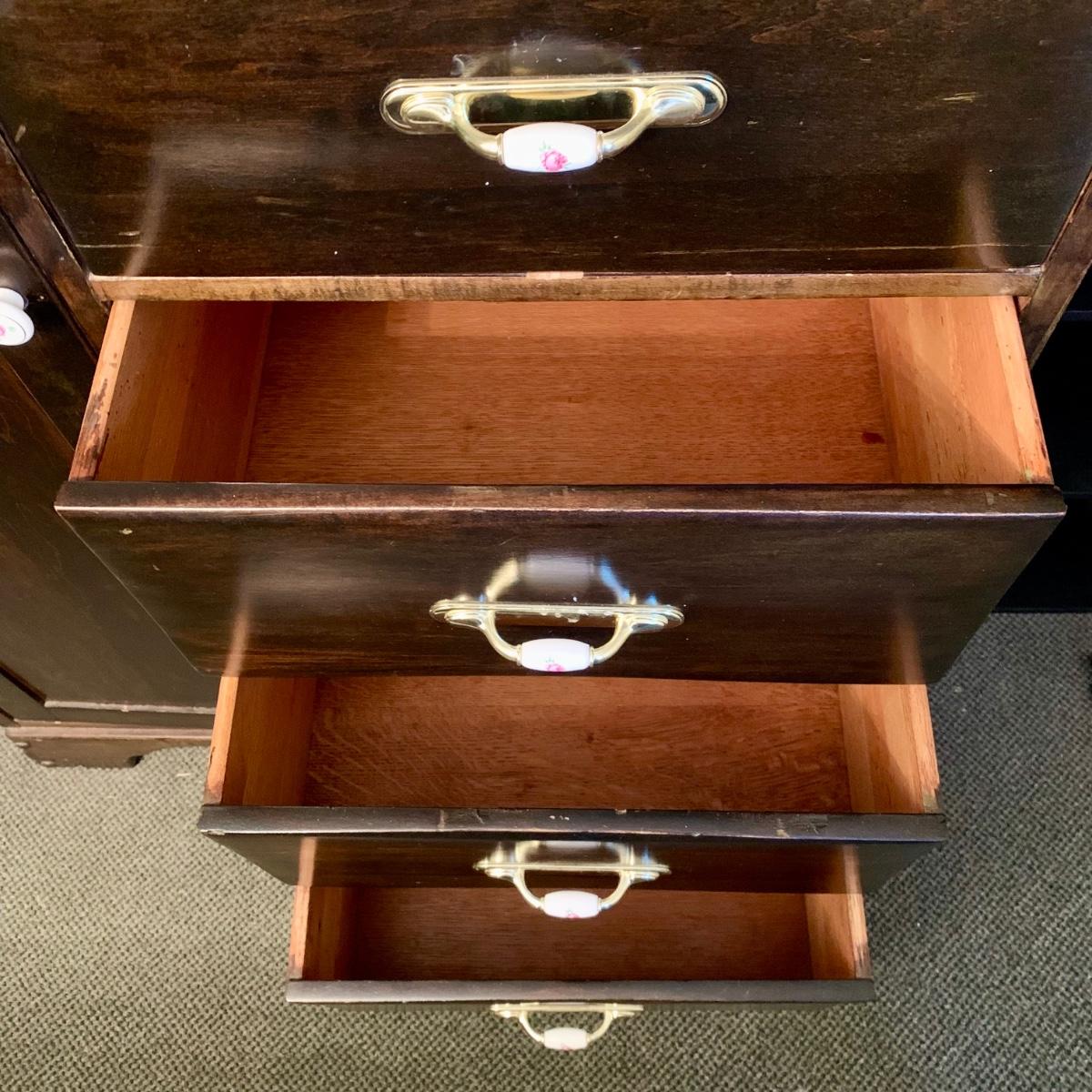 LOT 132 M & Y: Dark Wood Rose Handles Bedroom Set: 3 Drawer Dresser, 5 Drawer Wardrobe, & 5 Drawer Chest Of Drawers
