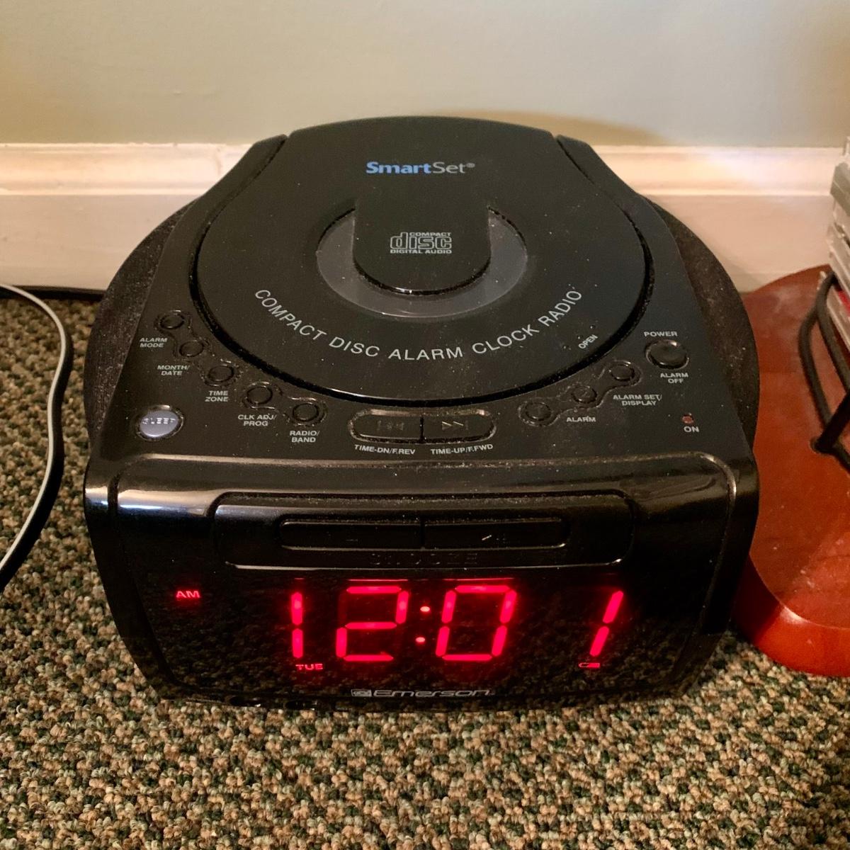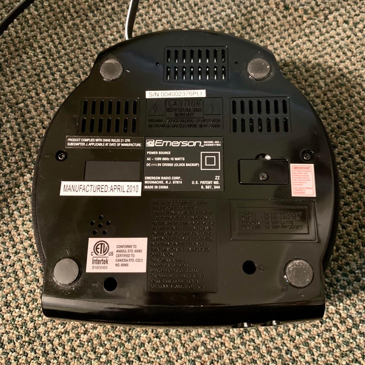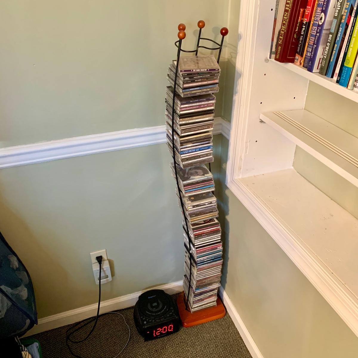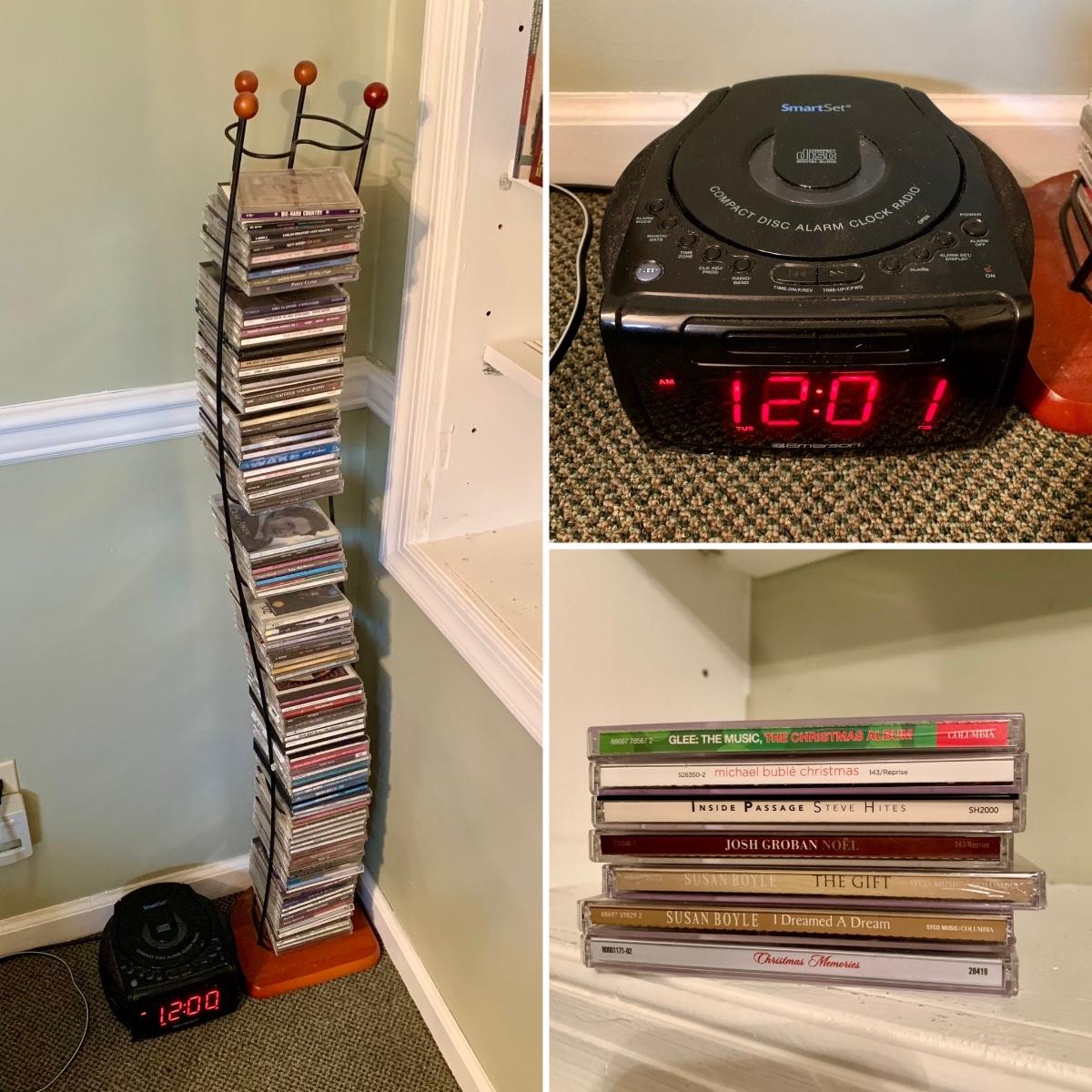 LOT 134 M: Emerson Smart Set CD Alarm Clock Model #CKD9917BK & Atlantic CD Floor Rack w/ CD's