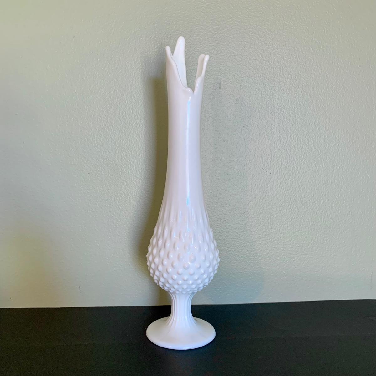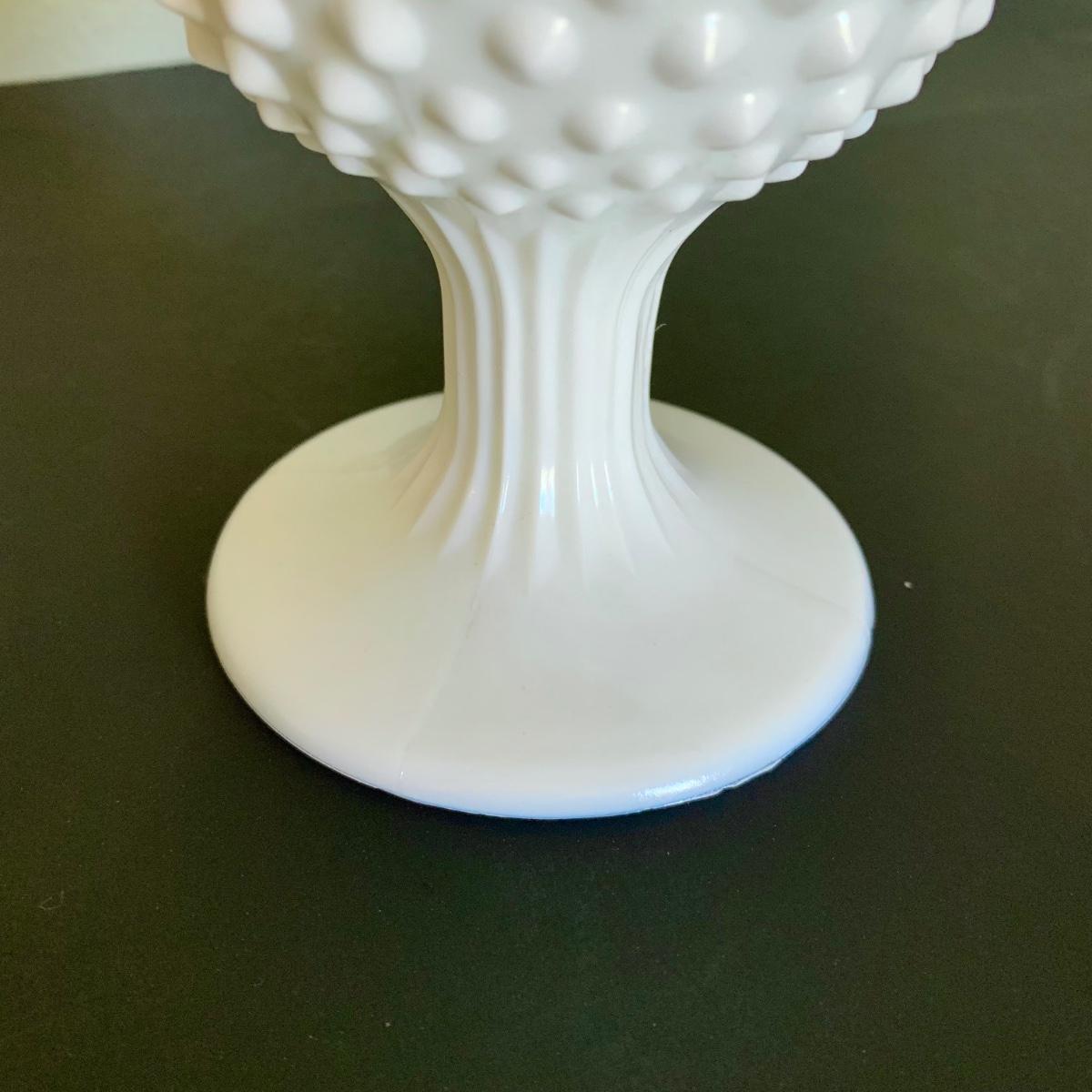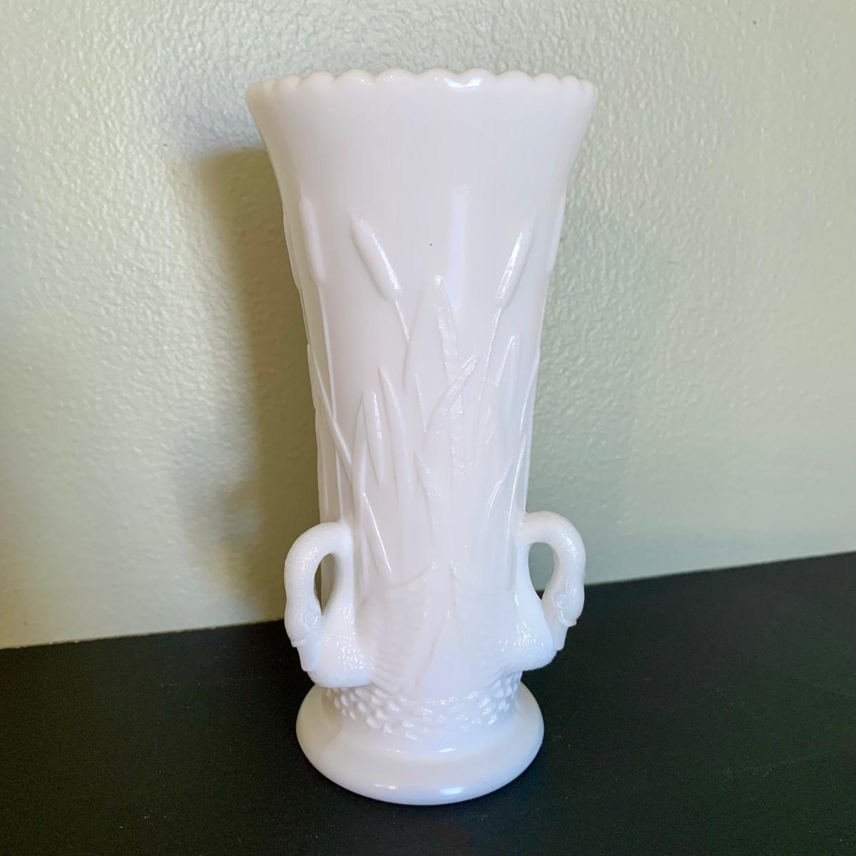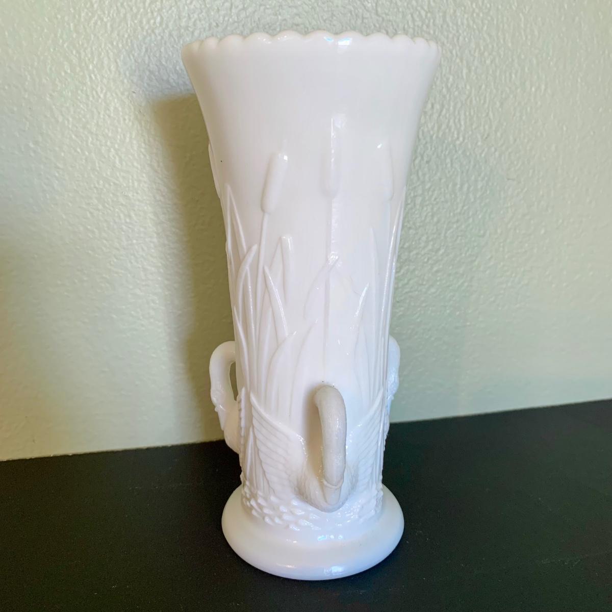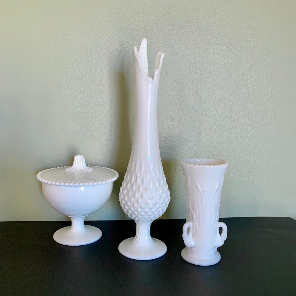 LOT 138 L: Vintage Fenton Hobnail Milk Glass Swing Vase, Westmoreland Milk Glass Sawn & Cattails Vase, & Milk Glass Lidded Compote / Candy Dish