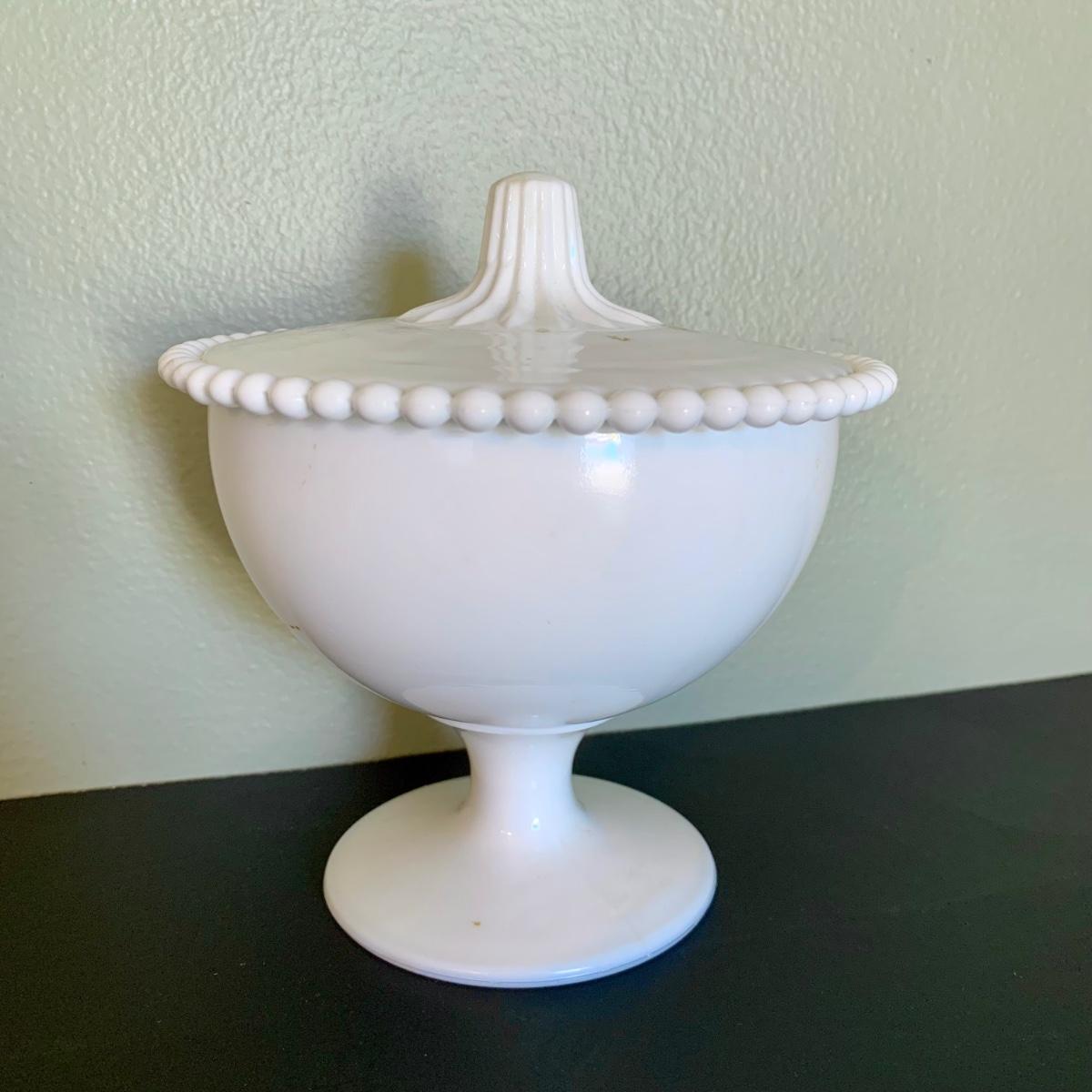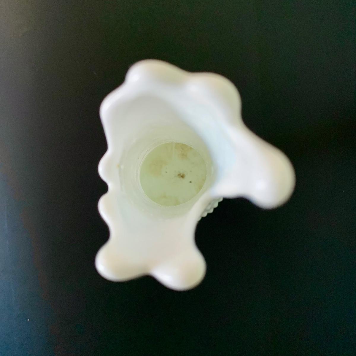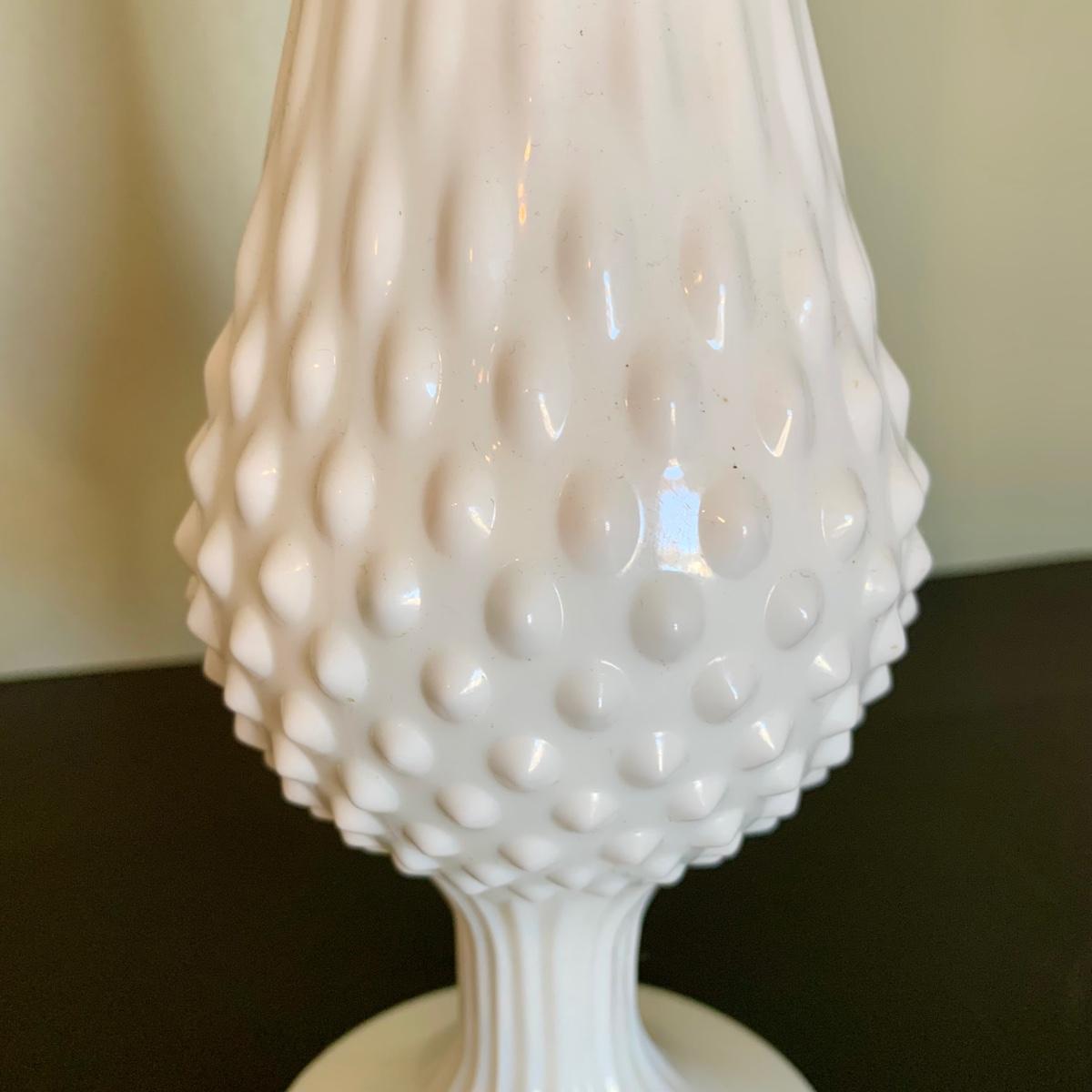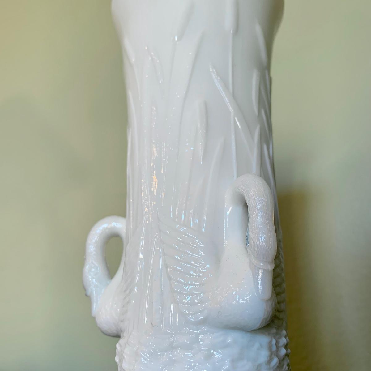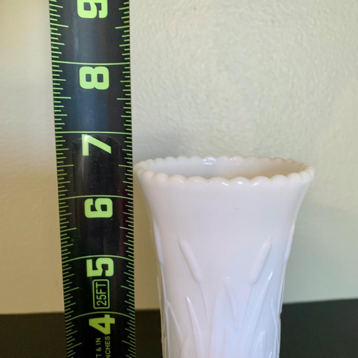 LOT 138 L: Vintage Fenton Hobnail Milk Glass Swing Vase, Westmoreland Milk Glass Sawn & Cattails Vase, & Milk Glass Lidded Compote / Candy Dish