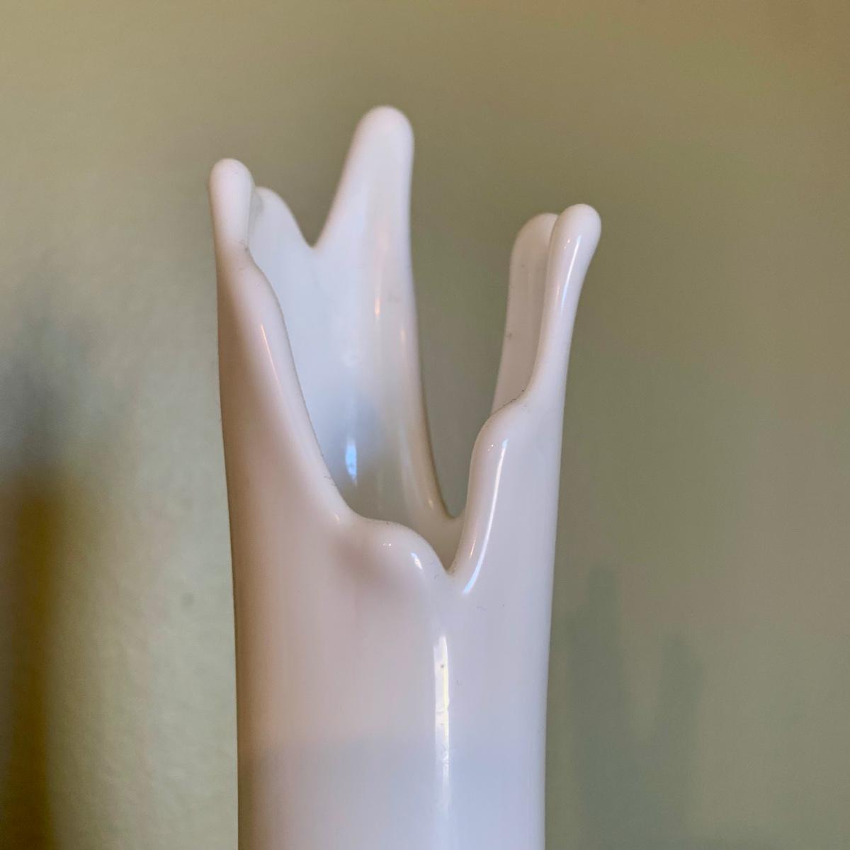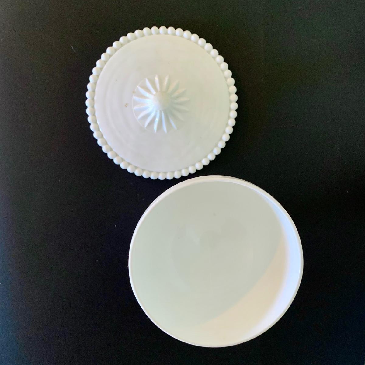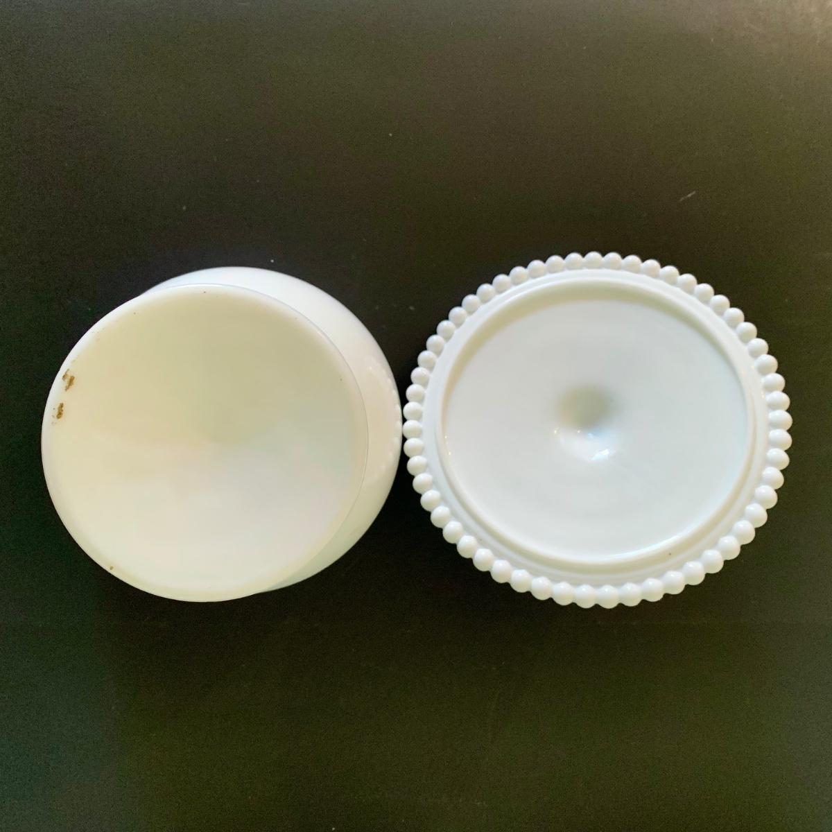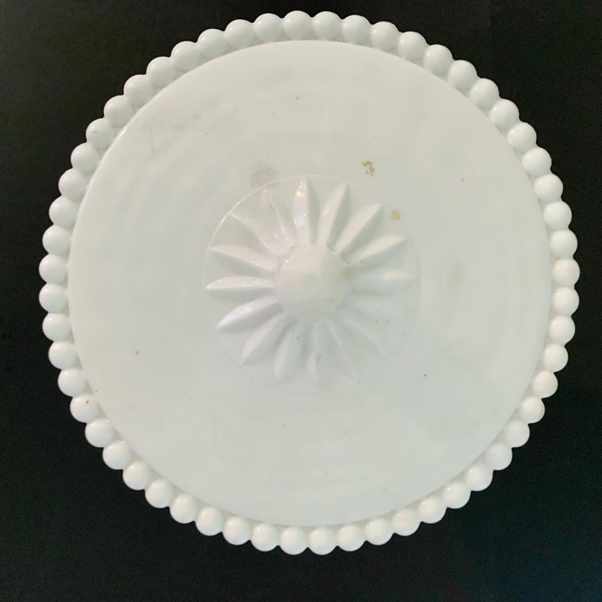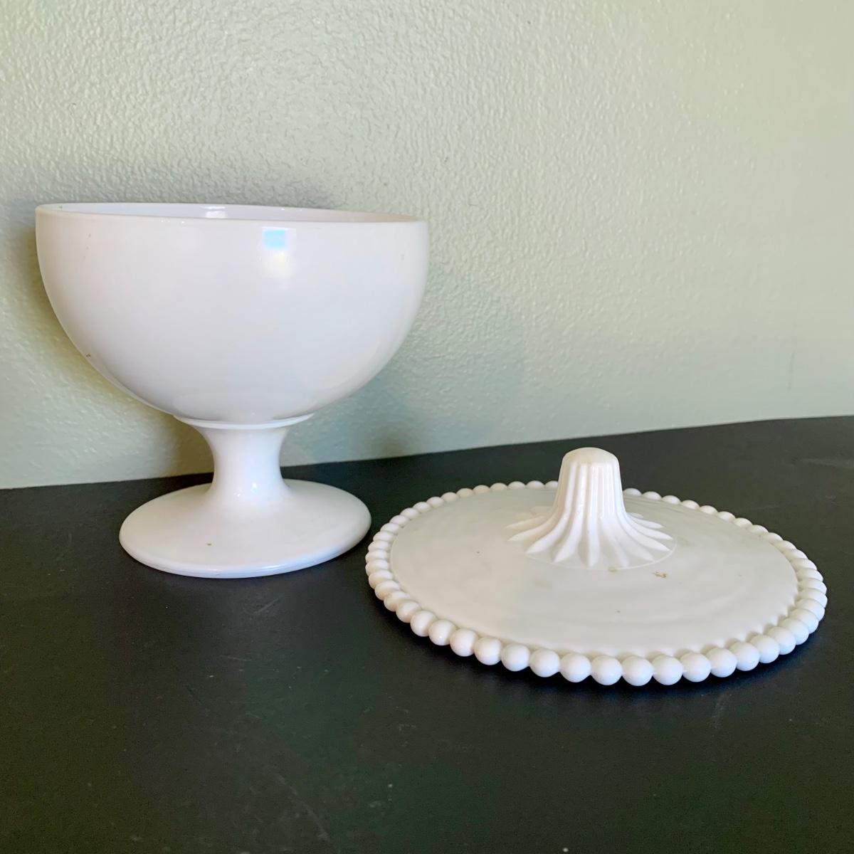 LOT 138 L: Vintage Fenton Hobnail Milk Glass Swing Vase, Westmoreland Milk Glass Sawn & Cattails Vase, & Milk Glass Lidded Compote / Candy Dish