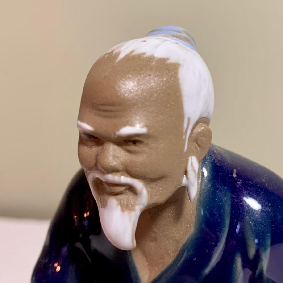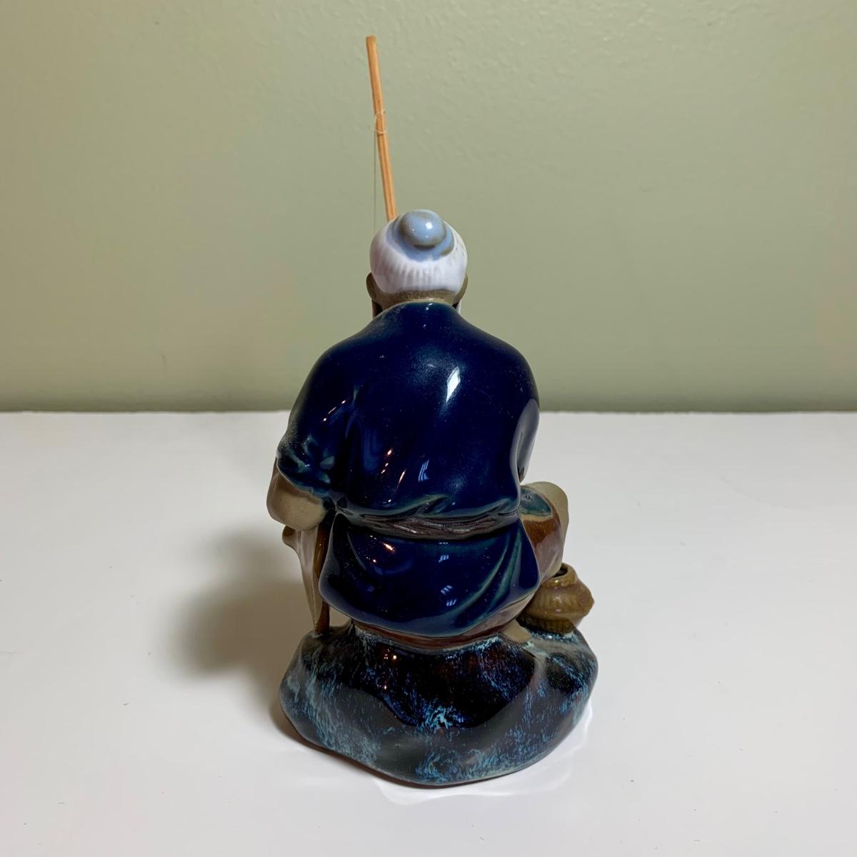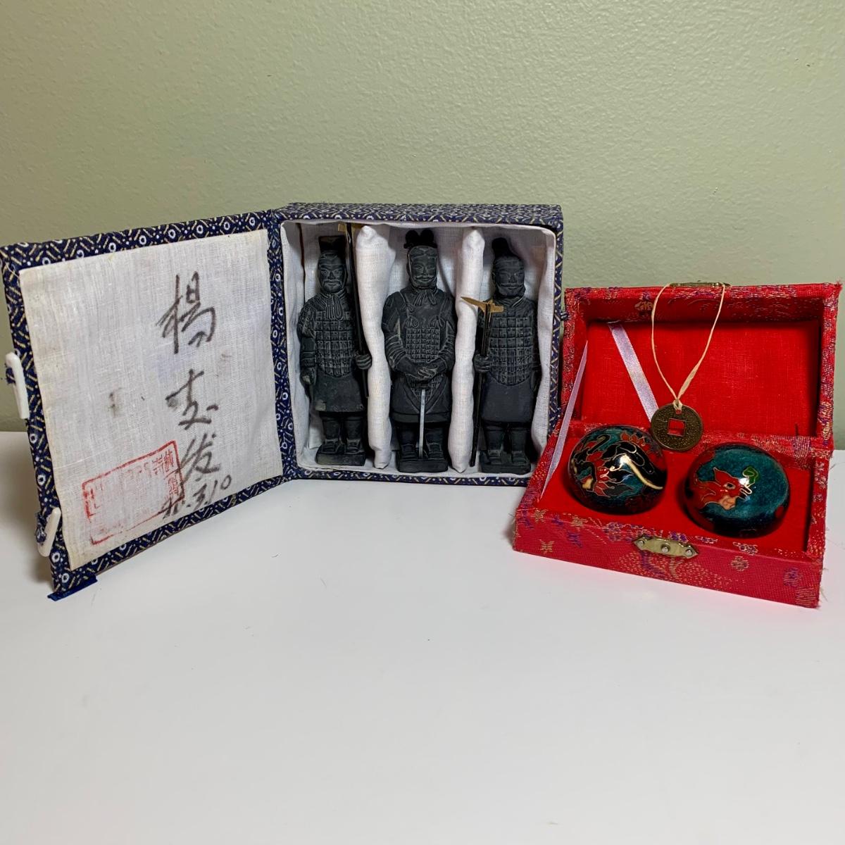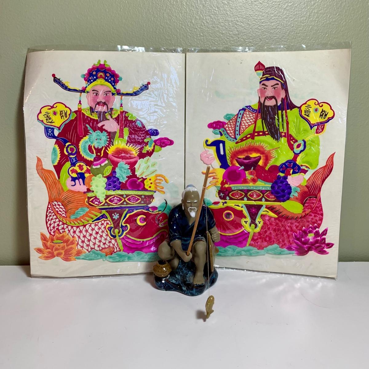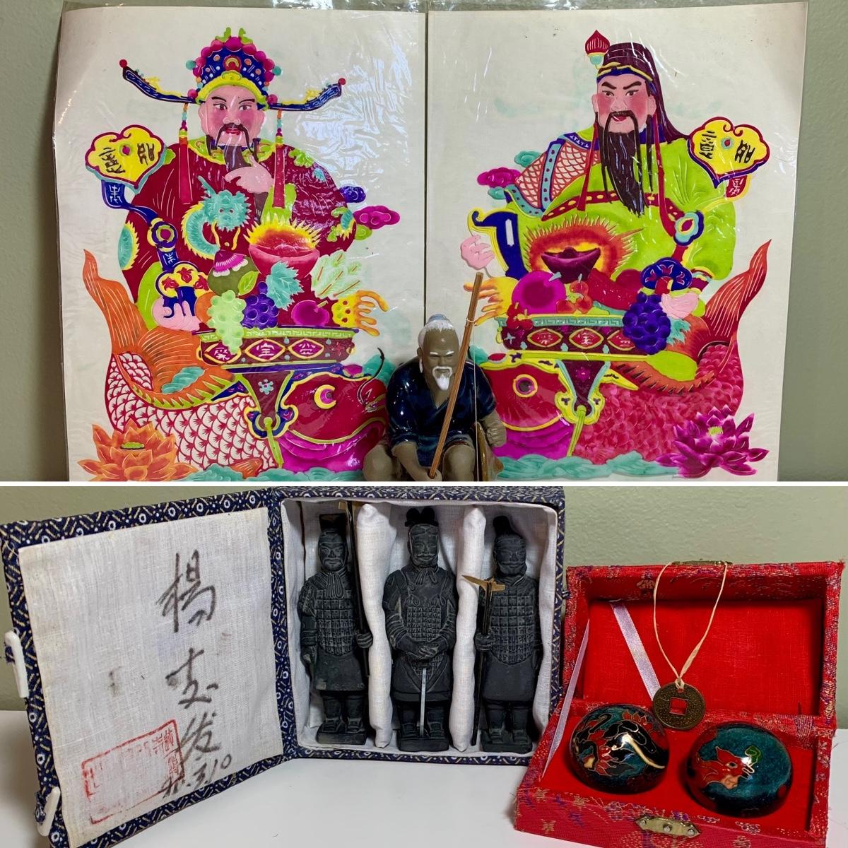 LOT 142 L: Vintage Chinese Collection: Mud Man Fisherman Ceramic Figurine, Set of 4 Handmade Paper craft Gods, Terracotta Soldier Figurines, Shouxing Baoding Enamel Dragon & Phoenix Balls