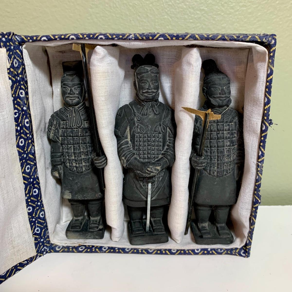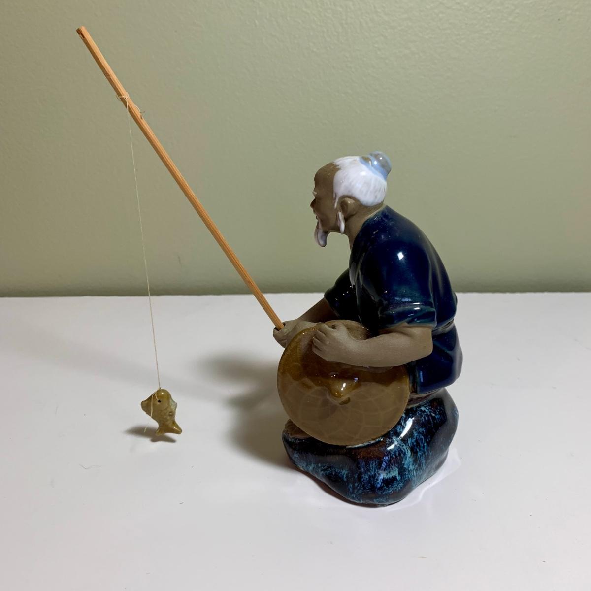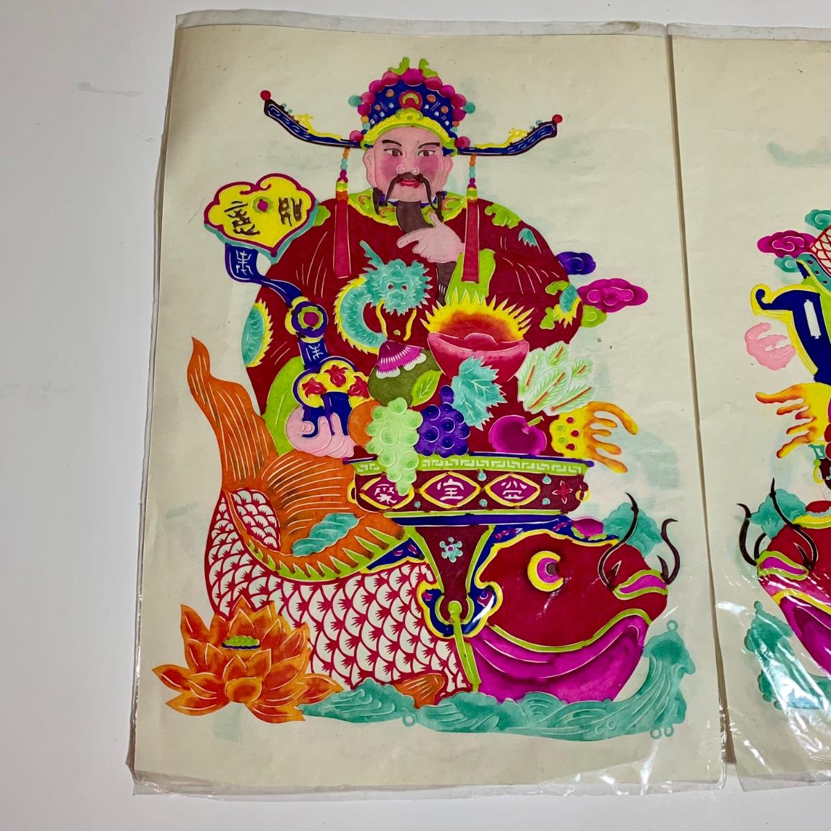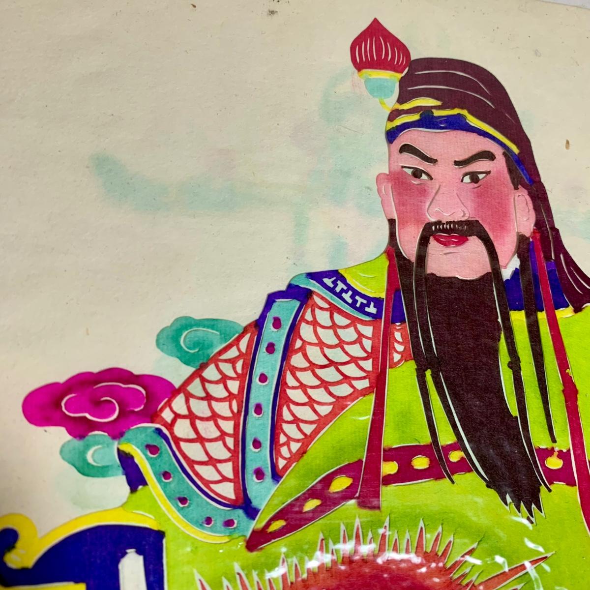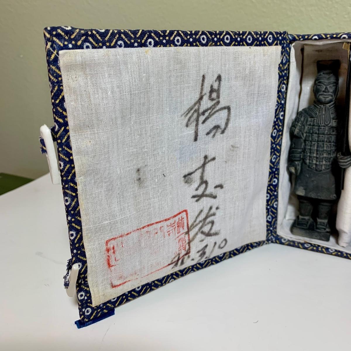 LOT 142 L: Vintage Chinese Collection: Mud Man Fisherman Ceramic Figurine, Set of 4 Handmade Paper craft Gods, Terracotta Soldier Figurines, Shouxing Baoding Enamel Dragon & Phoenix Balls