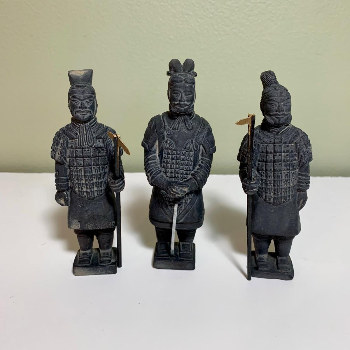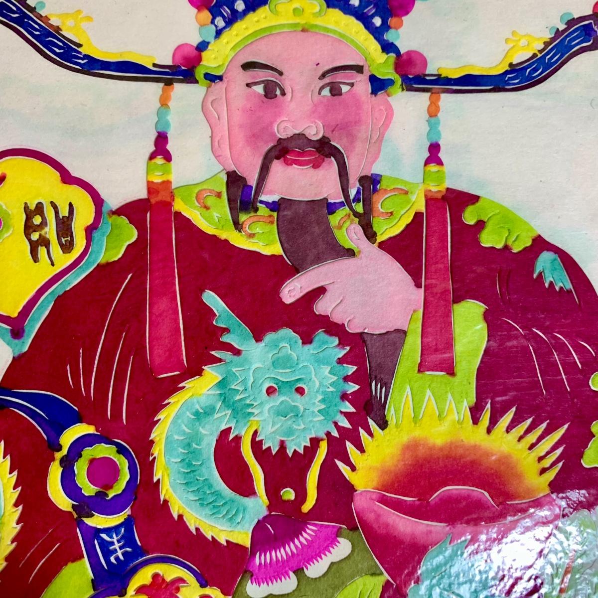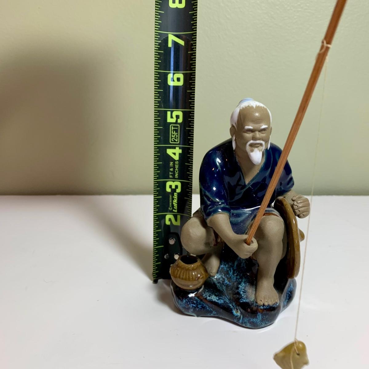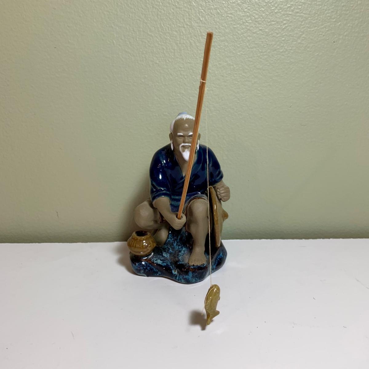 LOT 142 L: Vintage Chinese Collection: Mud Man Fisherman Ceramic Figurine, Set of 4 Handmade Paper craft Gods, Terracotta Soldier Figurines, Shouxing Baoding Enamel Dragon & Phoenix Balls