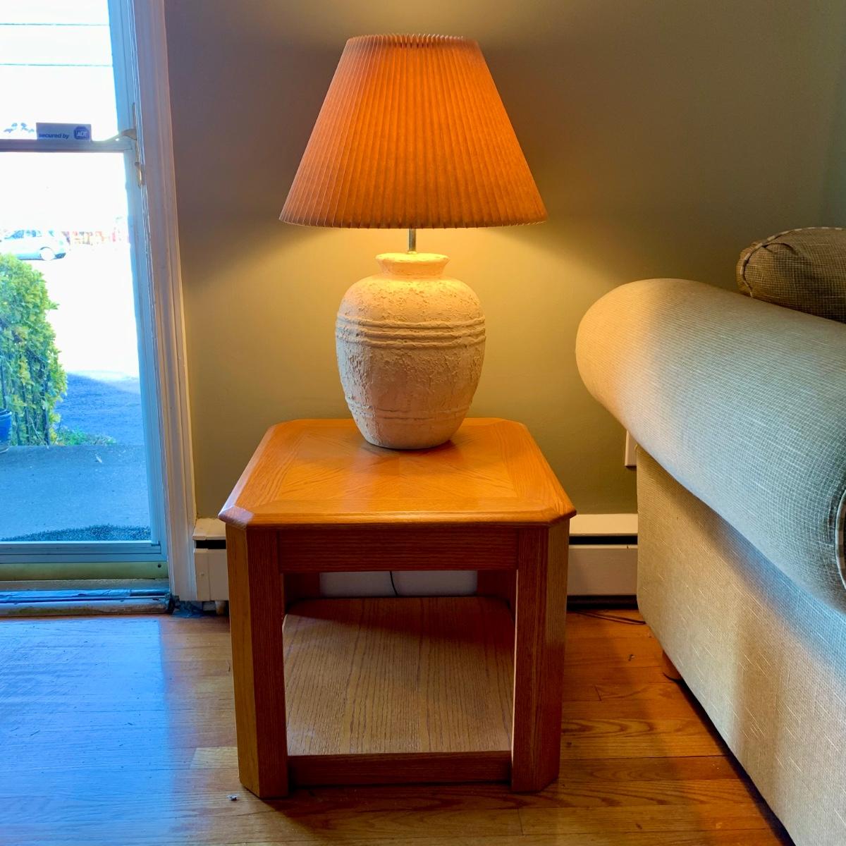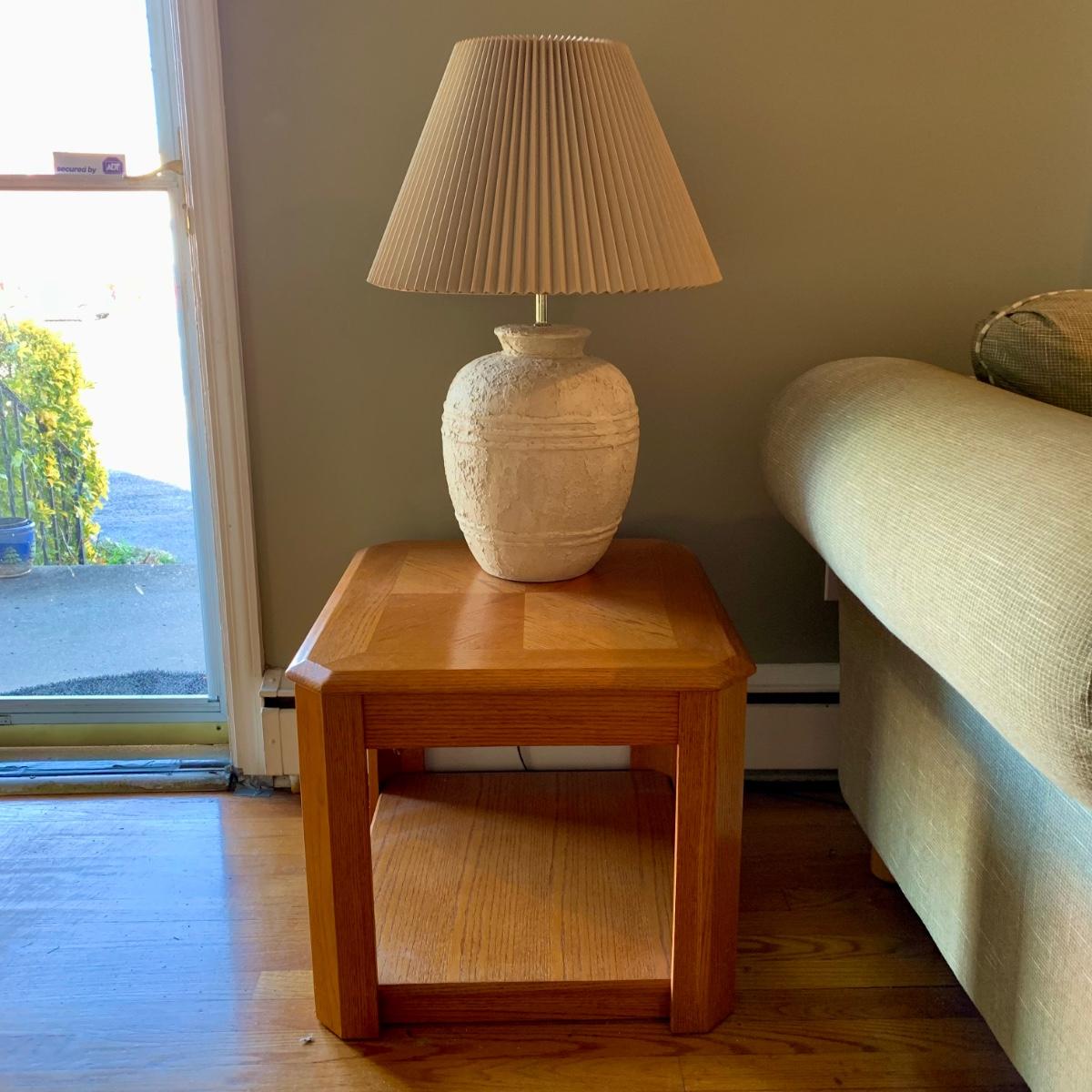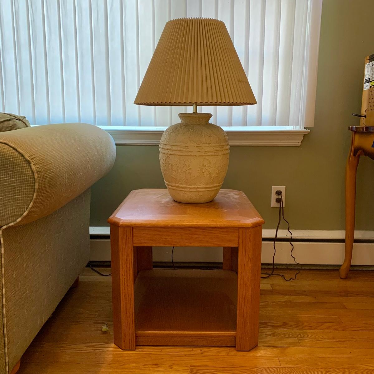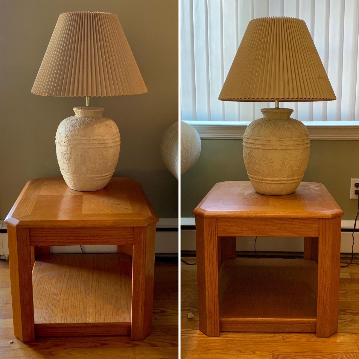 LOT 147 L: 1980's Textured Plaster Lamps & 2 1990's Oak End / Side Tables