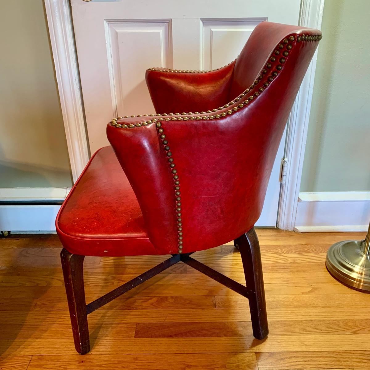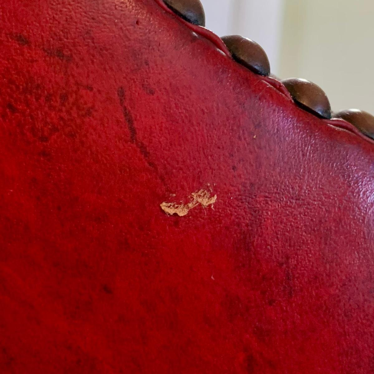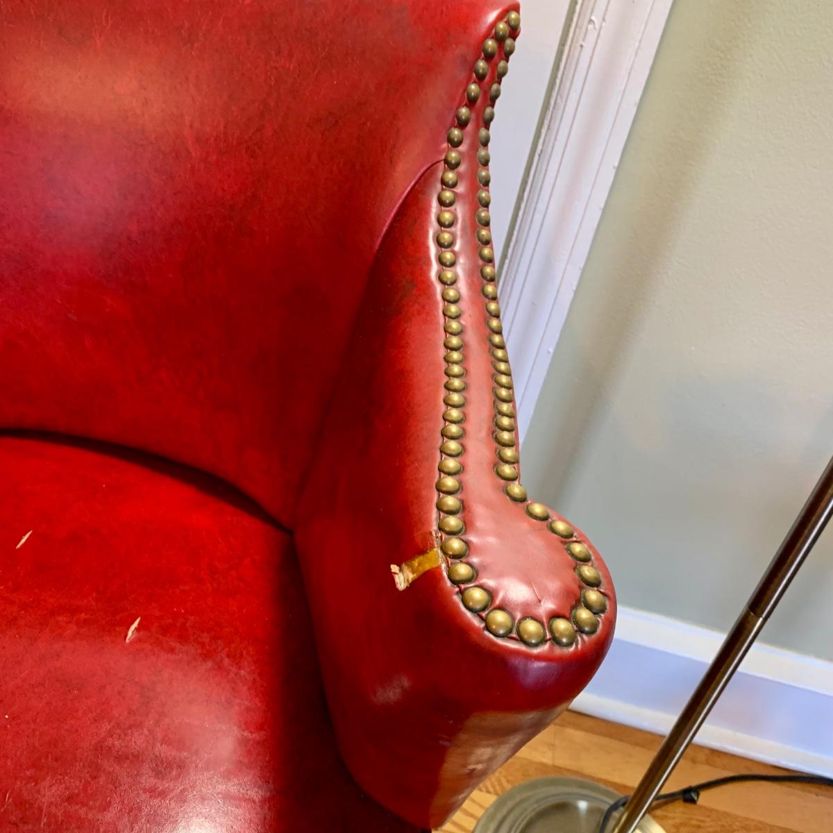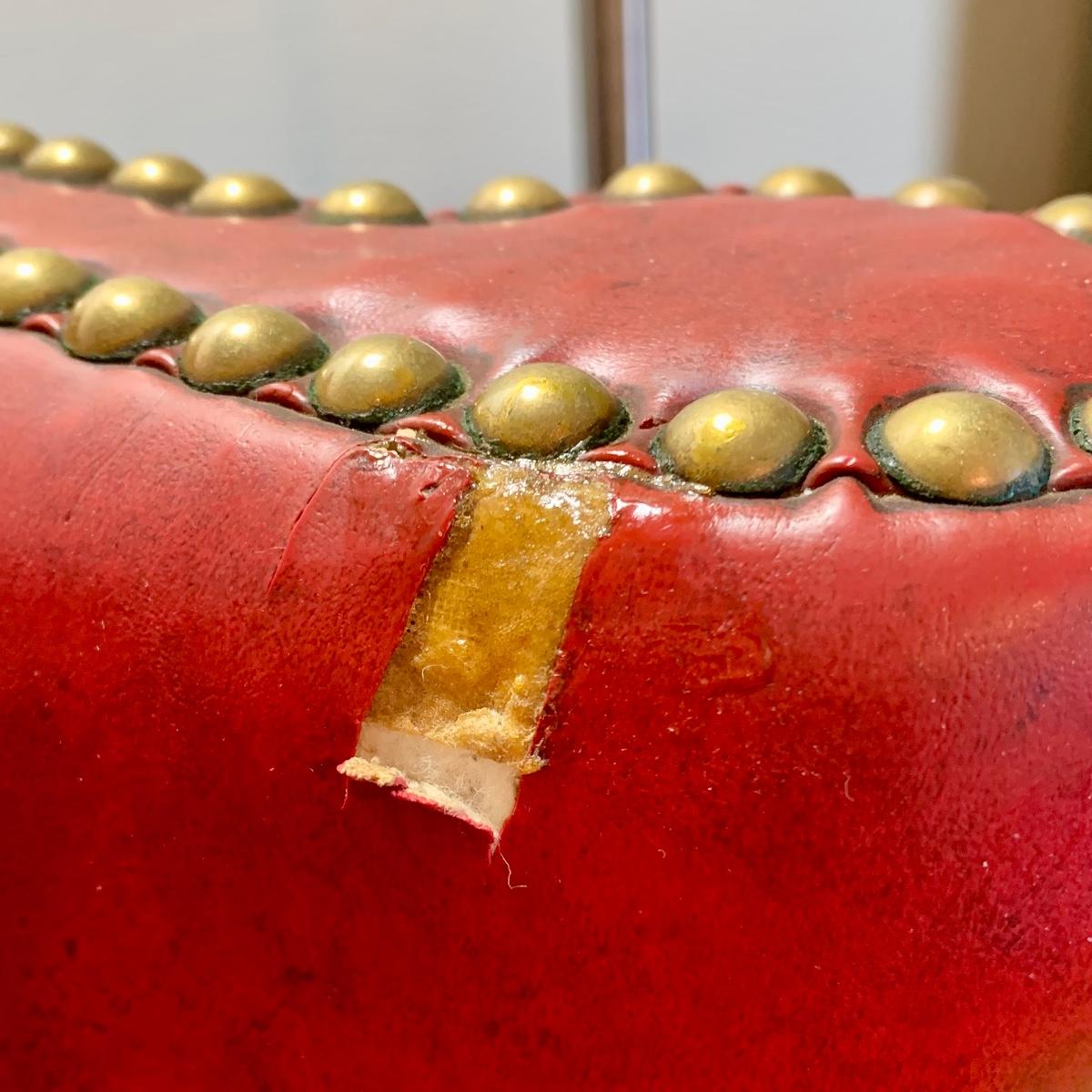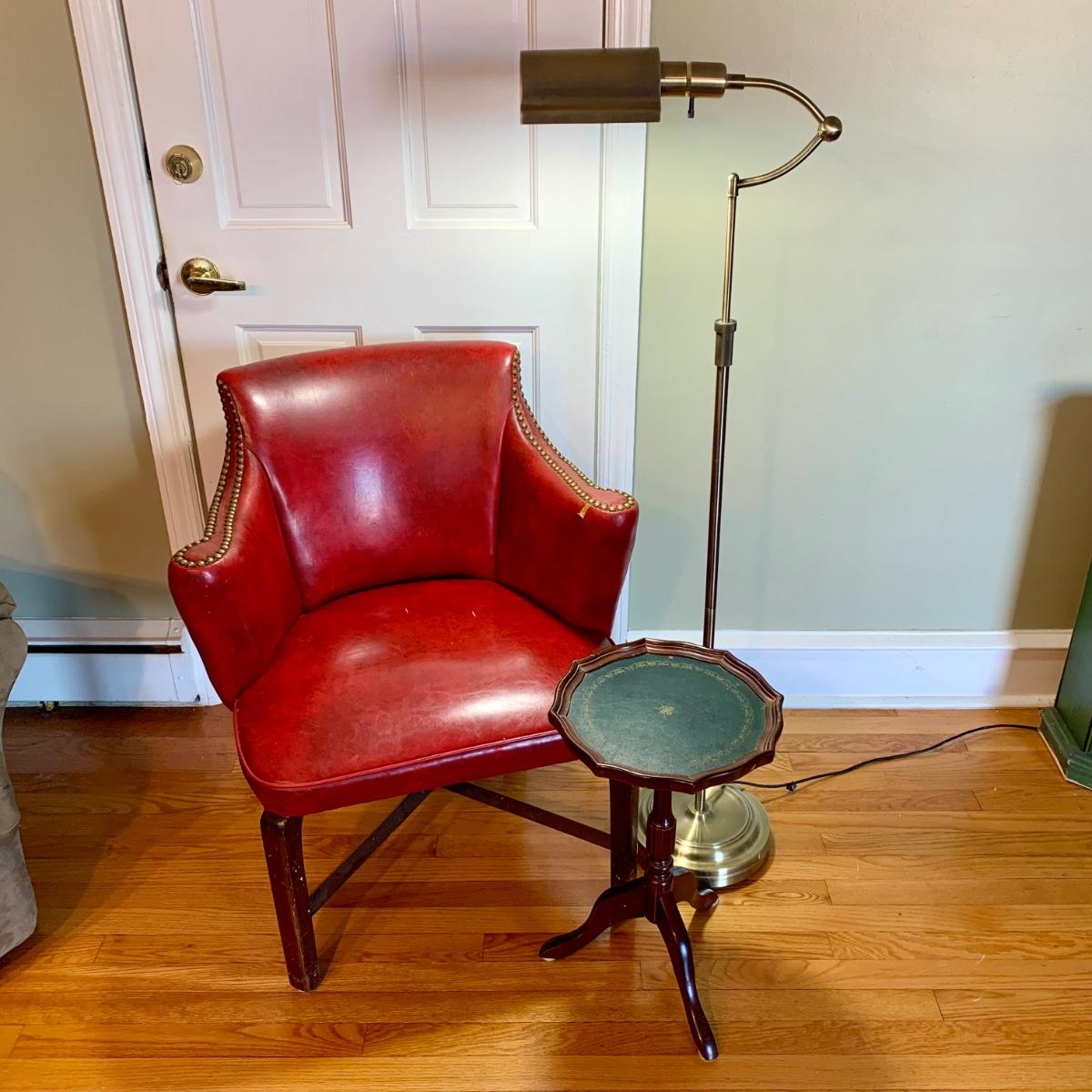LOT 149 L: Vintage Red Leather Nail Studded Chair, Bombay Co. Mahogany Green Leather Top Wine Table, & Brass Adjustable Pharmacy Style Floor Lamp