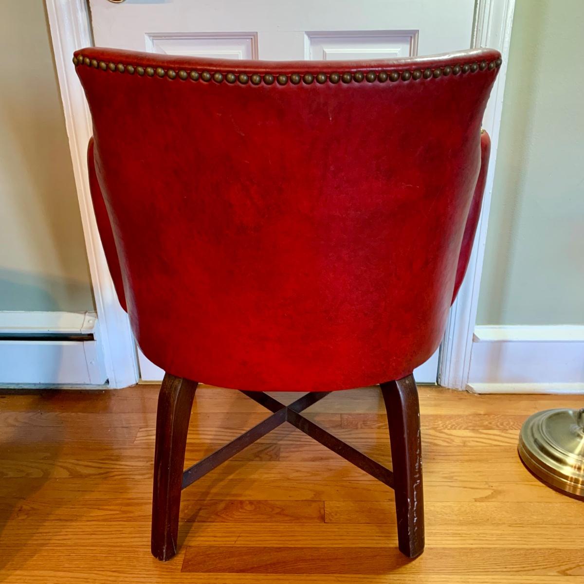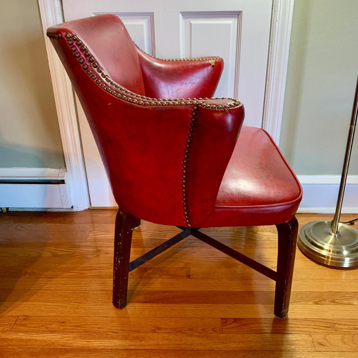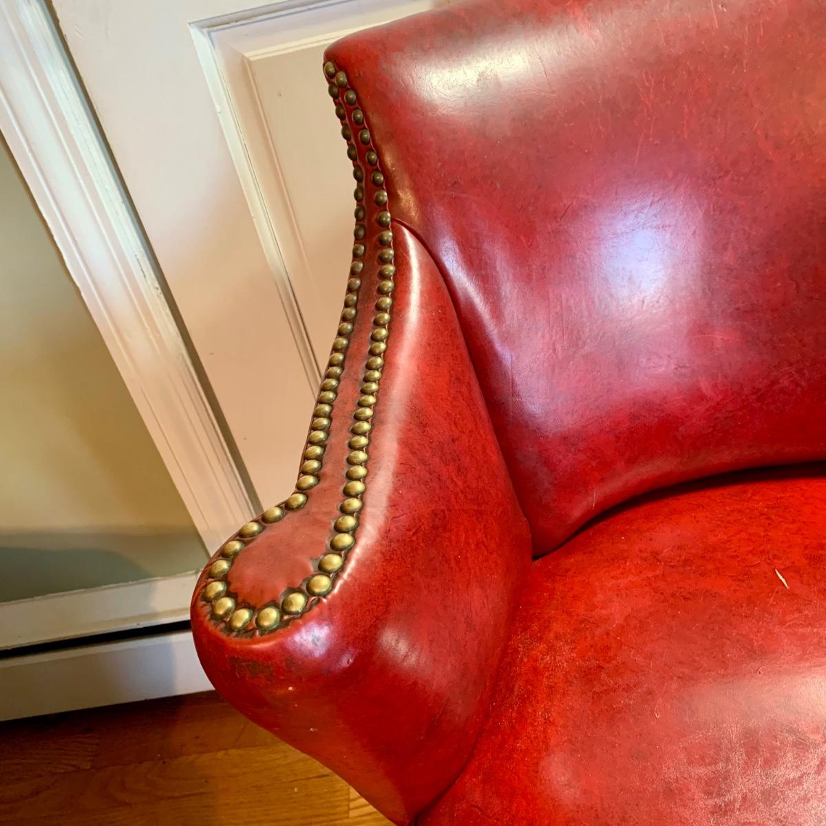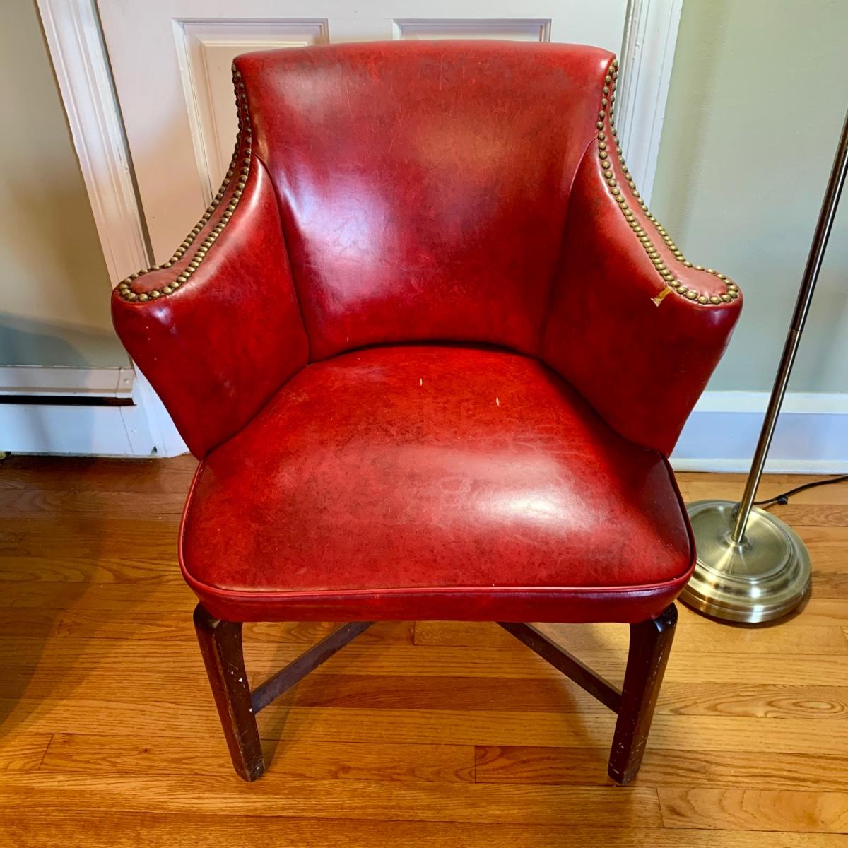 LOT 149 L: Vintage Red Leather Nail Studded Chair, Bombay Co. Mahogany Green Leather Top Wine Table, & Brass Adjustable Pharmacy Style Floor Lamp