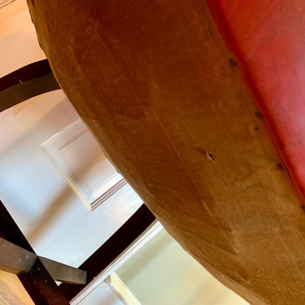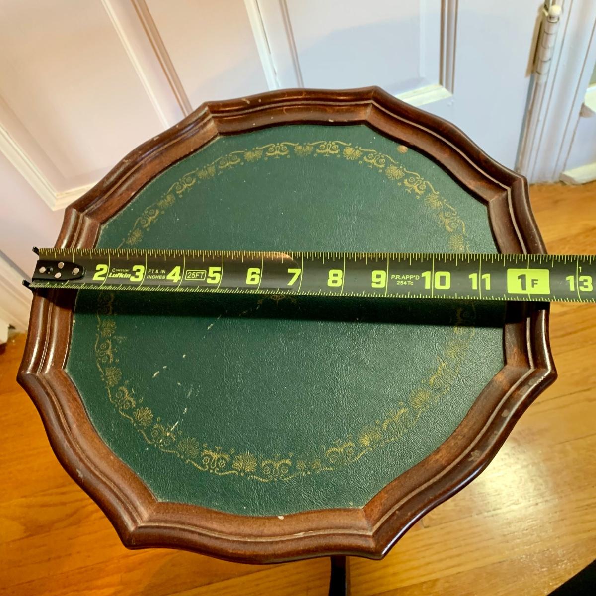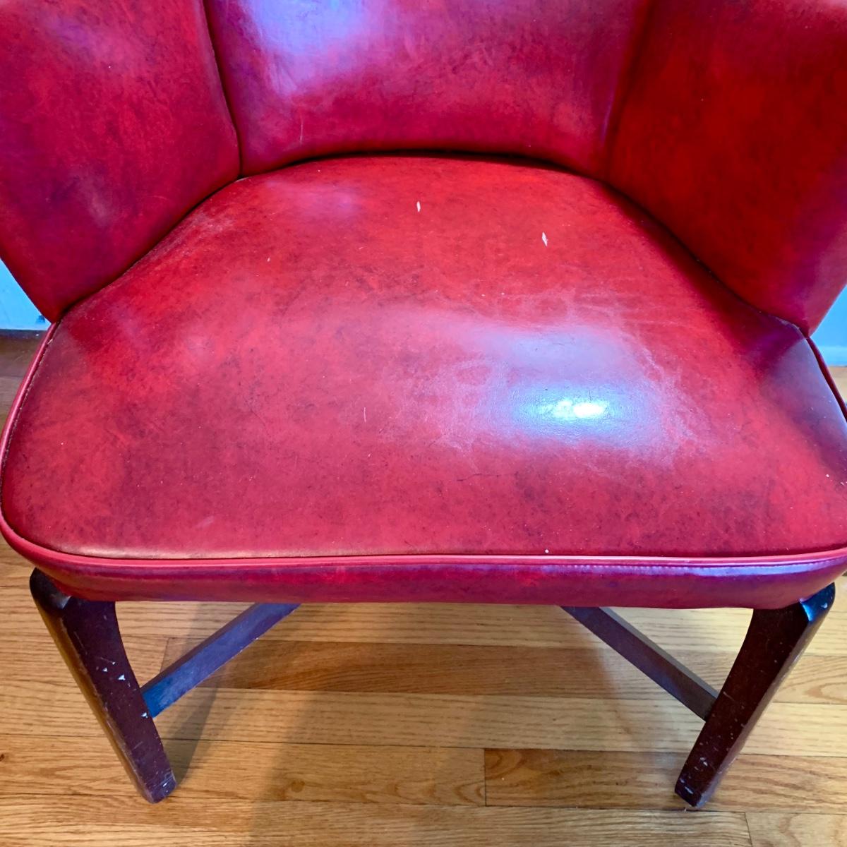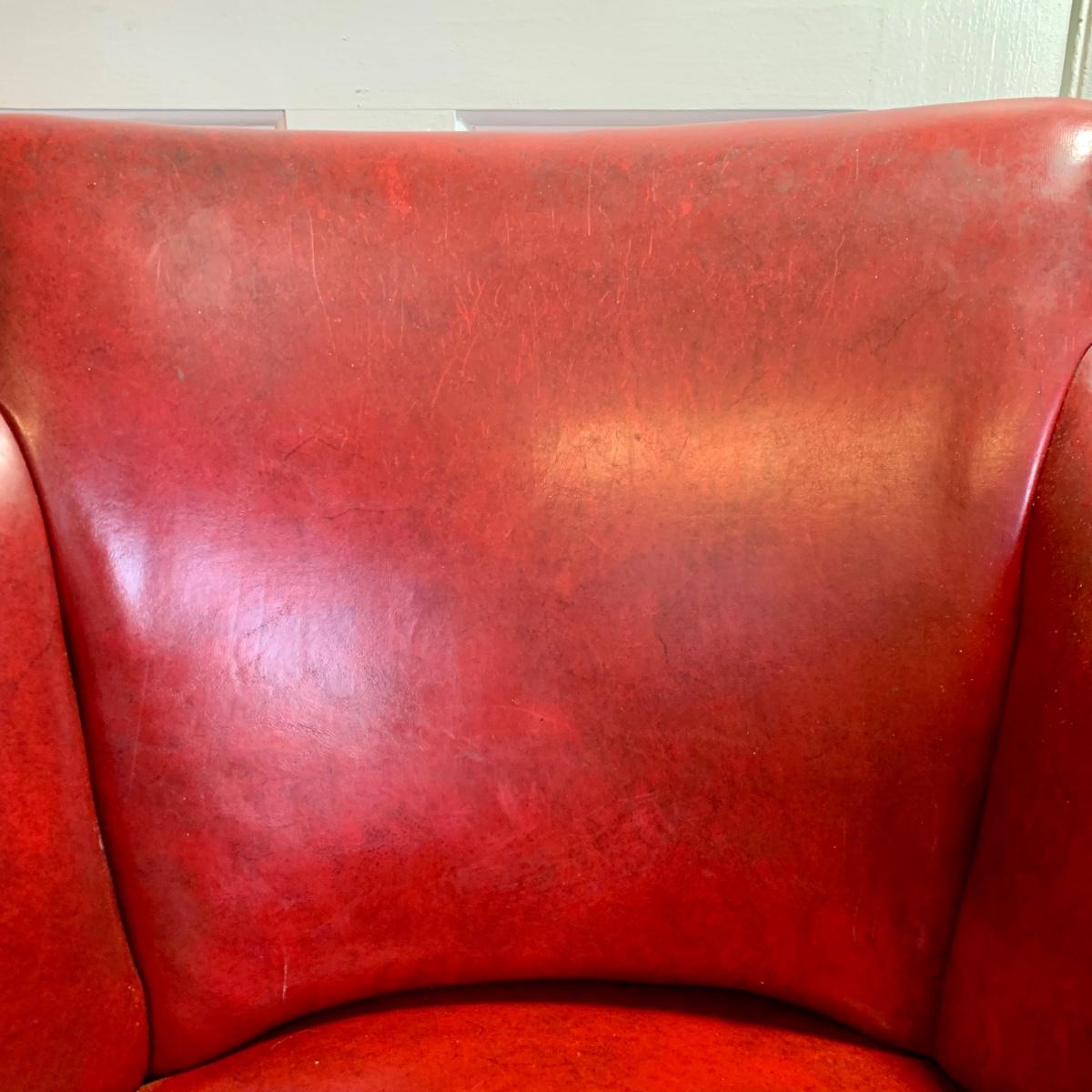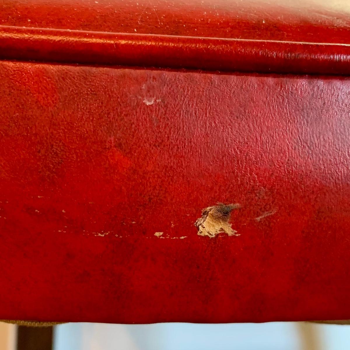 LOT 149 L: Vintage Red Leather Nail Studded Chair, Bombay Co. Mahogany Green Leather Top Wine Table, & Brass Adjustable Pharmacy Style Floor Lamp