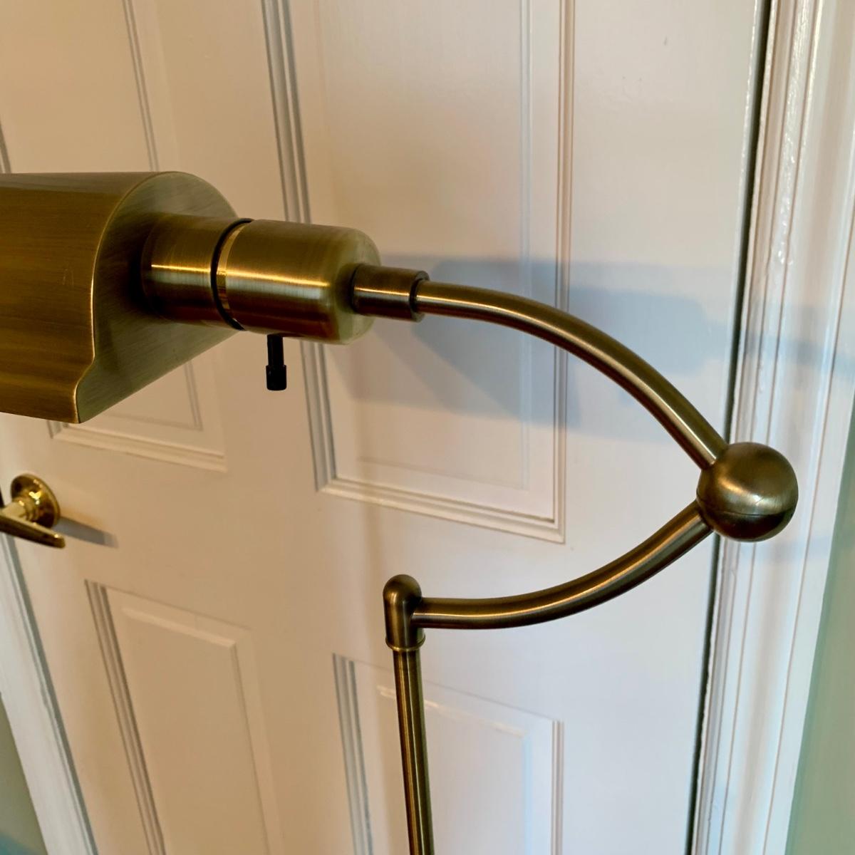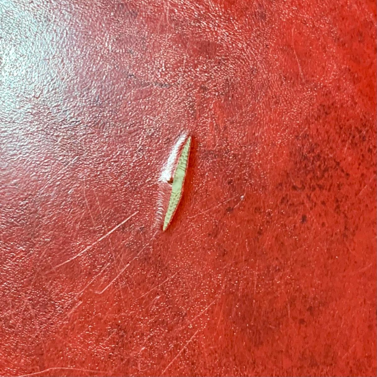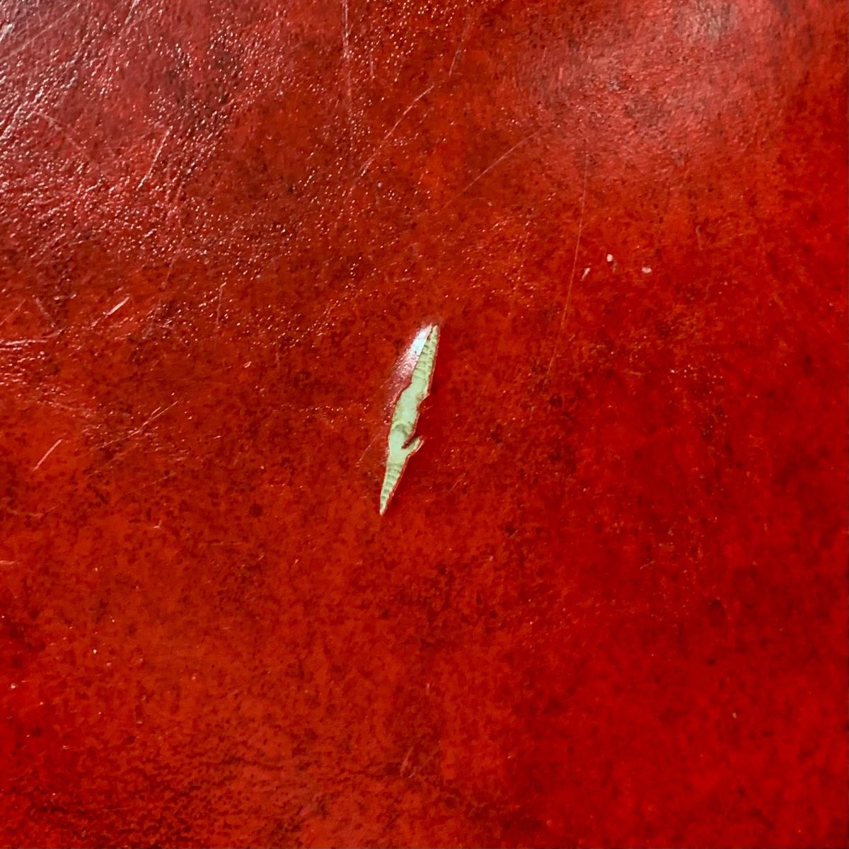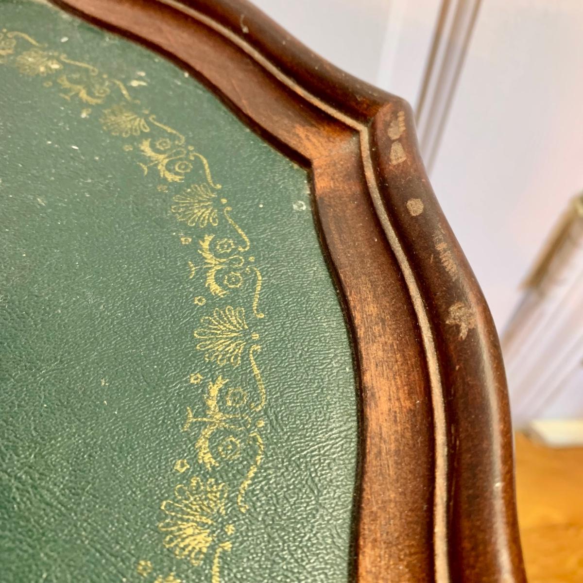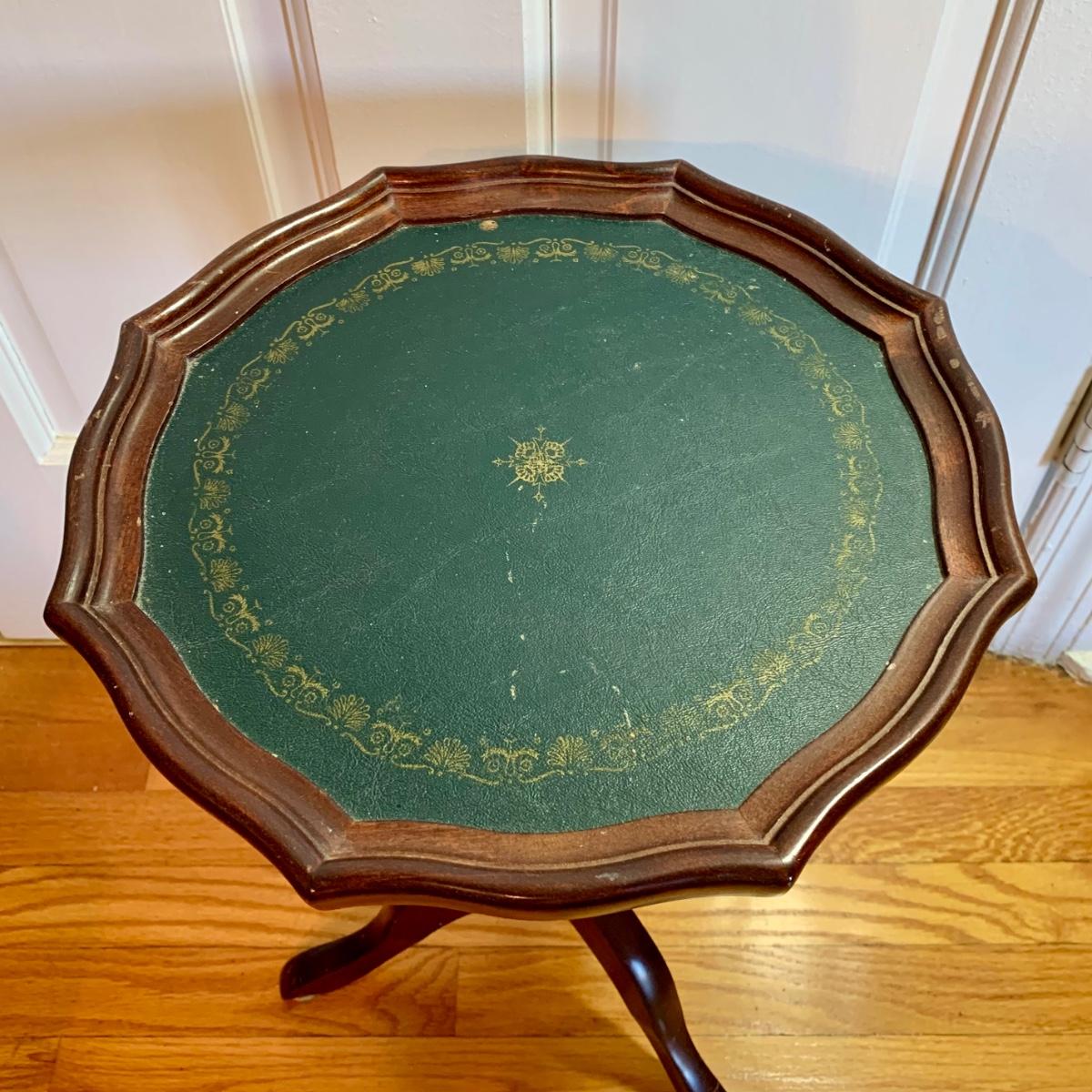LOT 149 L: Vintage Red Leather Nail Studded Chair, Bombay Co. Mahogany Green Leather Top Wine Table, & Brass Adjustable Pharmacy Style Floor Lamp