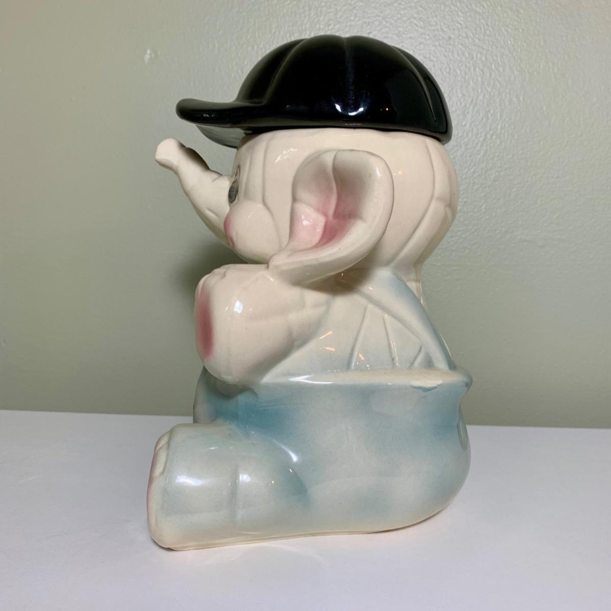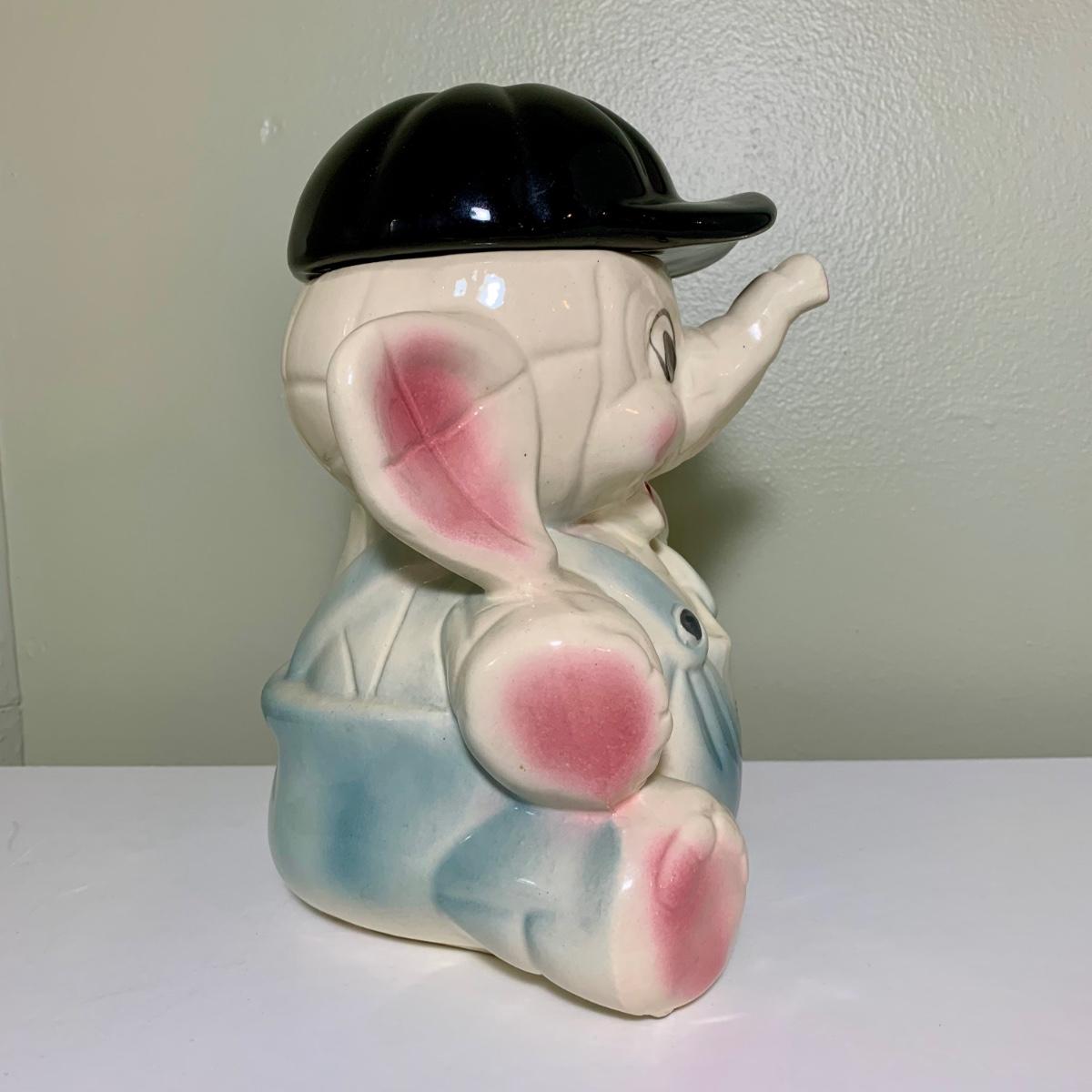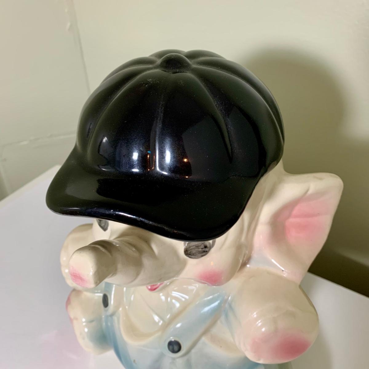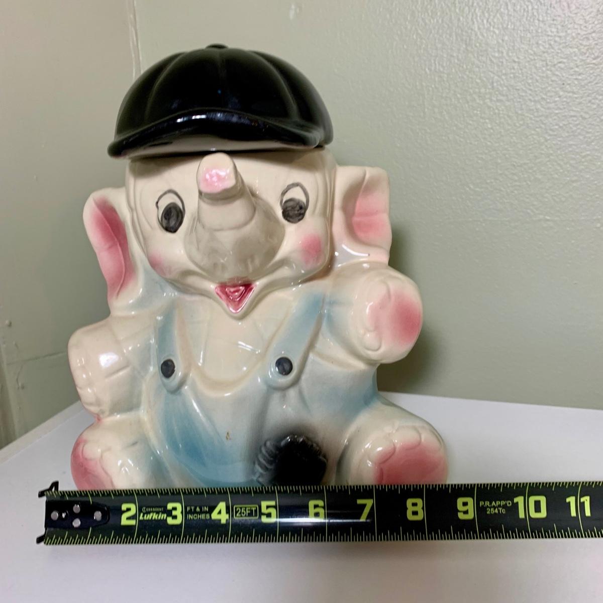 LOT 152 K: 1950's American Bisque Baby Elephant w/ Baseball Hat & Overalls Cookie Jar