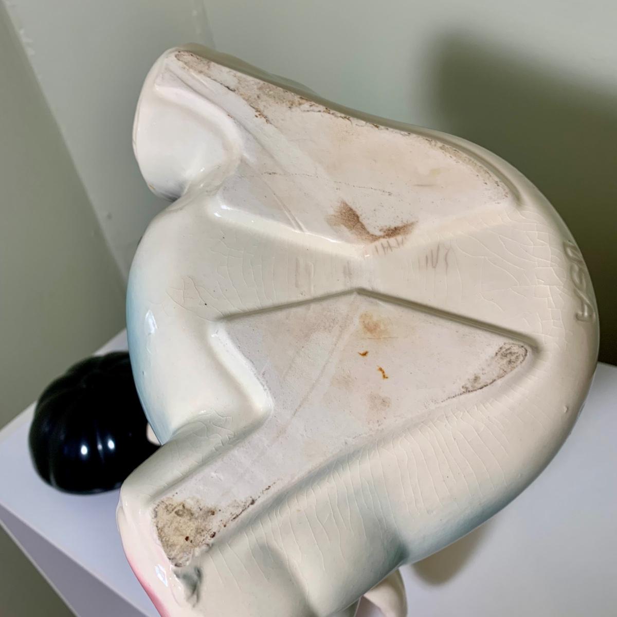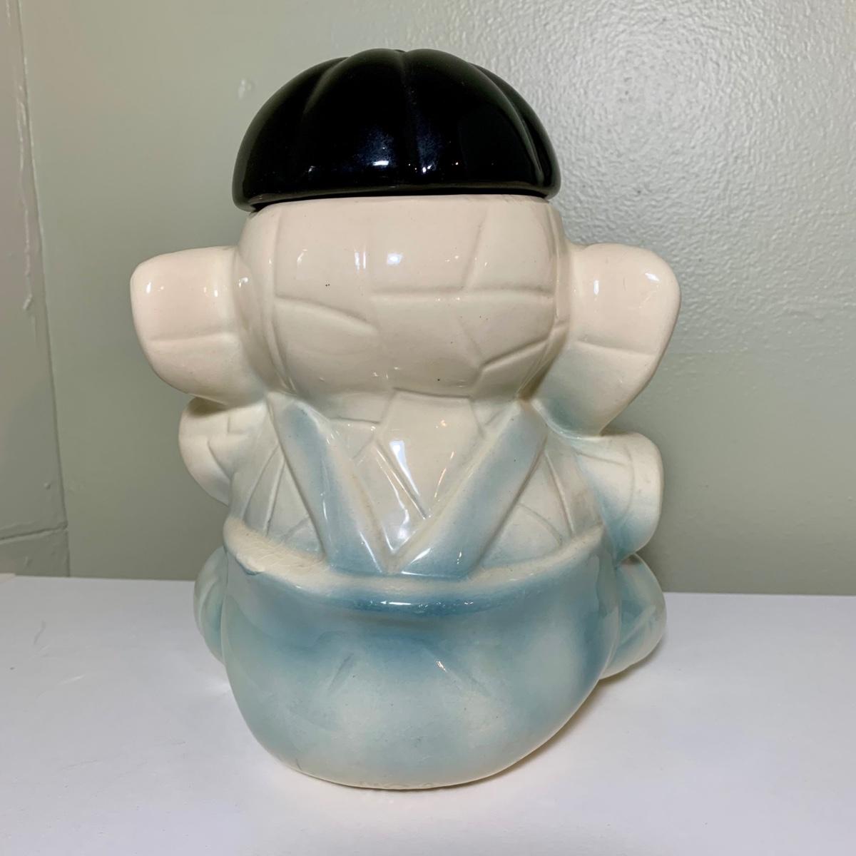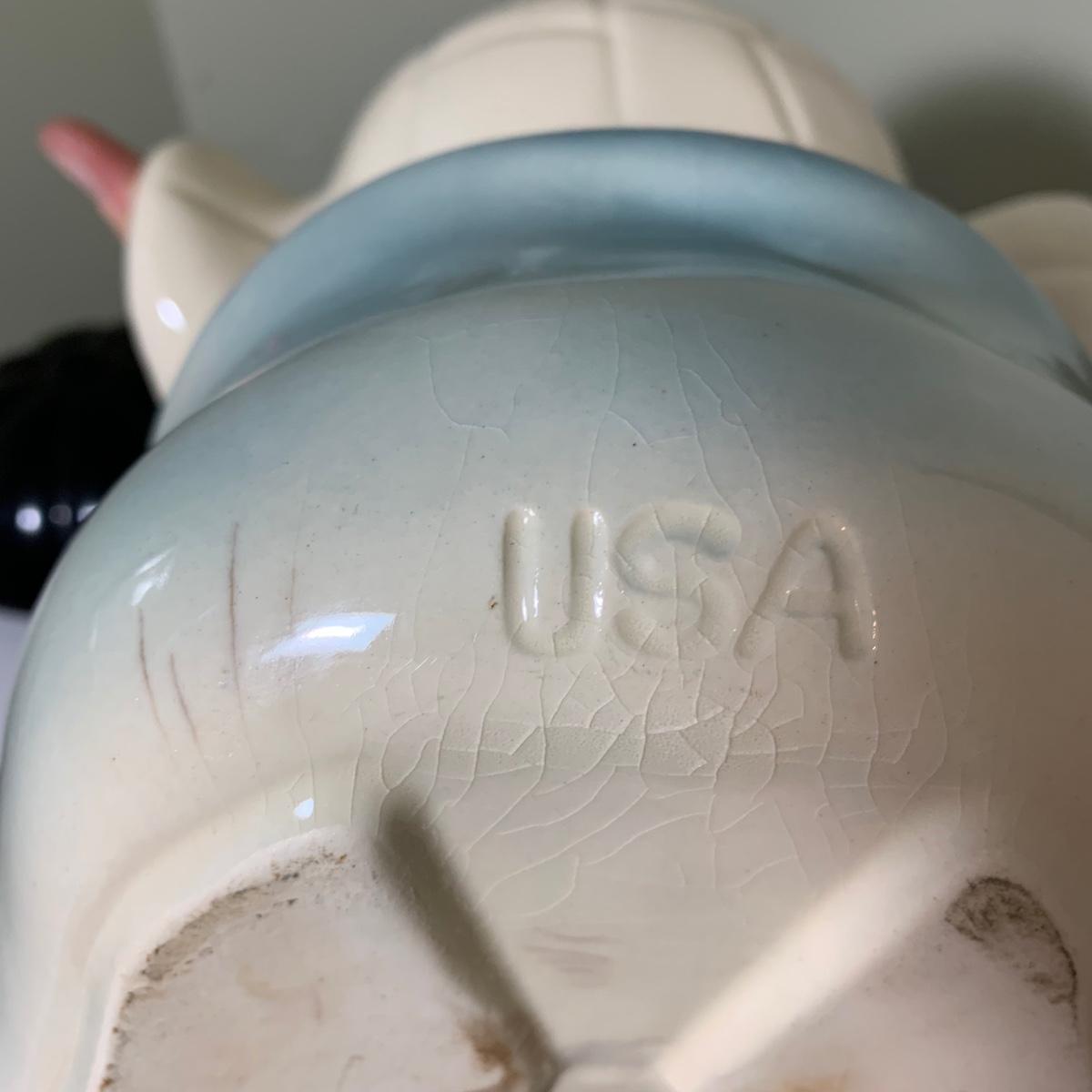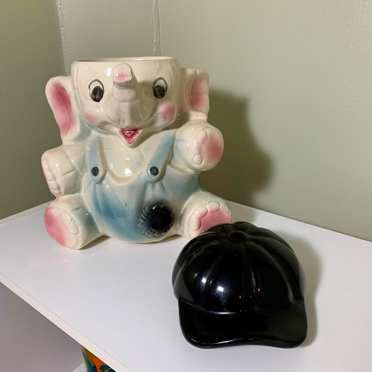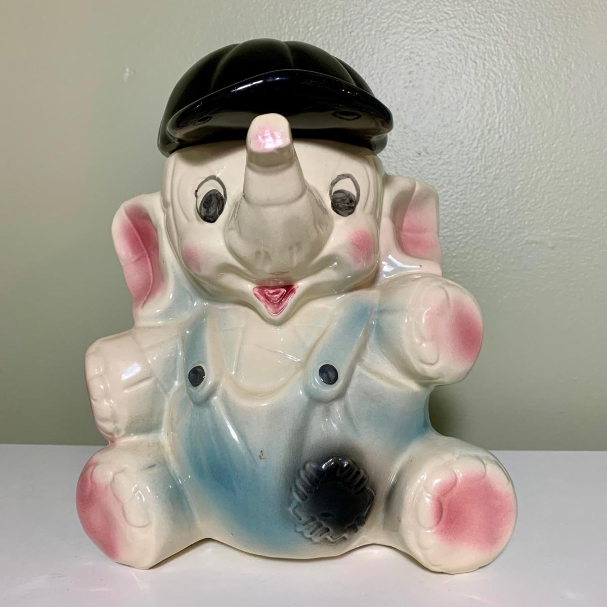 LOT 152 K: 1950's American Bisque Baby Elephant w/ Baseball Hat & Overalls Cookie Jar