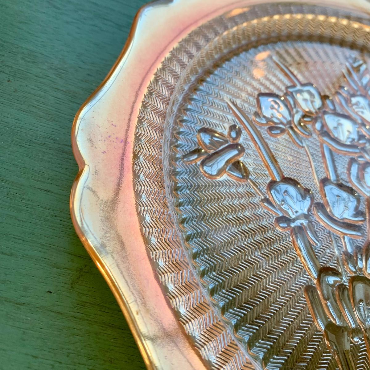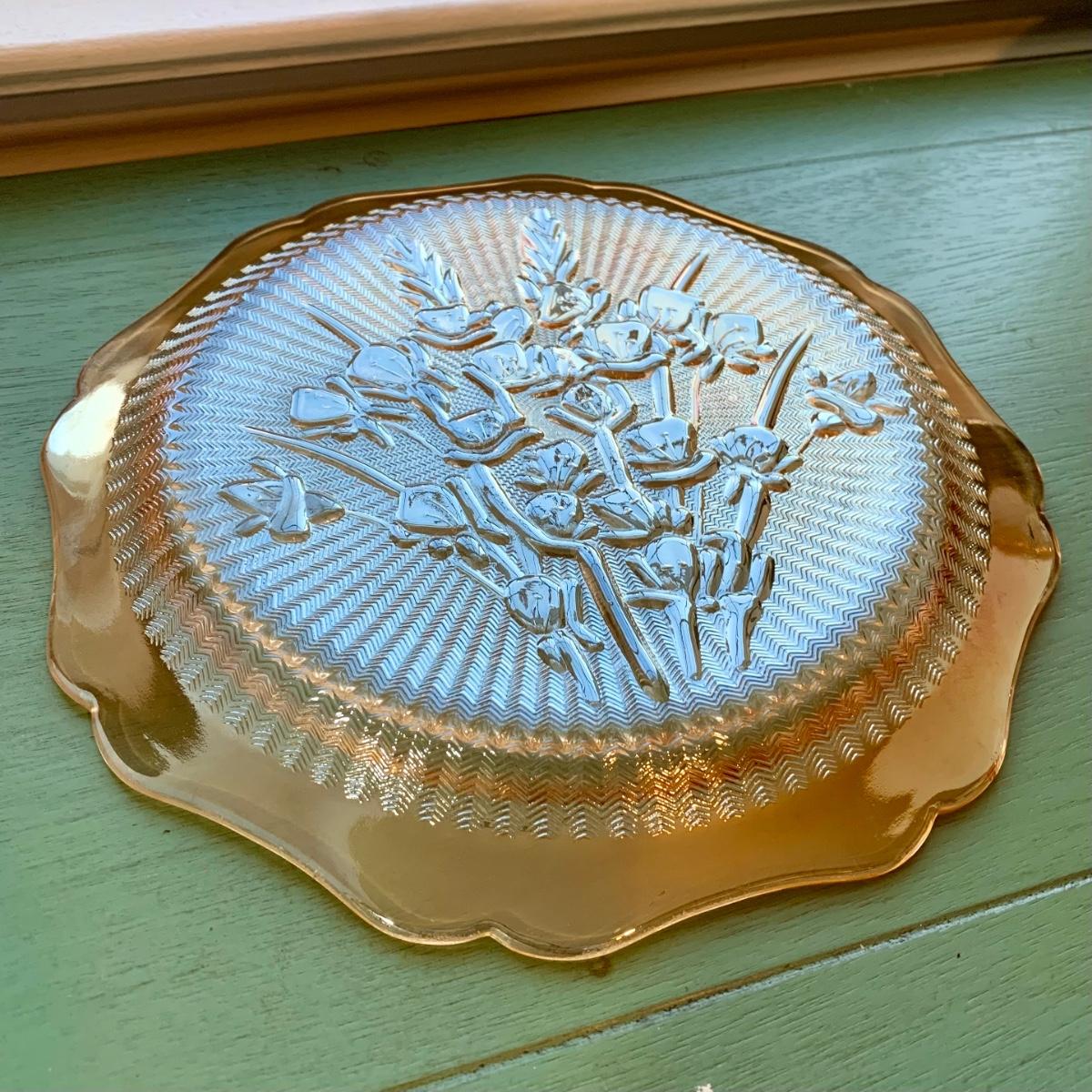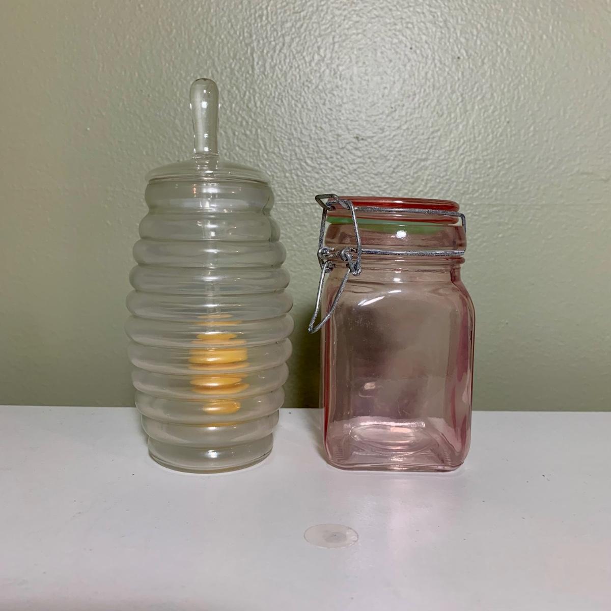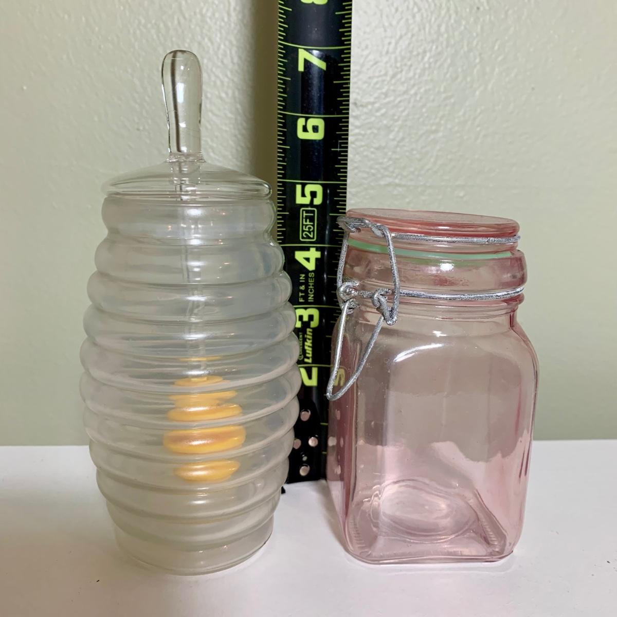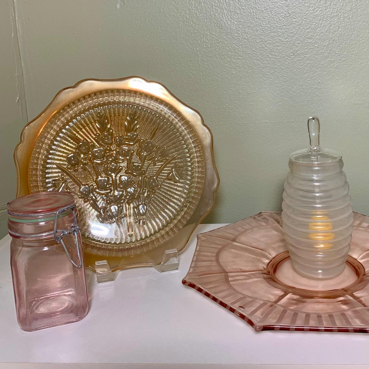 LOT 153 K: Jeannette Iris & Herringbone Marigold Carnival Glass Plate, Pink Depression Glass Plate, Pink Glass Rectangle Seal Canister, & Crate & Barrel Clear Ribbed Glass Honey Jar w/ Silicone Dipper