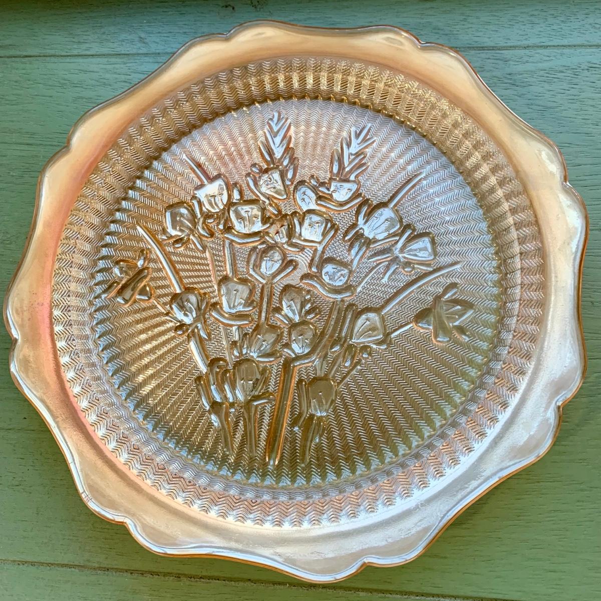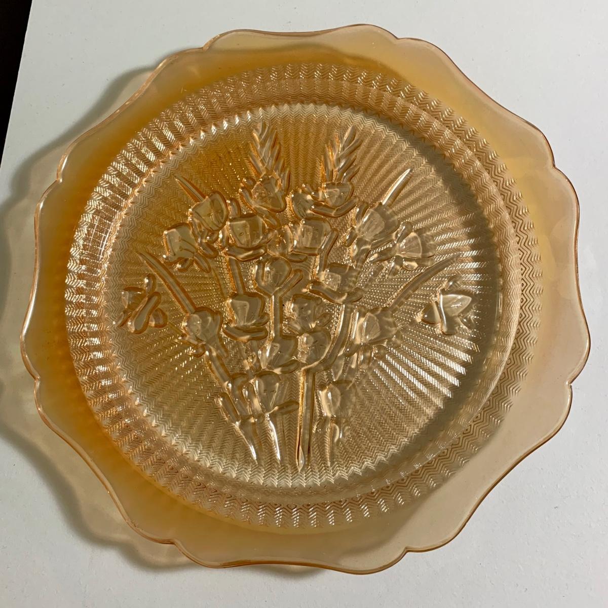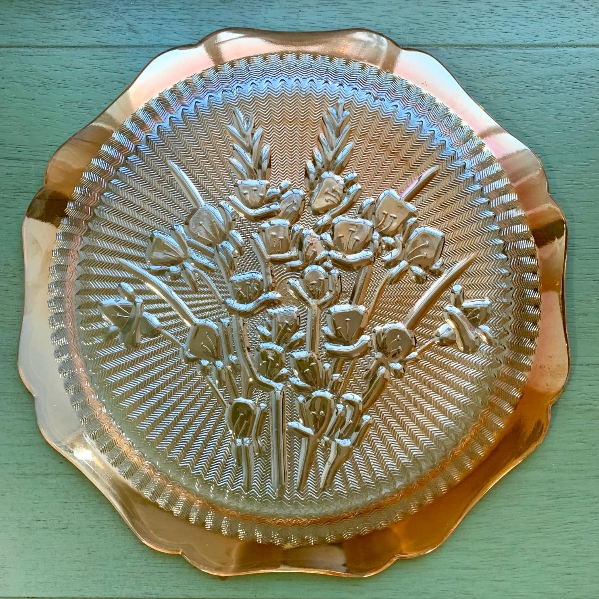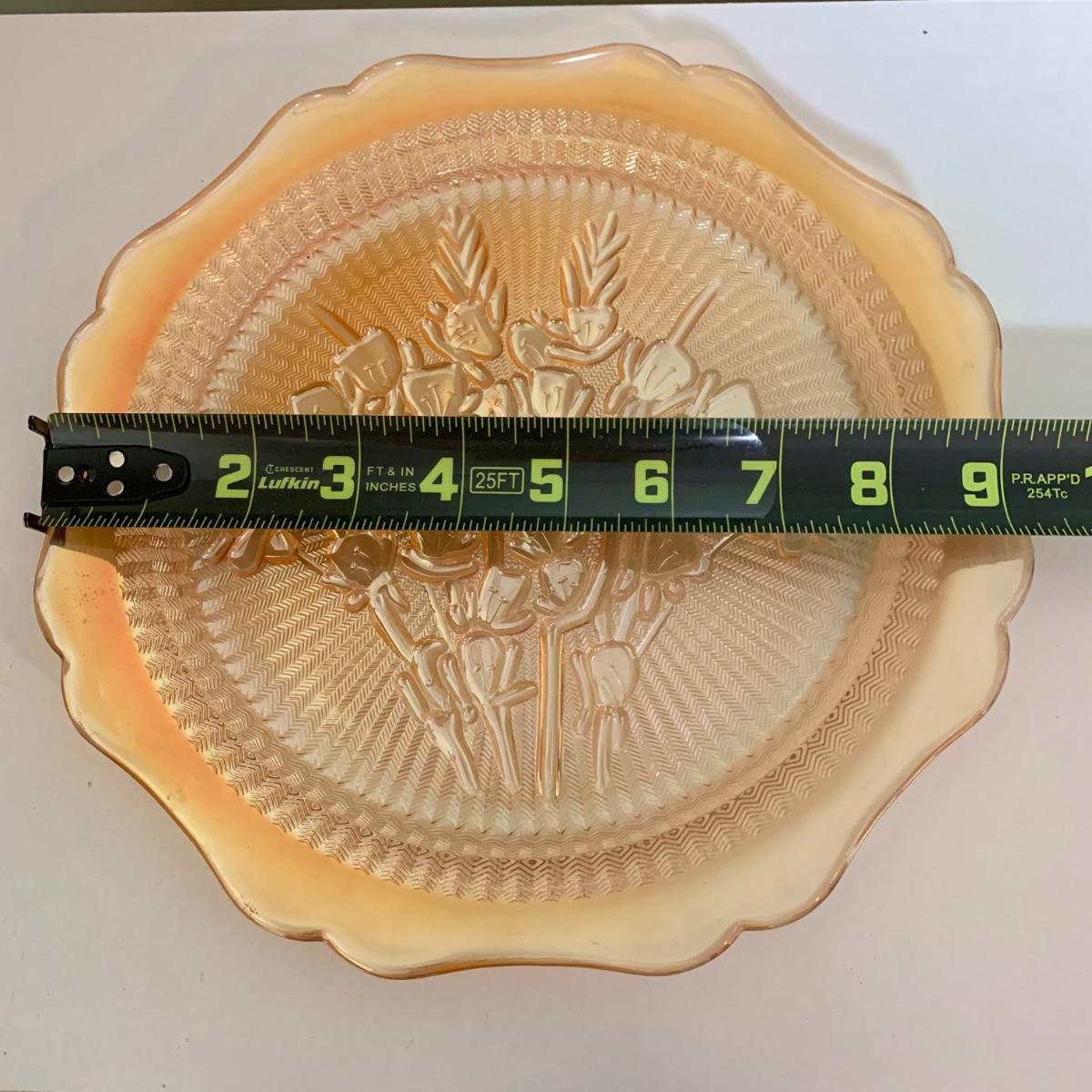 LOT 153 K: Jeannette Iris & Herringbone Marigold Carnival Glass Plate, Pink Depression Glass Plate, Pink Glass Rectangle Seal Canister, & Crate & Barrel Clear Ribbed Glass Honey Jar w/ Silicone Dipper