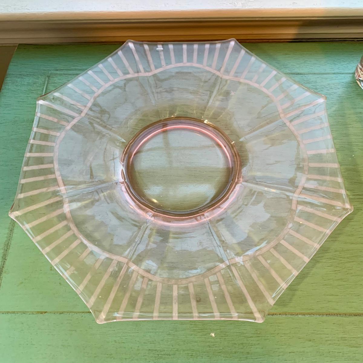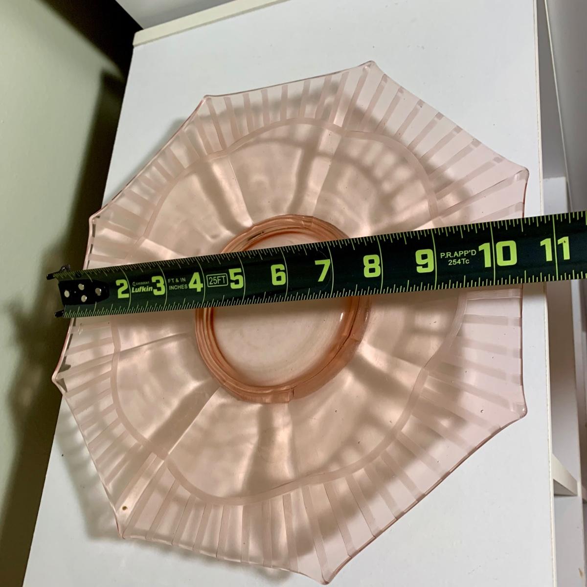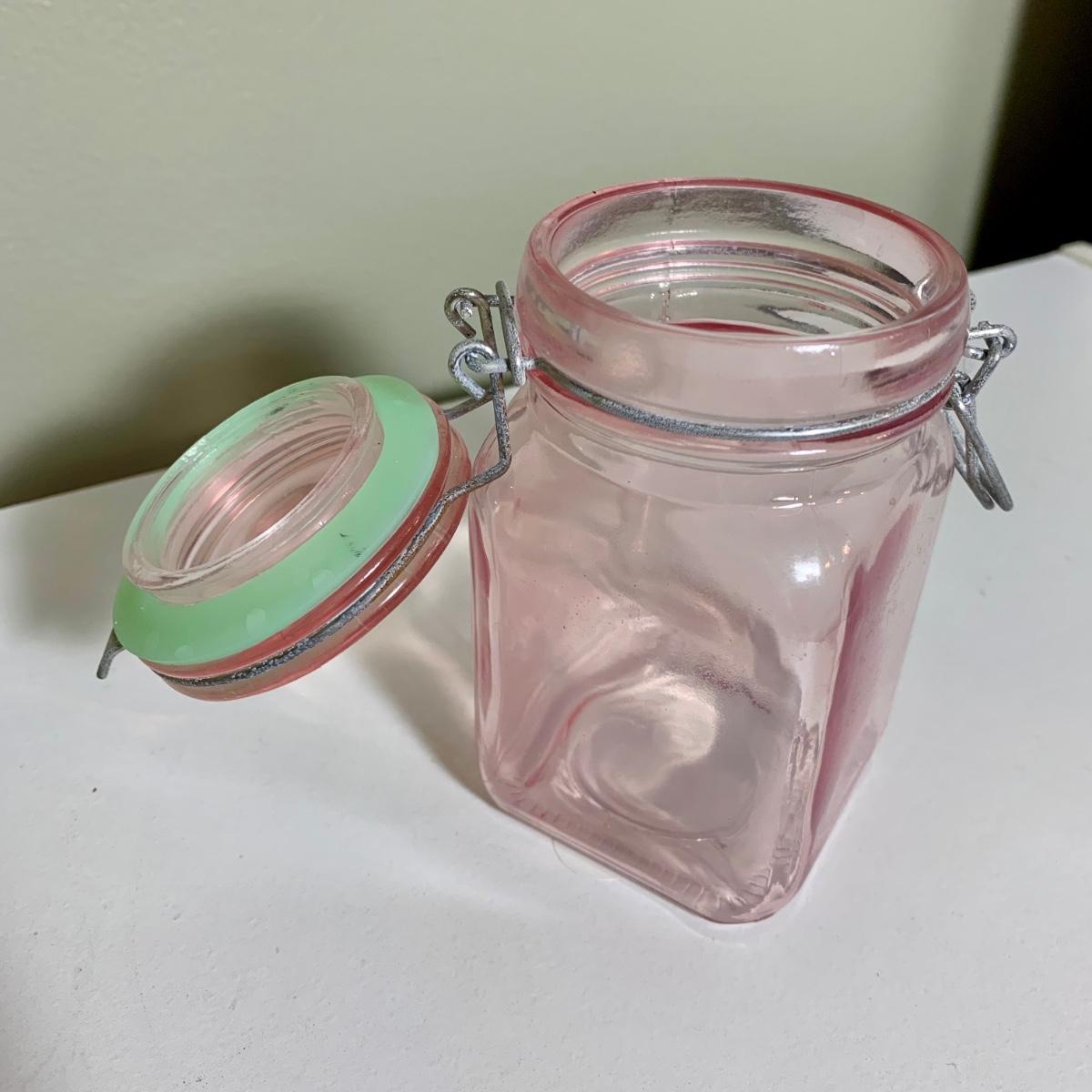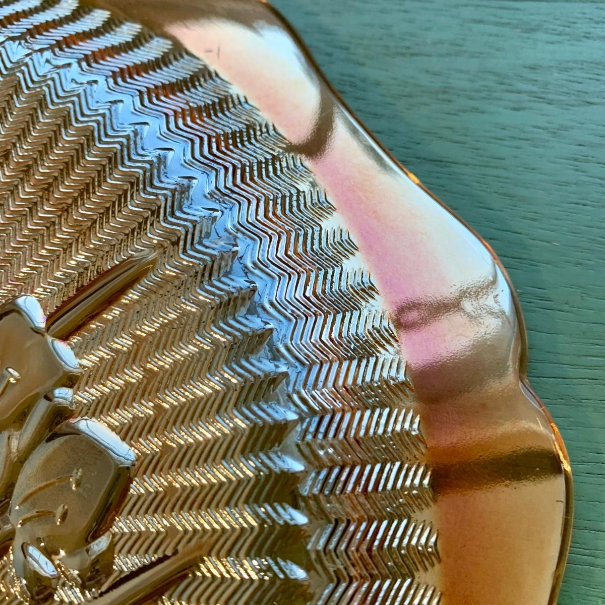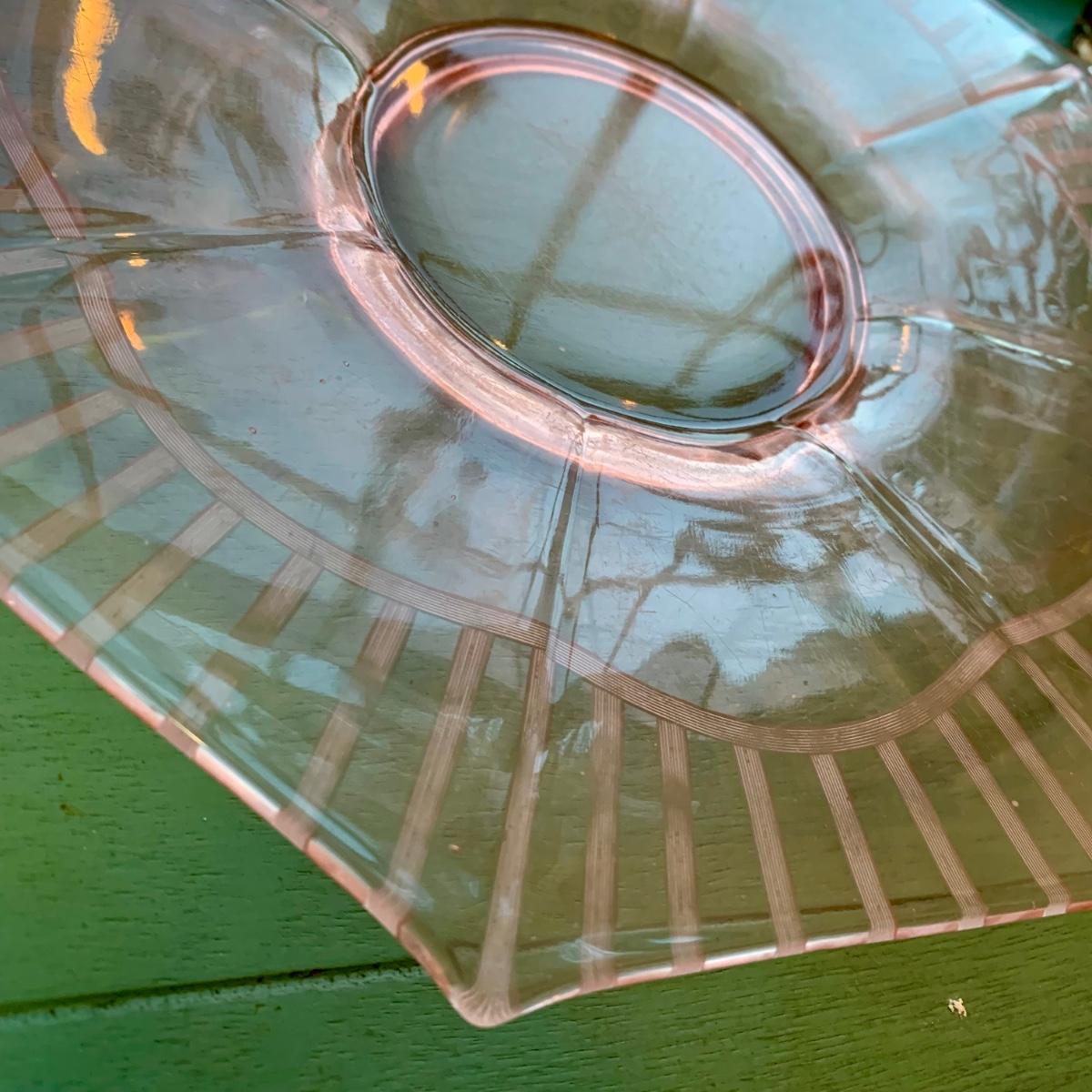 LOT 153 K: Jeannette Iris & Herringbone Marigold Carnival Glass Plate, Pink Depression Glass Plate, Pink Glass Rectangle Seal Canister, & Crate & Barrel Clear Ribbed Glass Honey Jar w/ Silicone Dipper