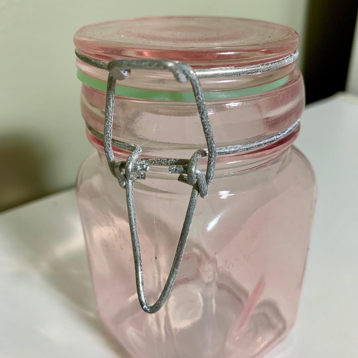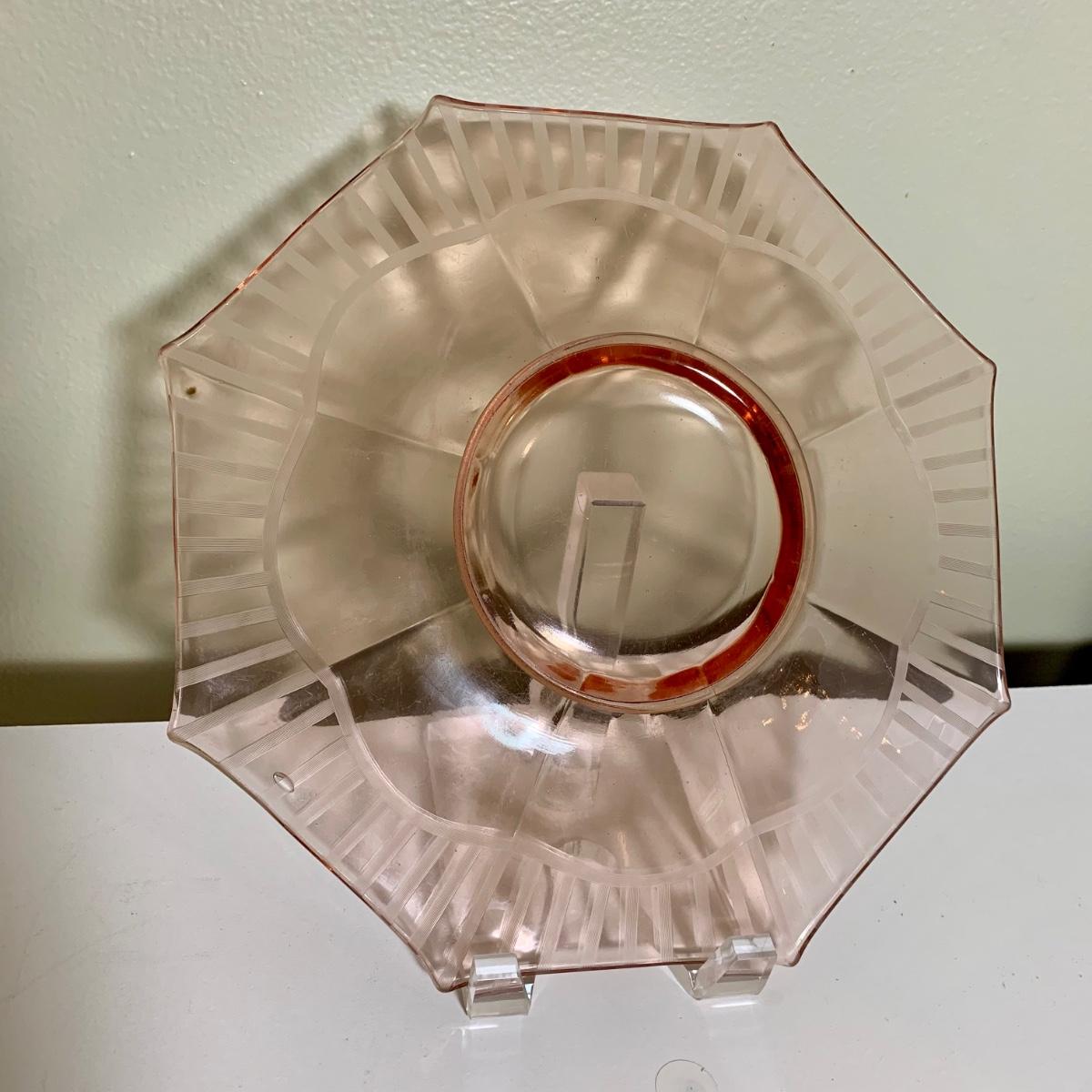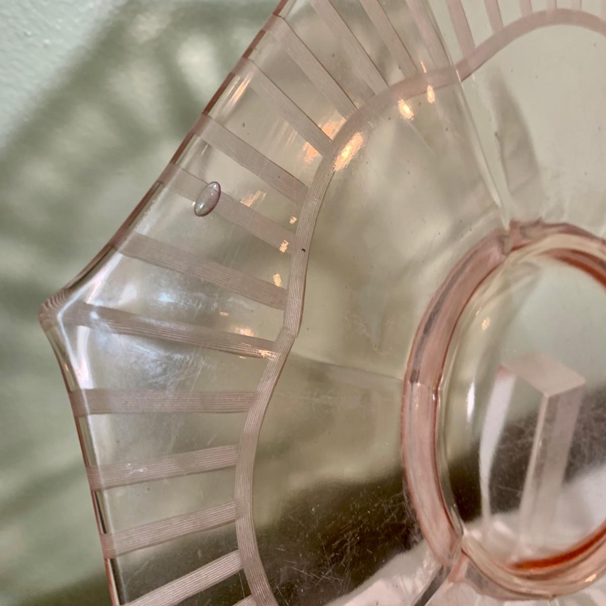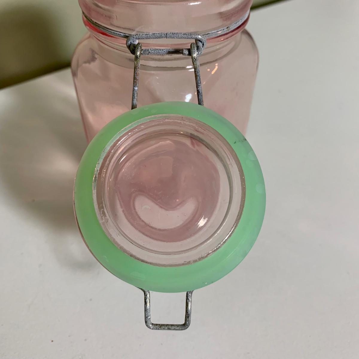 LOT 153 K: Jeannette Iris & Herringbone Marigold Carnival Glass Plate, Pink Depression Glass Plate, Pink Glass Rectangle Seal Canister, & Crate & Barrel Clear Ribbed Glass Honey Jar w/ Silicone Dipper