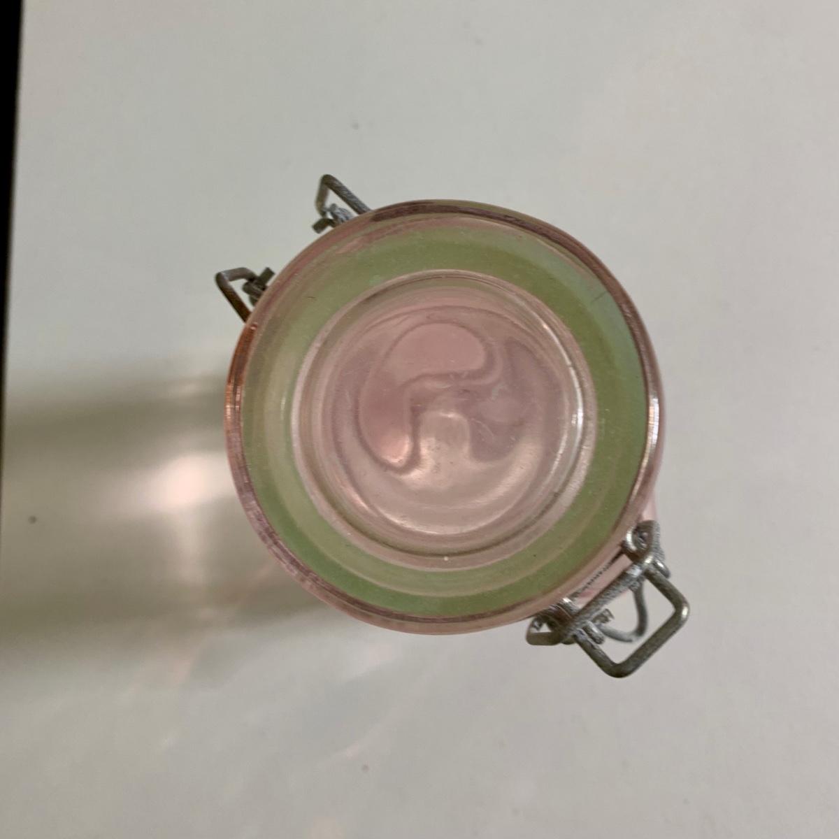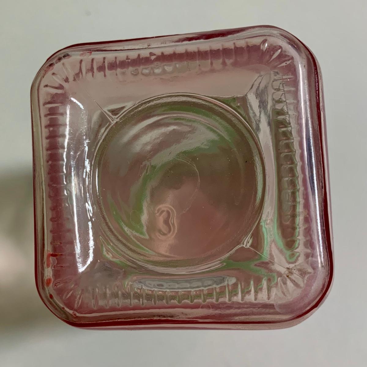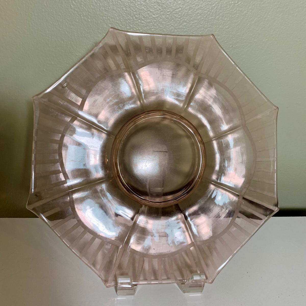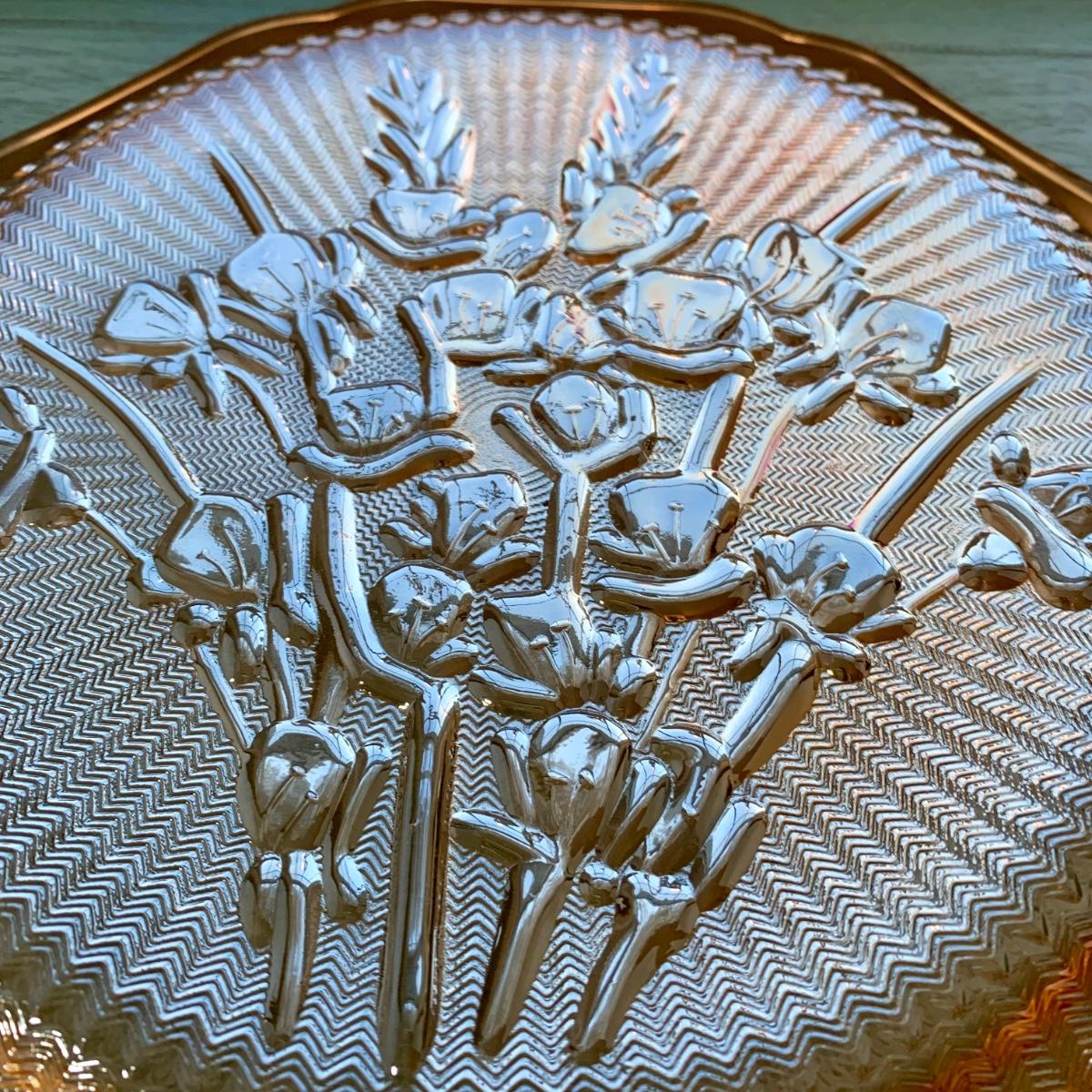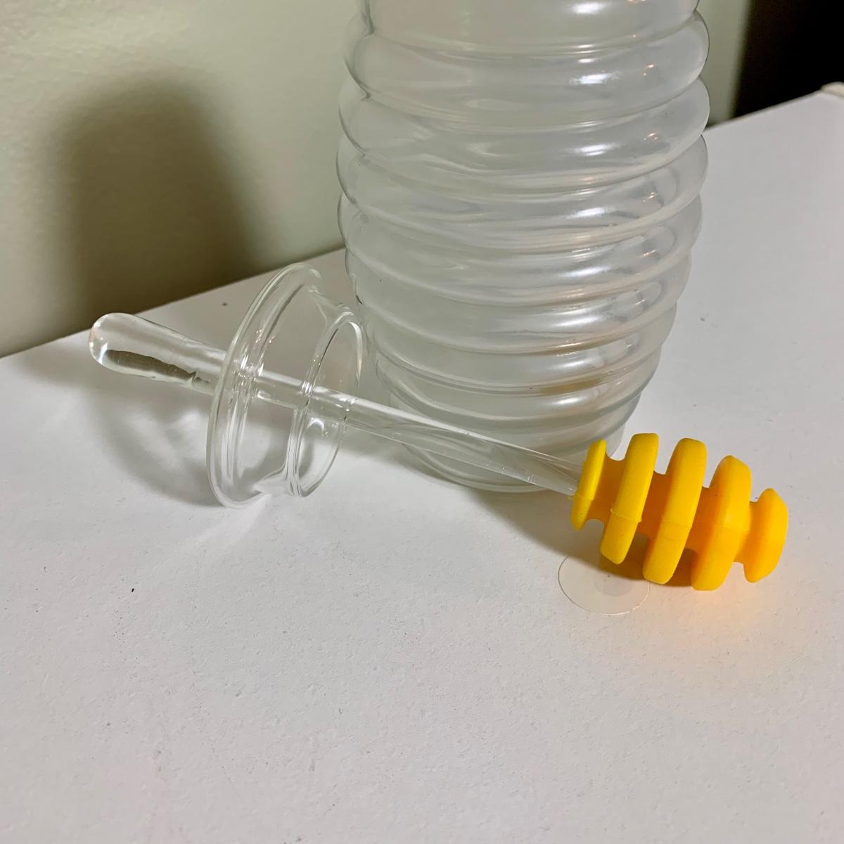 LOT 153 K: Jeannette Iris & Herringbone Marigold Carnival Glass Plate, Pink Depression Glass Plate, Pink Glass Rectangle Seal Canister, & Crate & Barrel Clear Ribbed Glass Honey Jar w/ Silicone Dipper