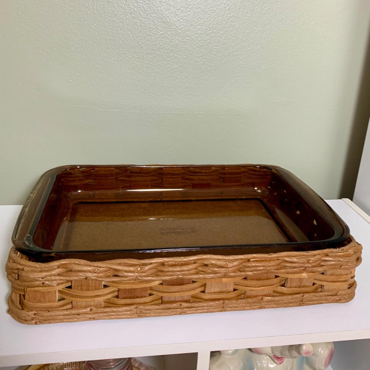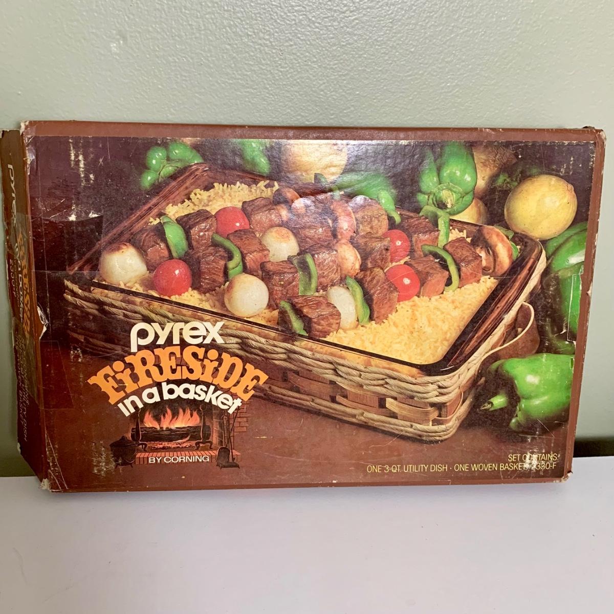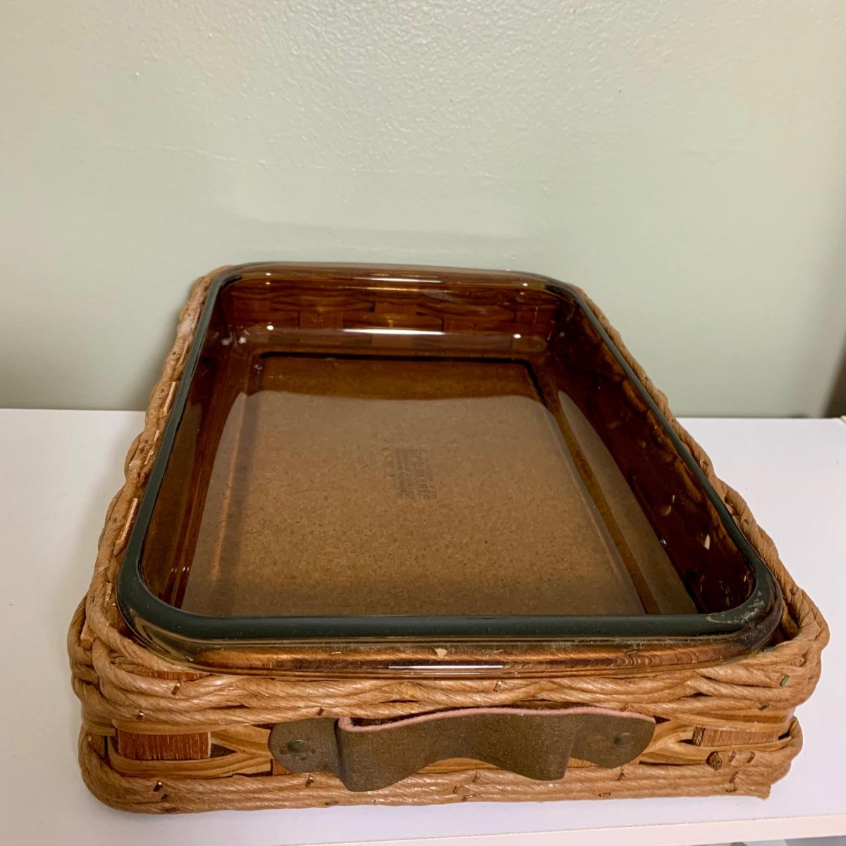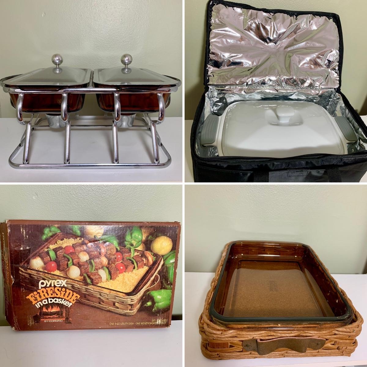 LOT 158 K: Wolfgang Puck 3 QT Casserole Dish w/ Insulated Travel Case, Pyrex Fireside In A Basket 3 QT Utility Dish w/ Woven Basket, & Anchor Hoking Fire King Double 1.5 QT Food Warmer / Serving Set