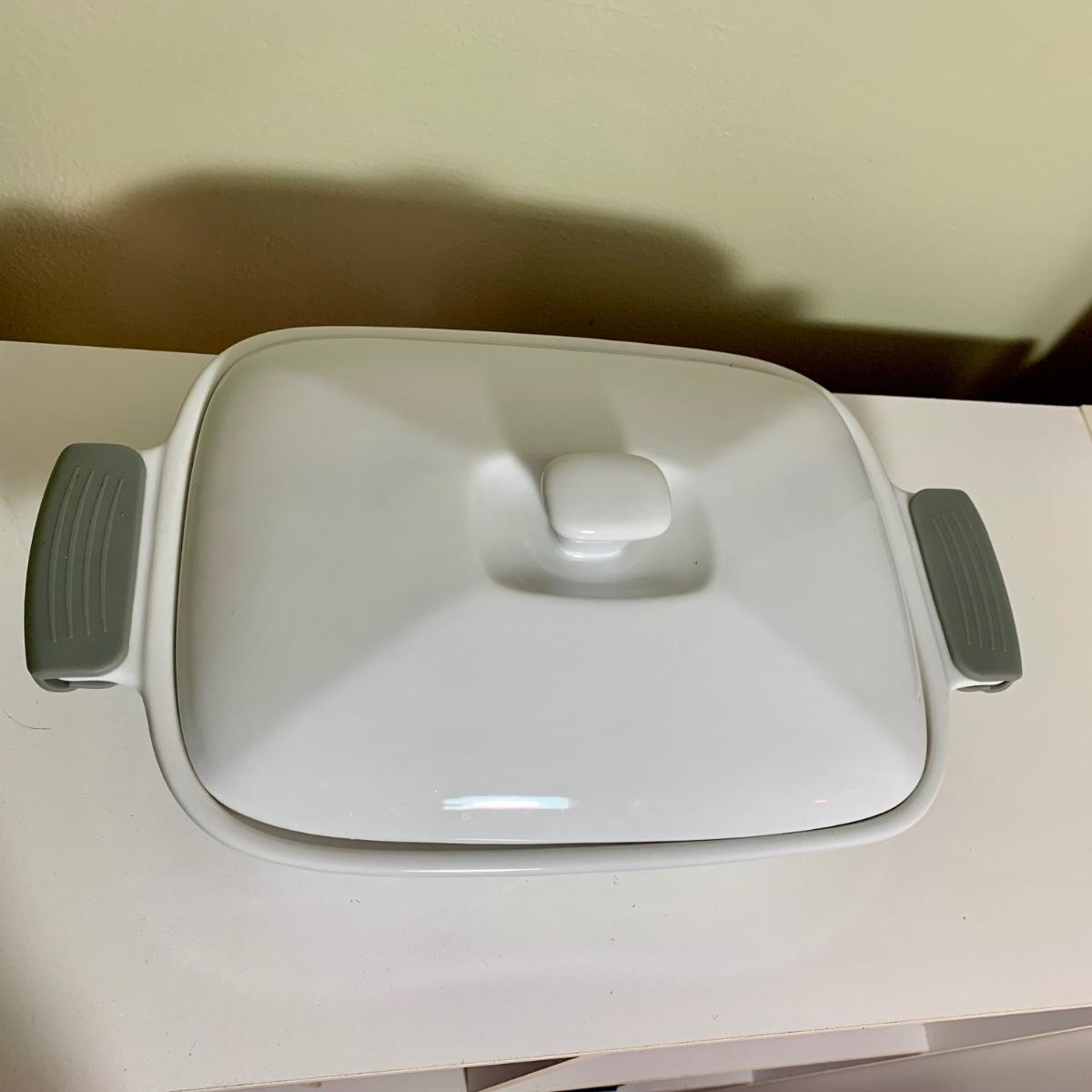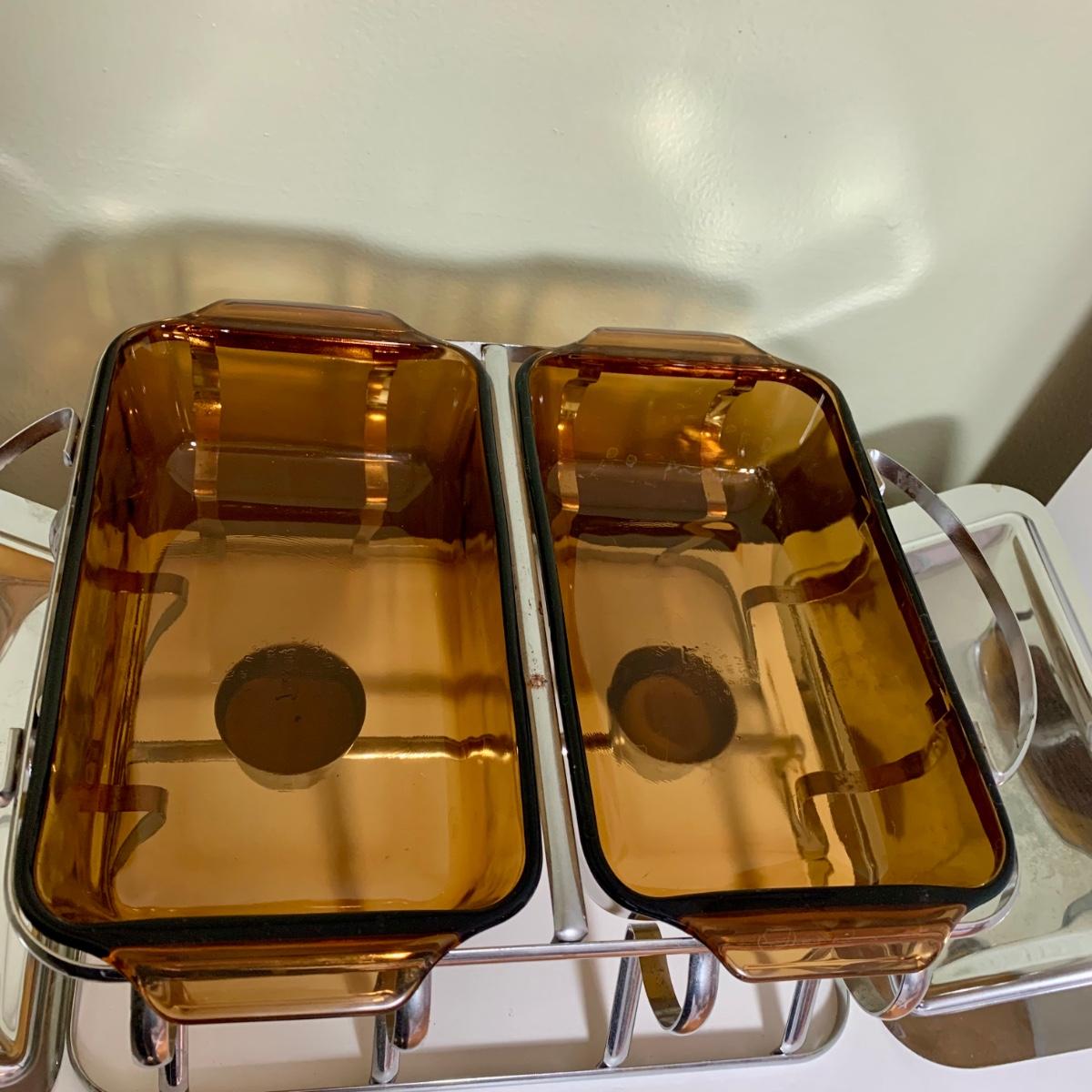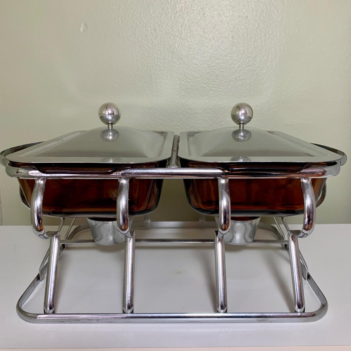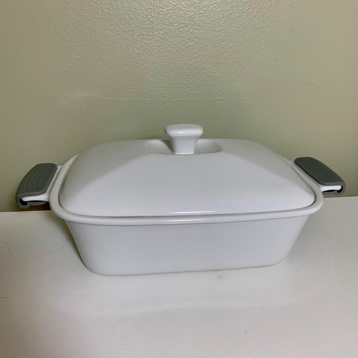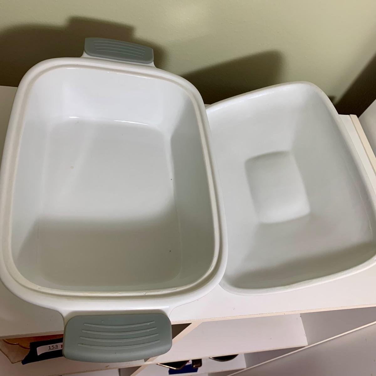 LOT 158 K: Wolfgang Puck 3 QT Casserole Dish w/ Insulated Travel Case, Pyrex Fireside In A Basket 3 QT Utility Dish w/ Woven Basket, & Anchor Hoking Fire King Double 1.5 QT Food Warmer / Serving Set