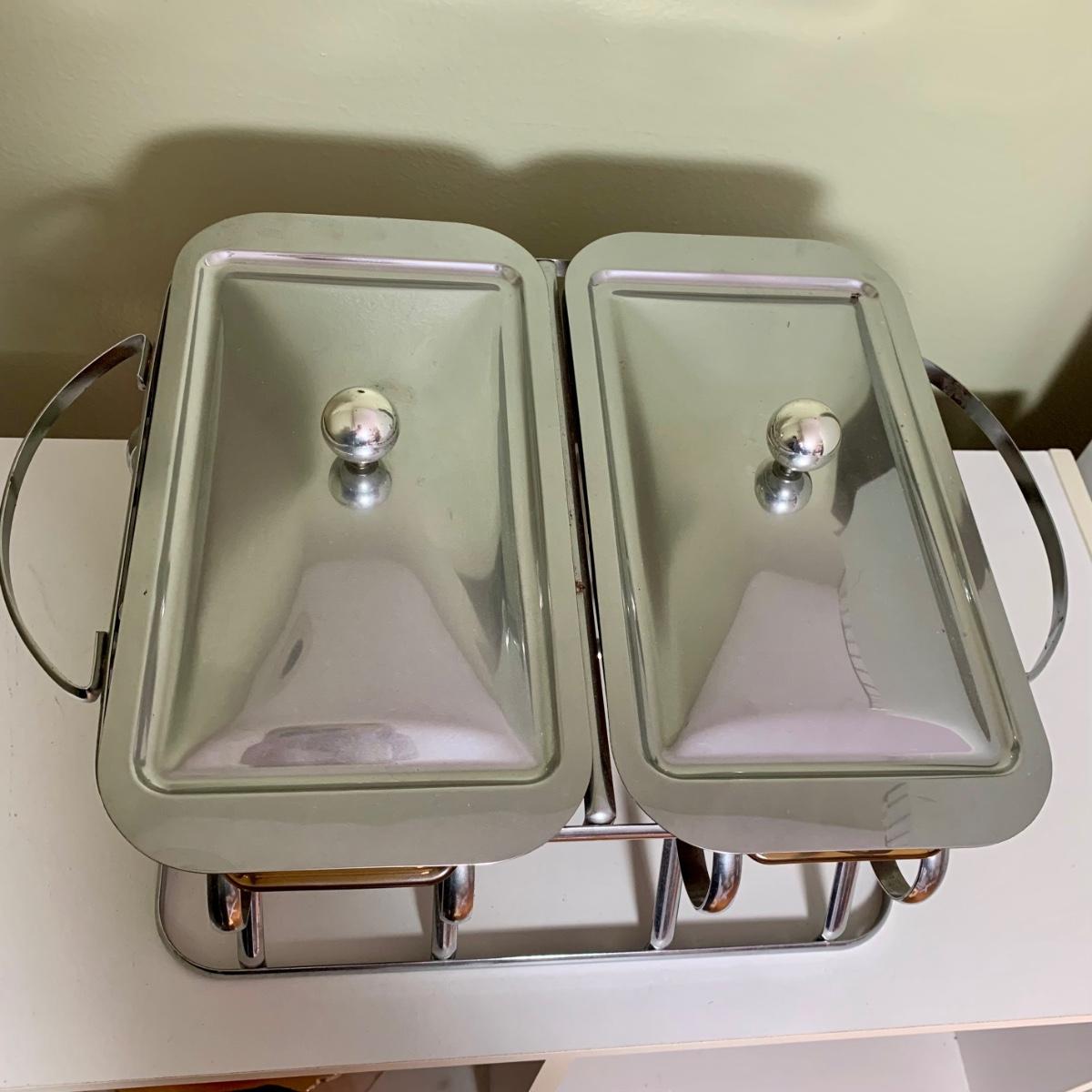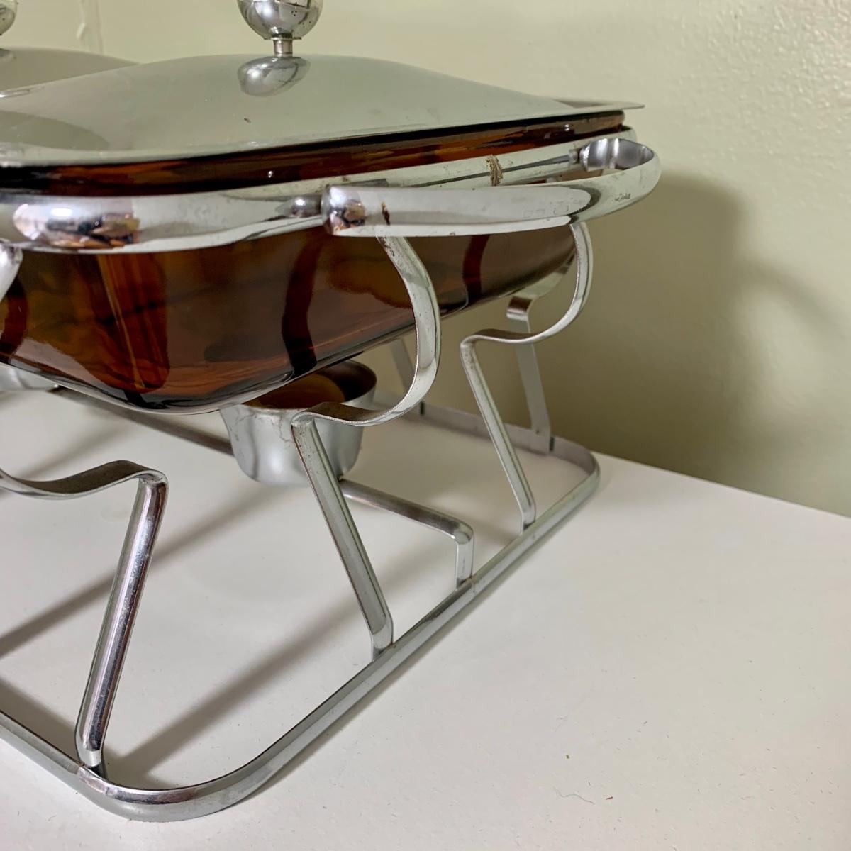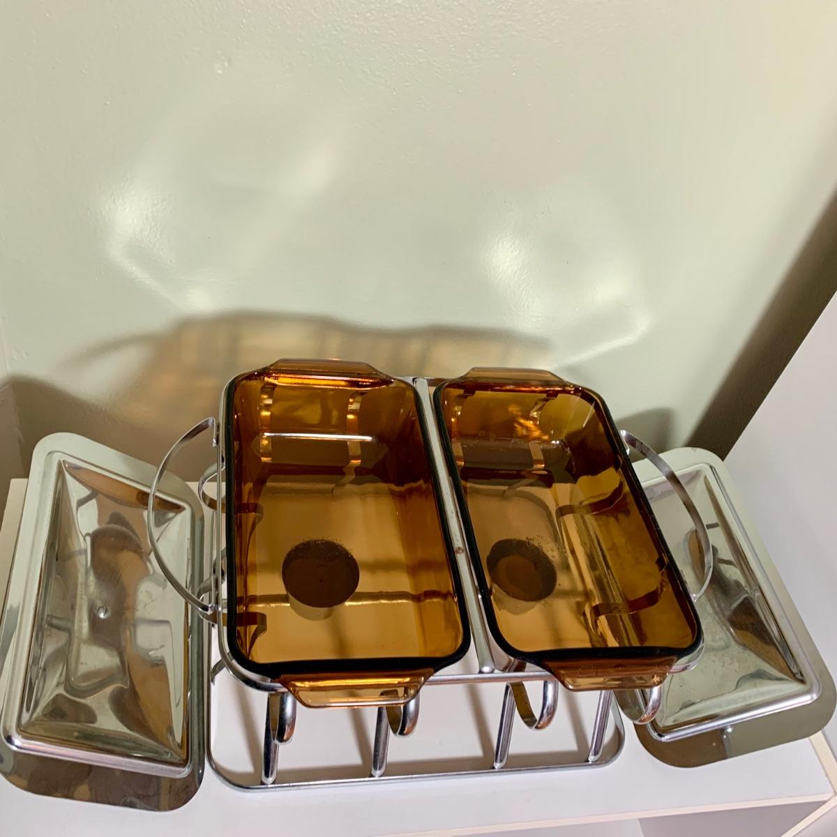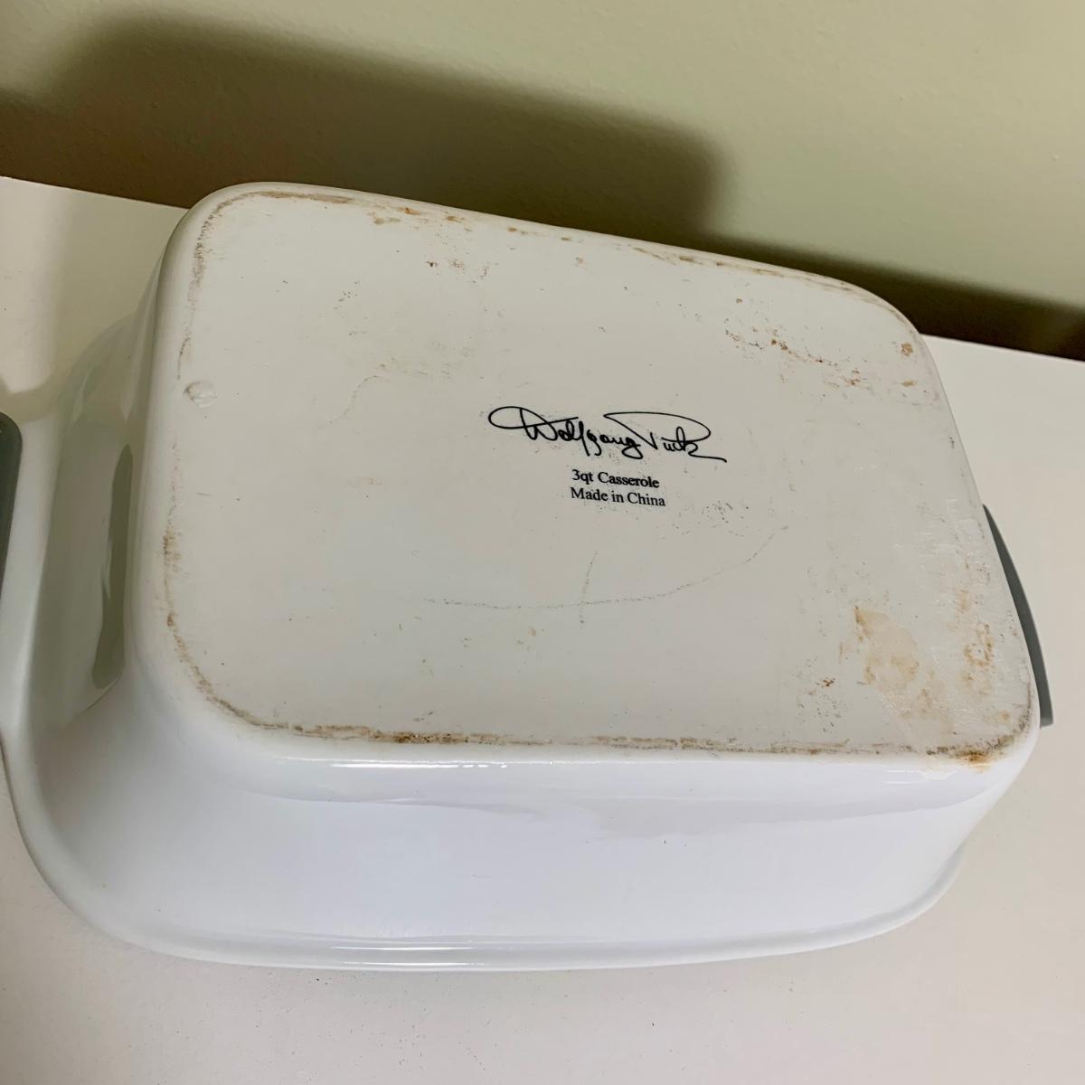 LOT 158 K: Wolfgang Puck 3 QT Casserole Dish w/ Insulated Travel Case, Pyrex Fireside In A Basket 3 QT Utility Dish w/ Woven Basket, & Anchor Hoking Fire King Double 1.5 QT Food Warmer / Serving Set
