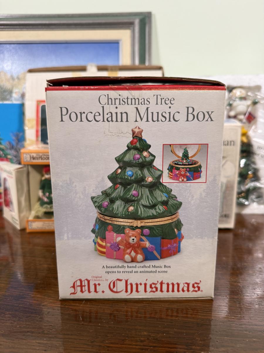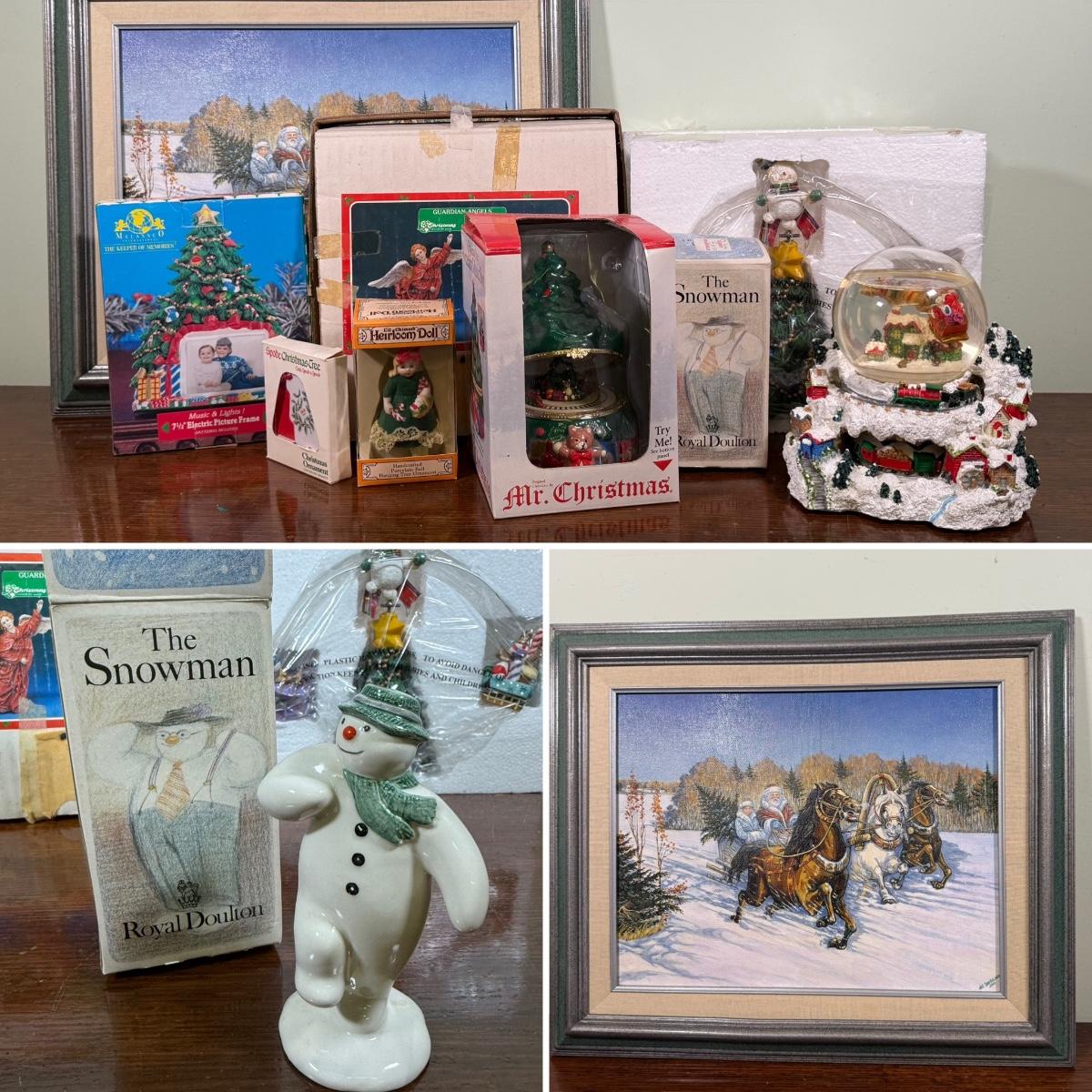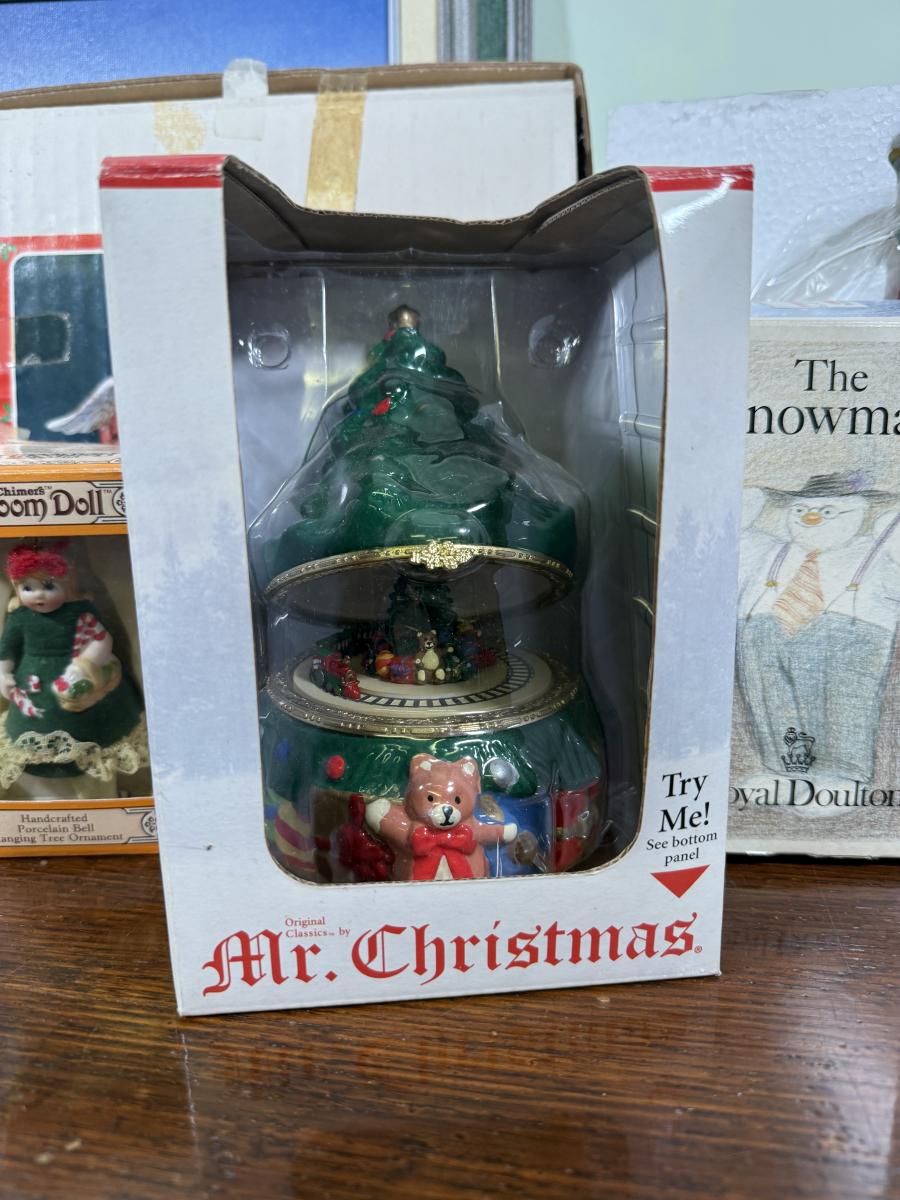 LOT 161B: Christmas Decor Collection - NIB Mr Christmas Tree Porcelain Music Box, Spode Ornament, Royal Doulton The Snowman w/ Box & More