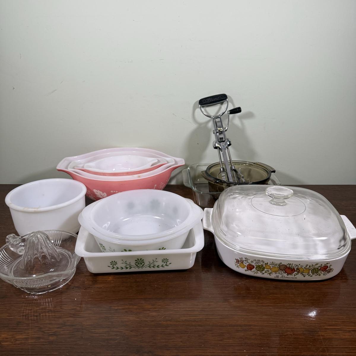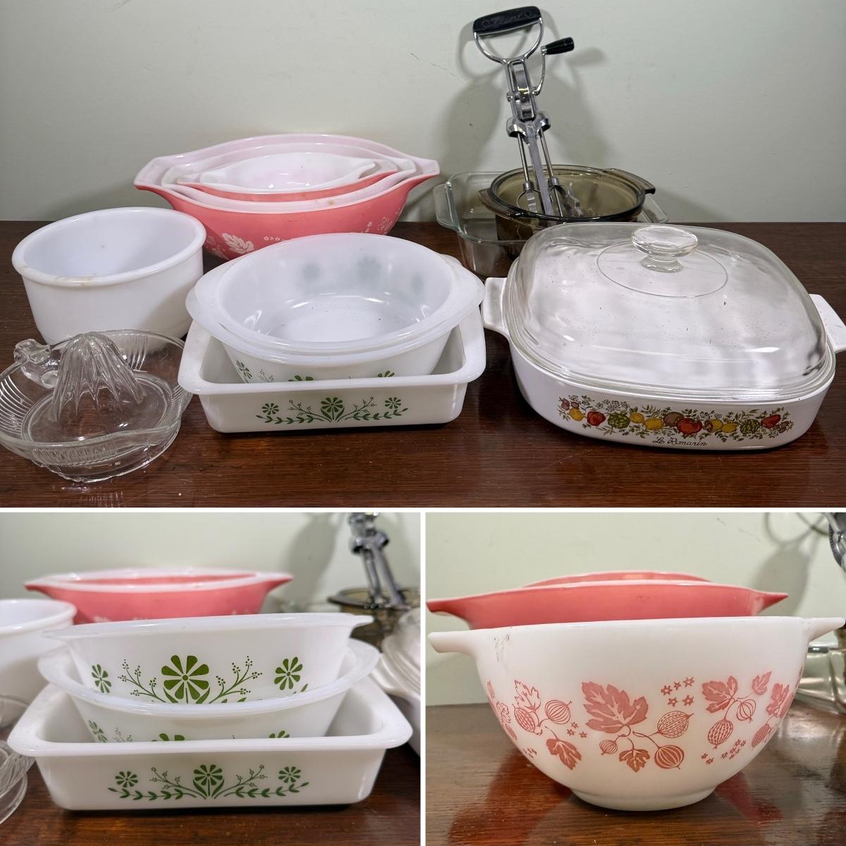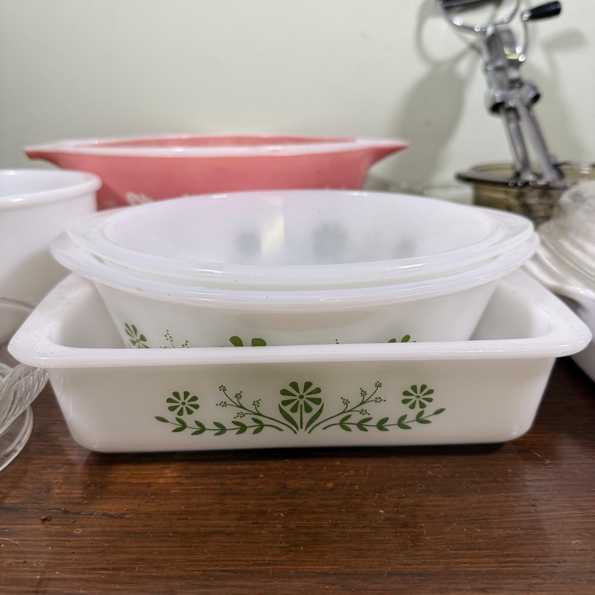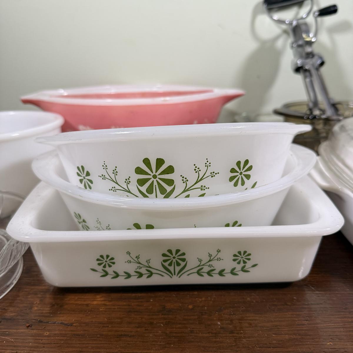 LOT 180B: 1970s Glasbake Milk Glass Green Daisy Baking Dishes, 1960s Pyrex Pink Cinderella Gooseberry Nesting Mixing Bowls & More