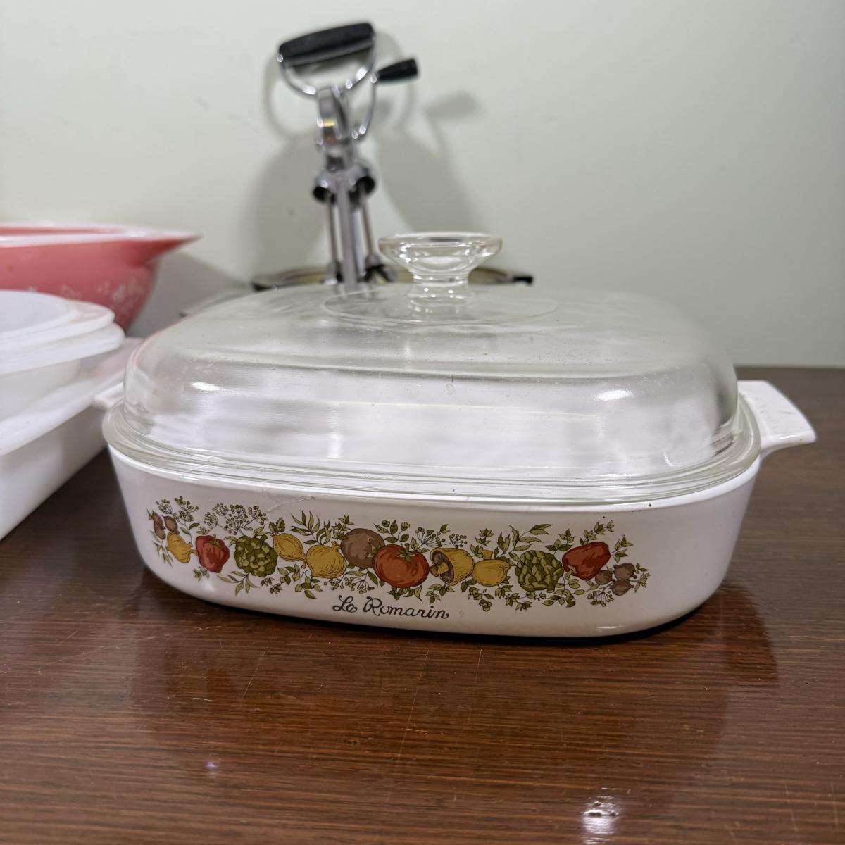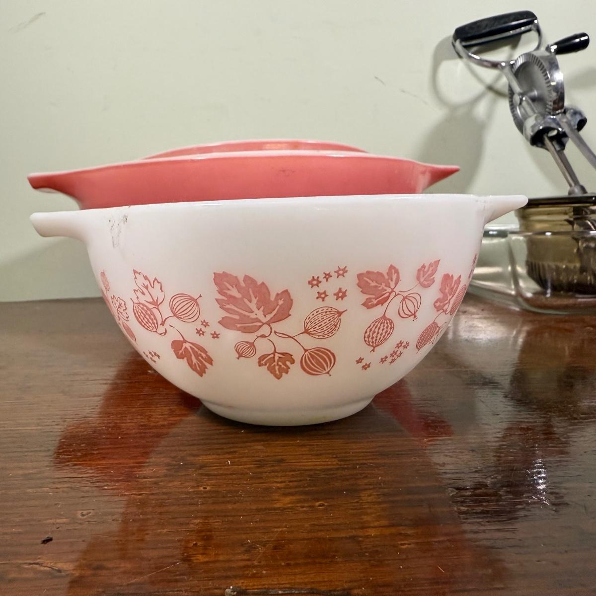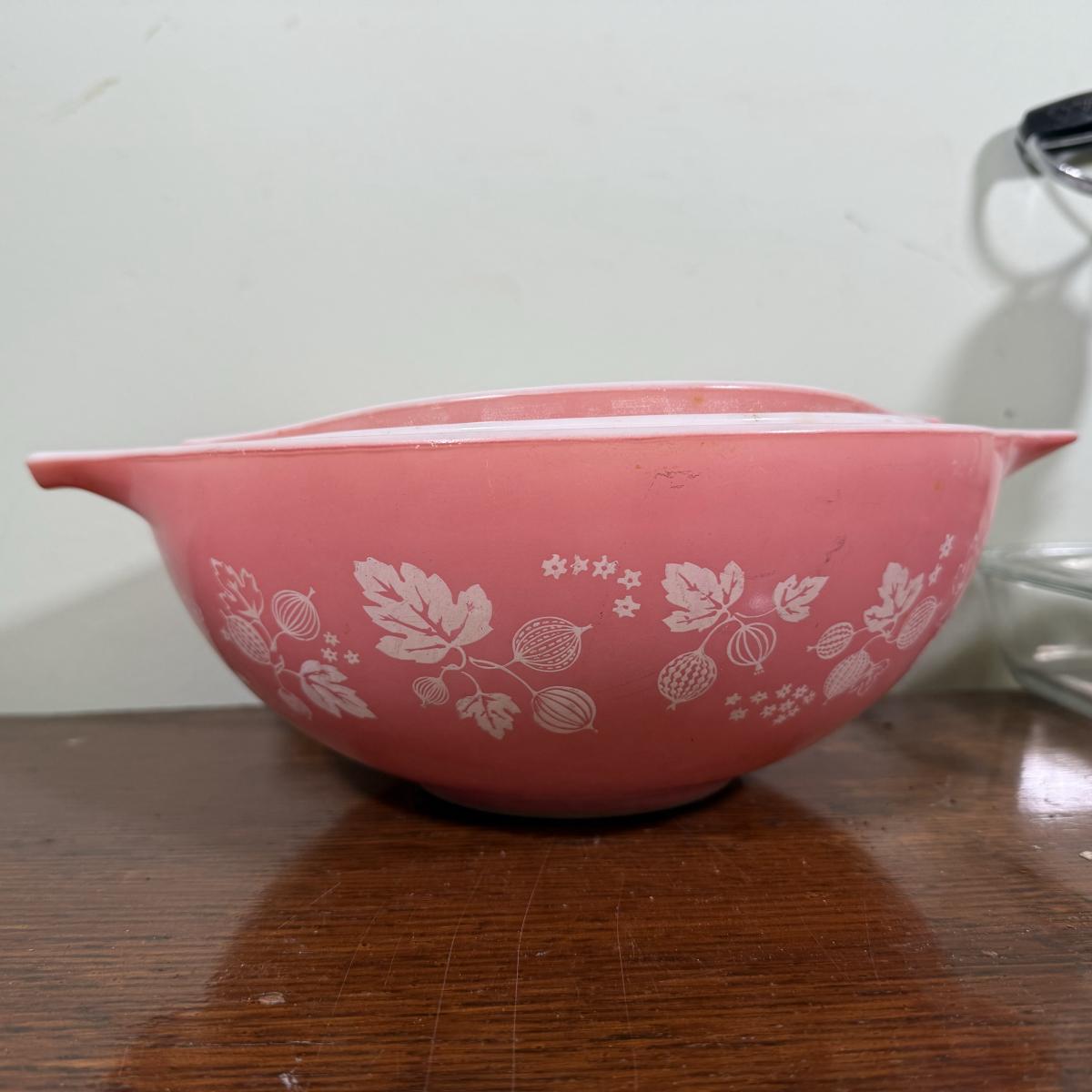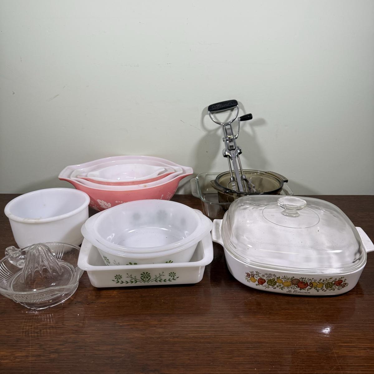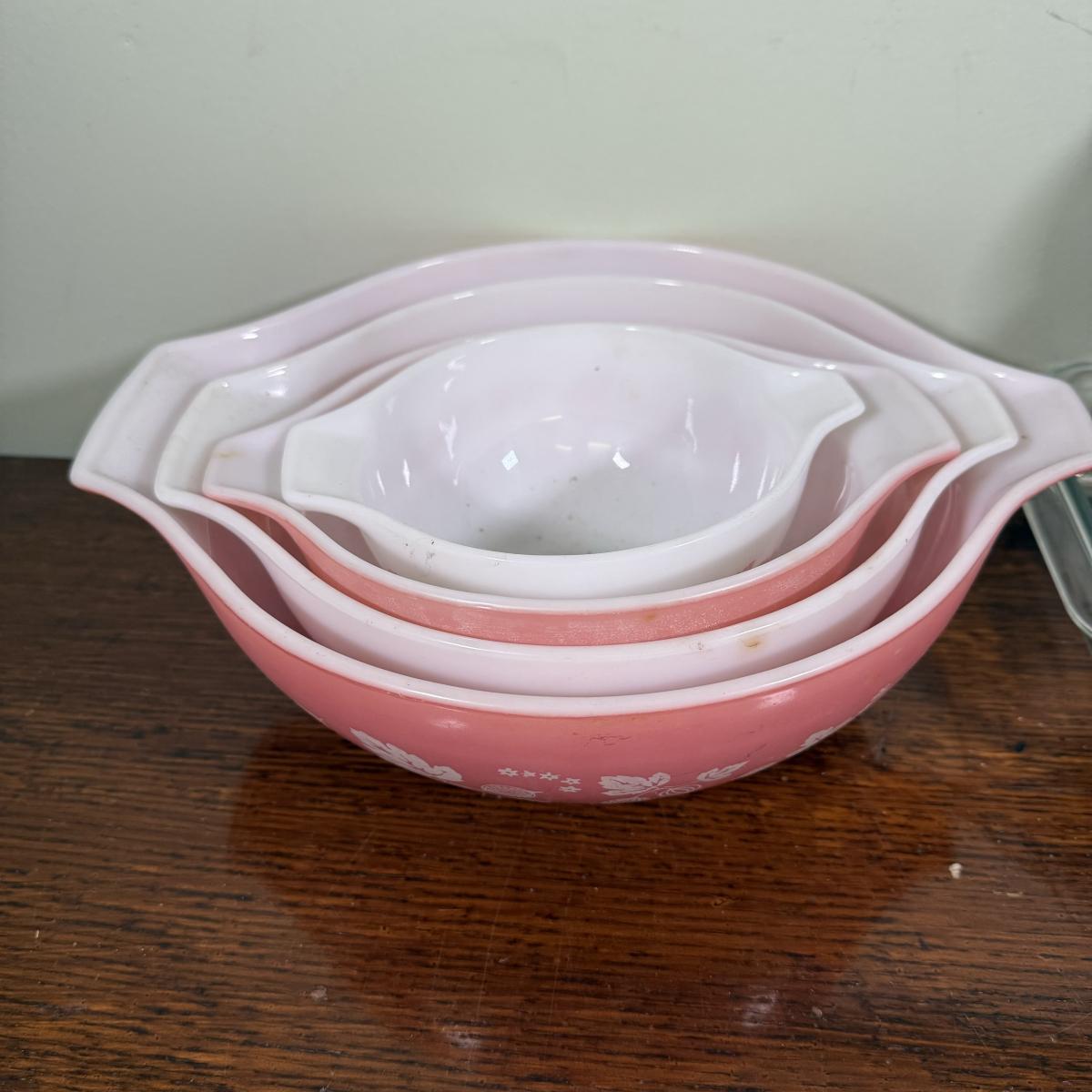 LOT 180B: 1970s Glasbake Milk Glass Green Daisy Baking Dishes, 1960s Pyrex Pink Cinderella Gooseberry Nesting Mixing Bowls & More