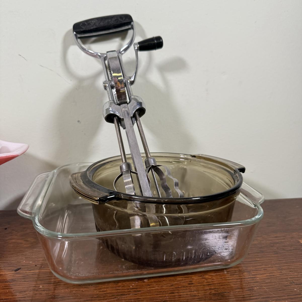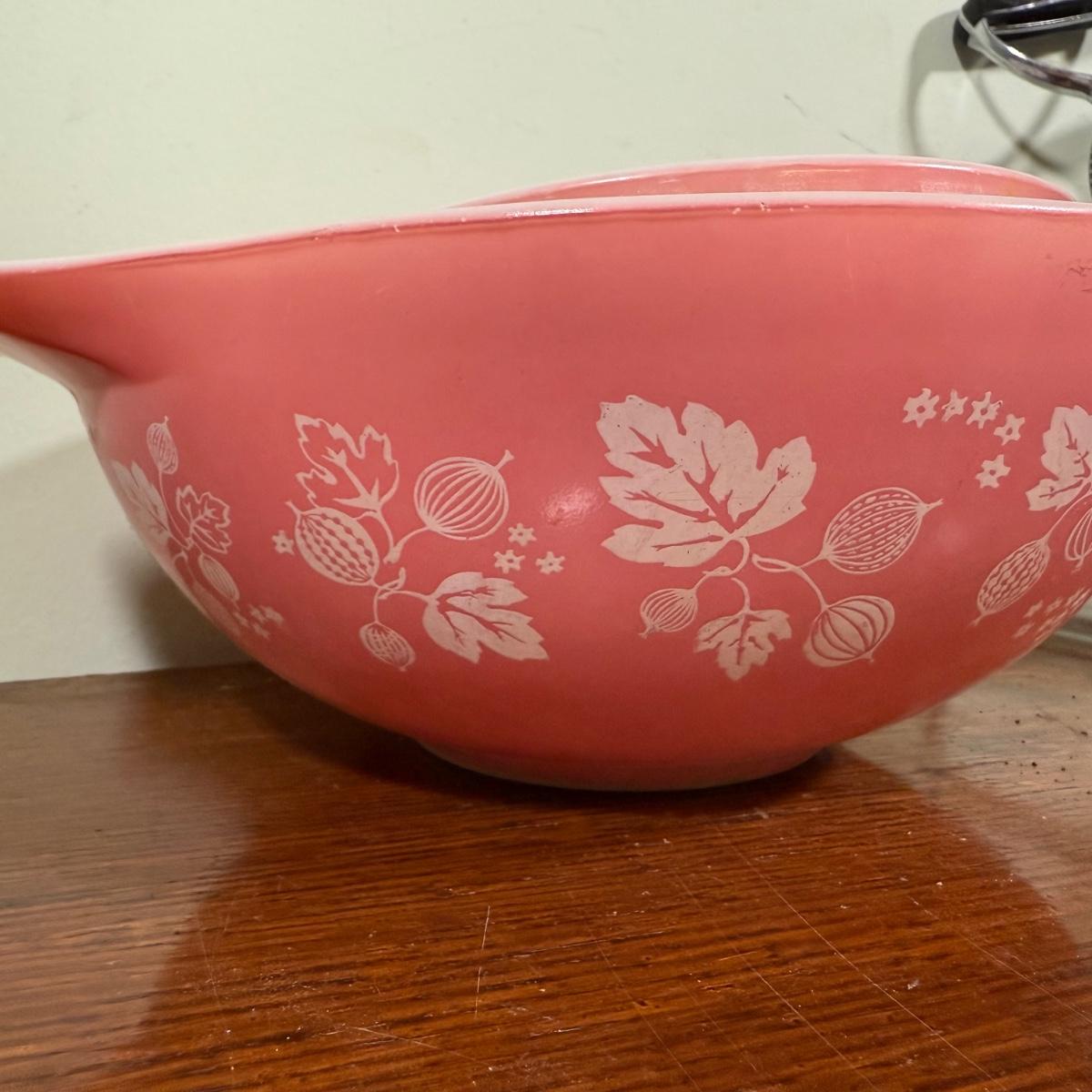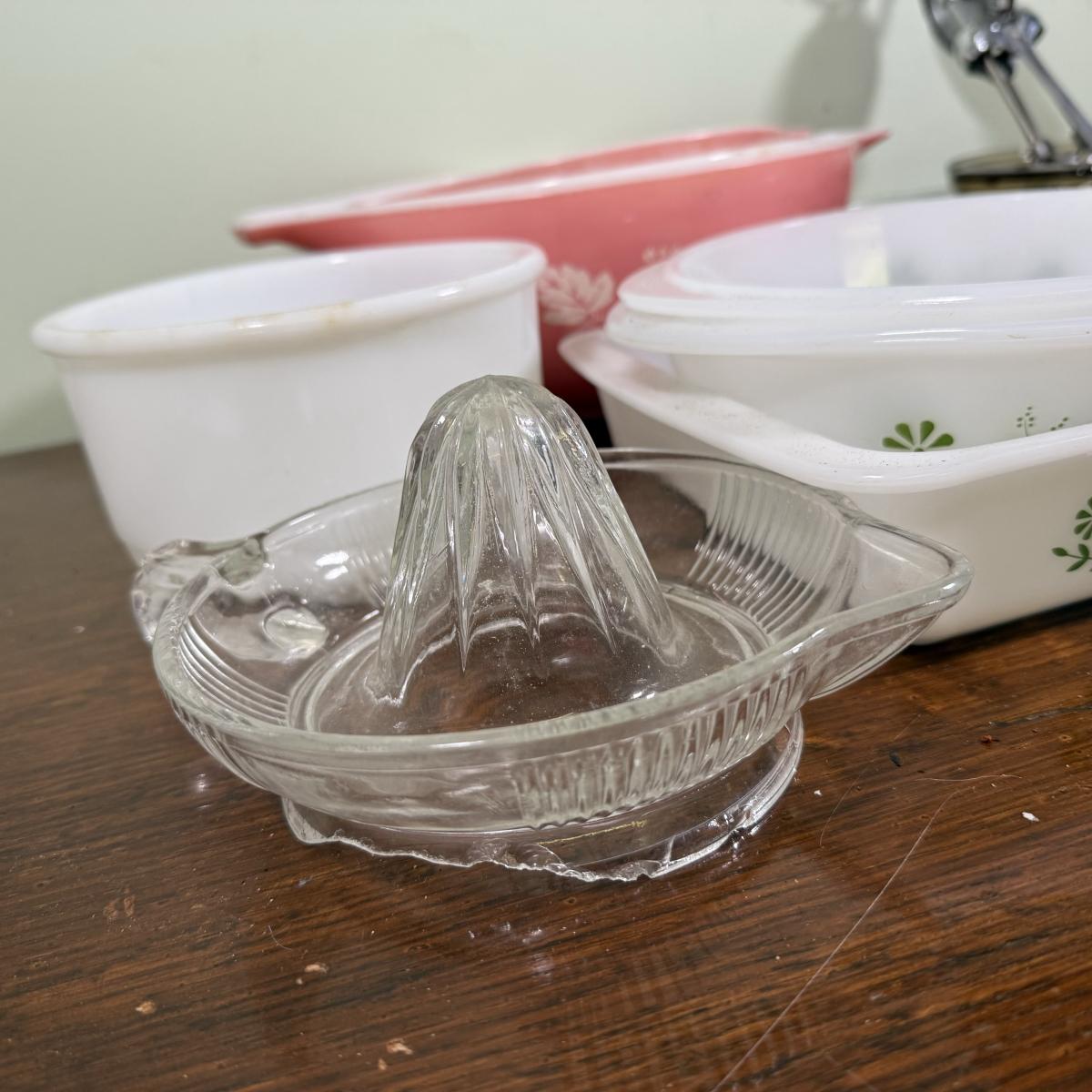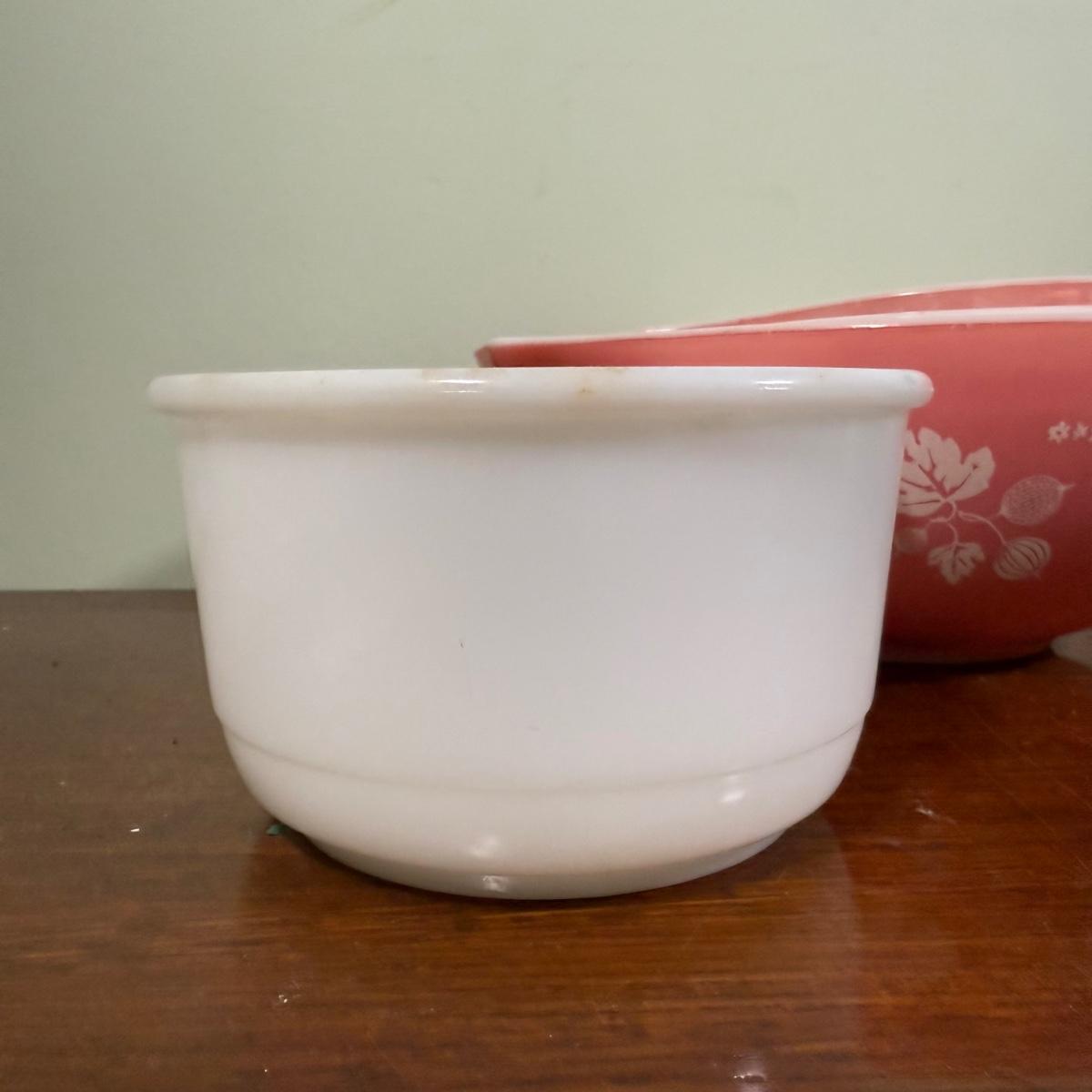 LOT 180B: 1970s Glasbake Milk Glass Green Daisy Baking Dishes, 1960s Pyrex Pink Cinderella Gooseberry Nesting Mixing Bowls & More
