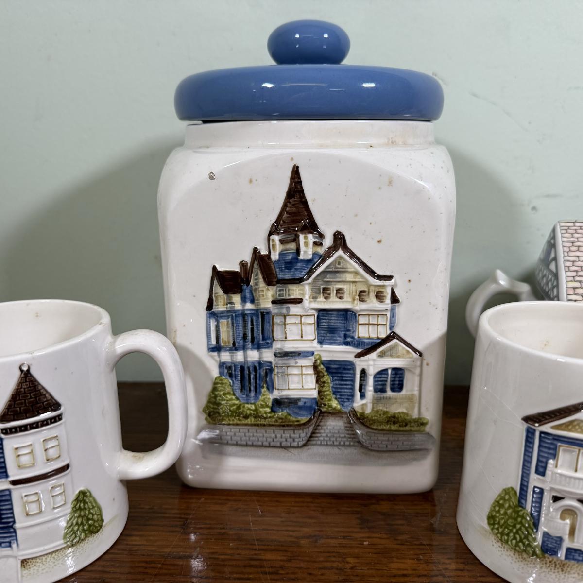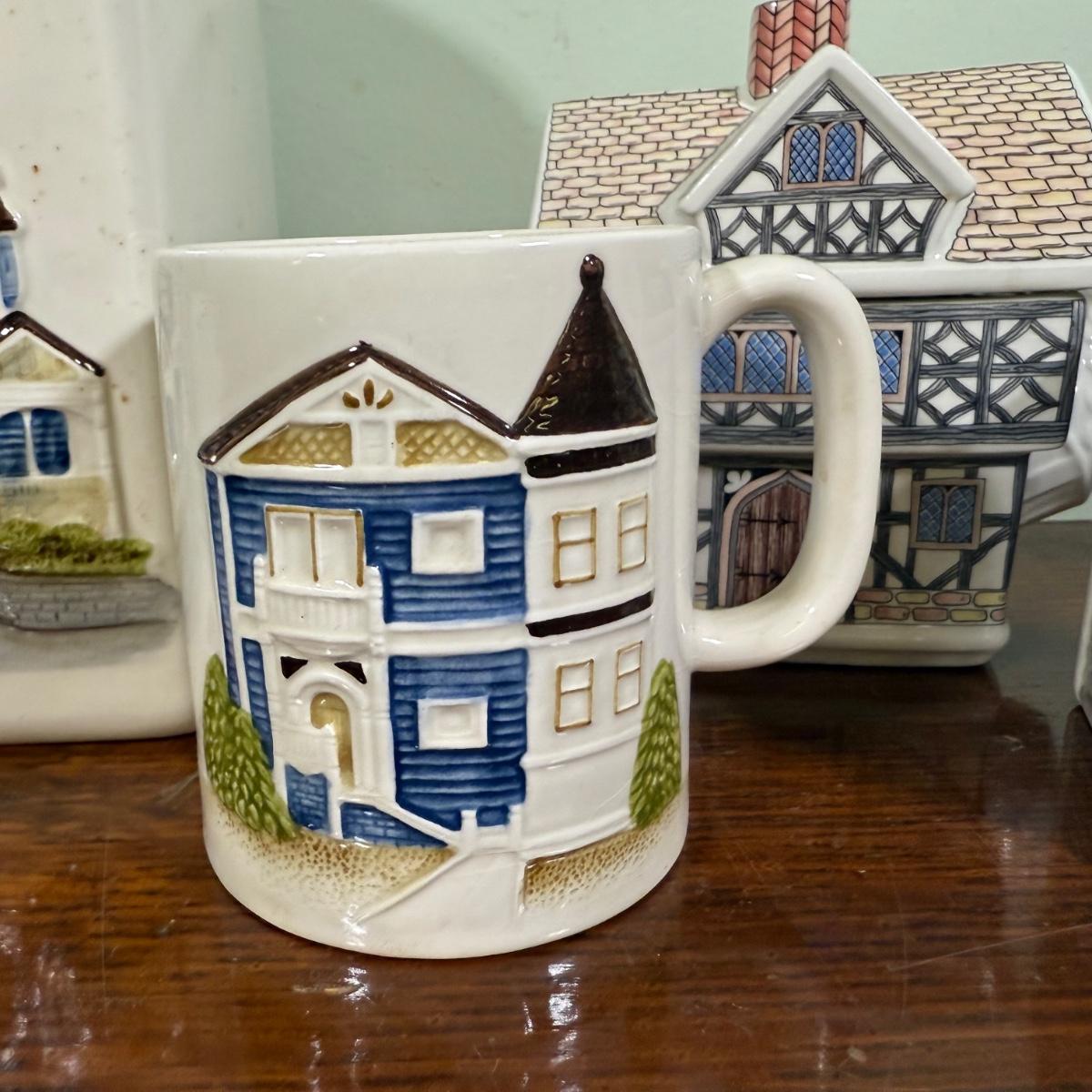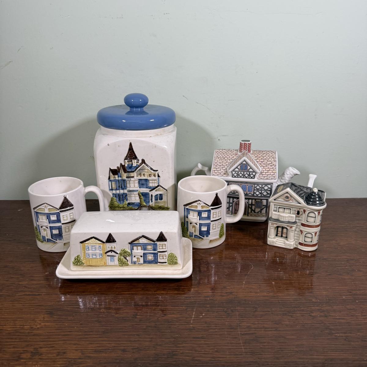 LOT 187B: Sadler "Tudor House" Teapot w/ Otagiri Cookie Jar, Mugs & Butter Dish