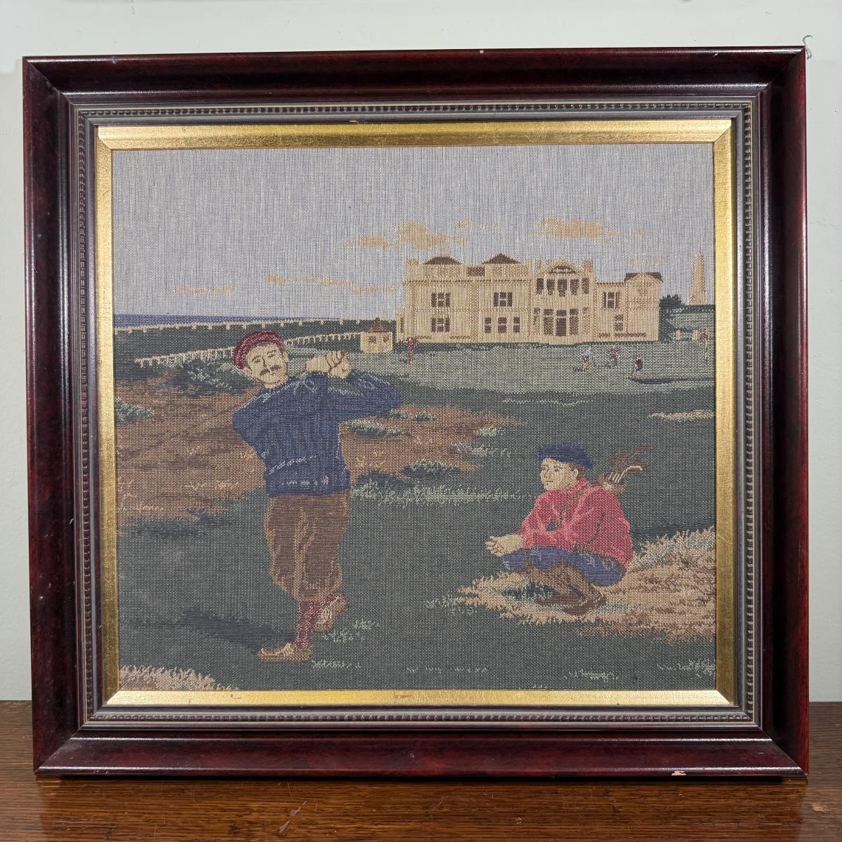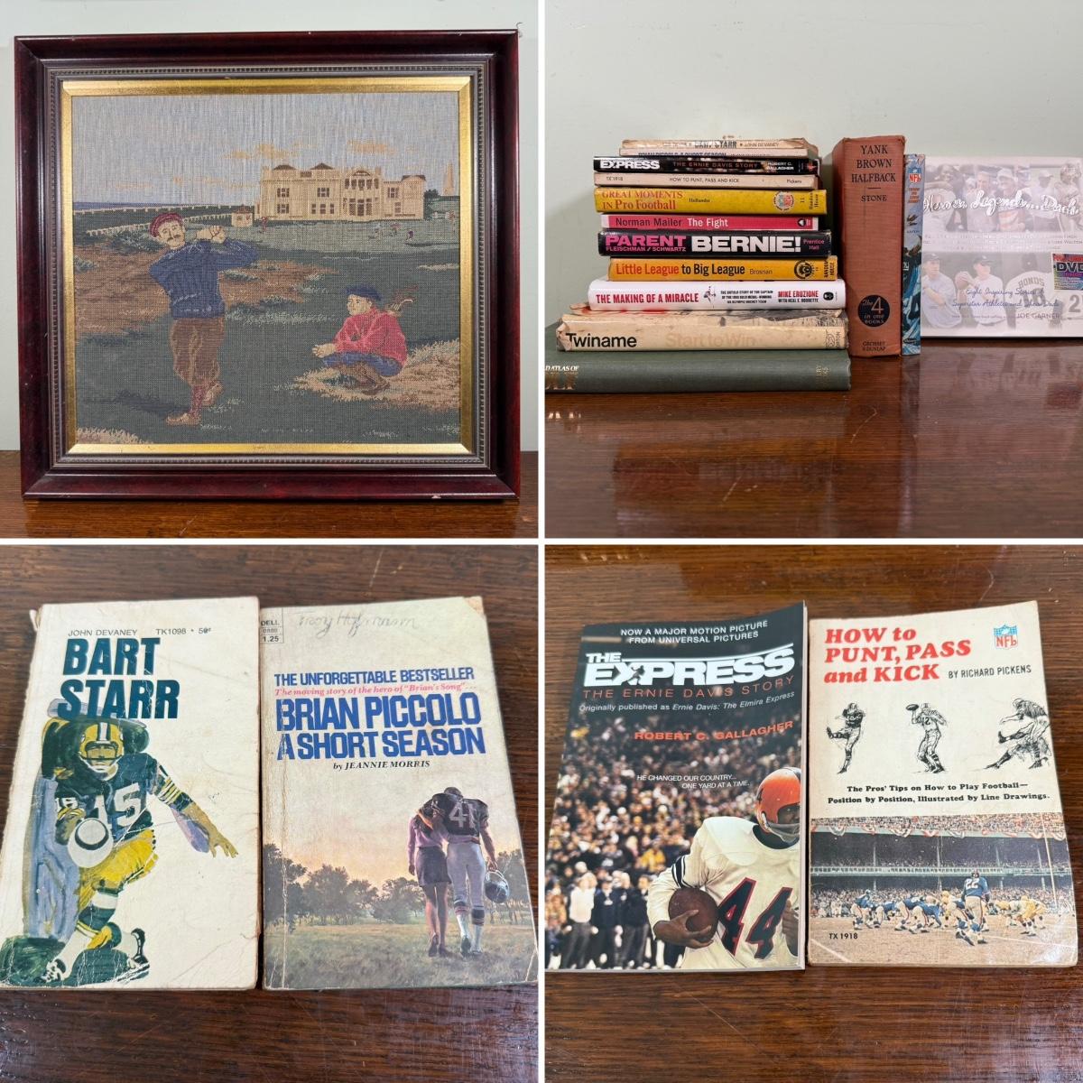 LOT 192B: Vintage Embroidered Framed Bombay Co Golf Scene w/ Collection of Sports Books