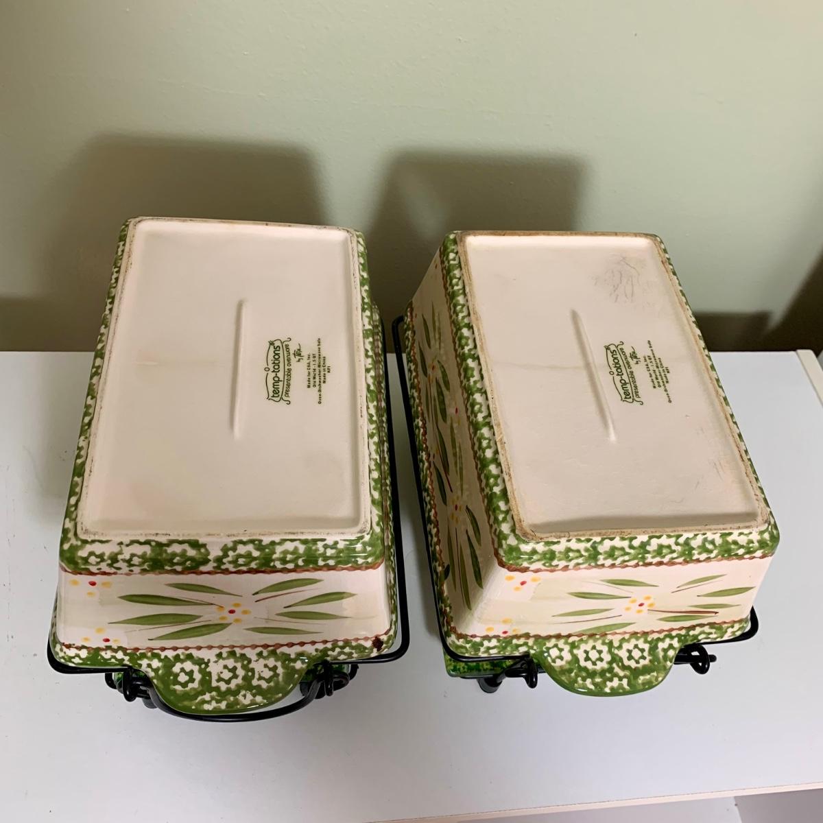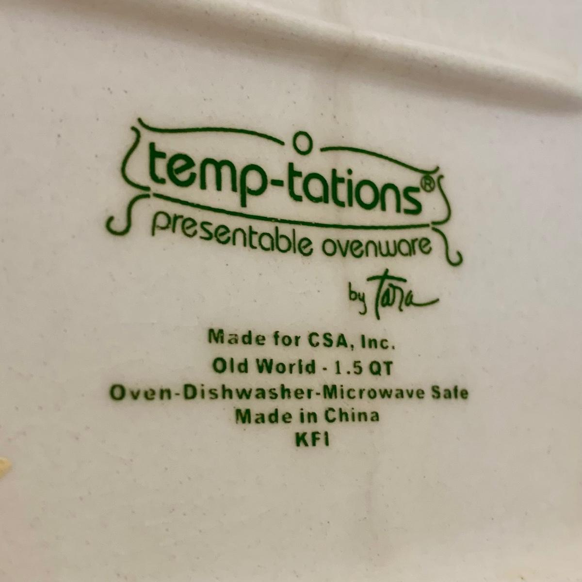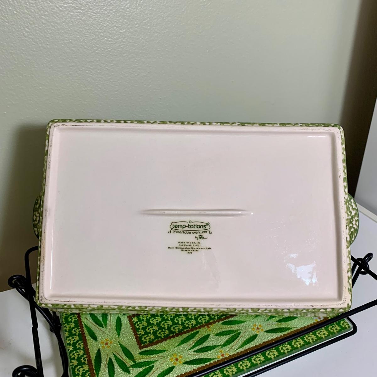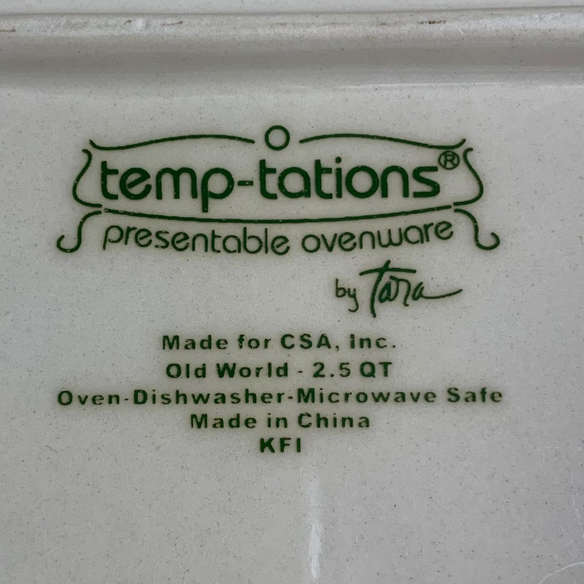 LOT 202 K: Temp-tations Ovenware Collection: 2 Old World 1.5 QT Dishes, 2.5 QT Dish, & 4 QT Dish w/ Racks & Polka Dot 2 QT Chicken Dish