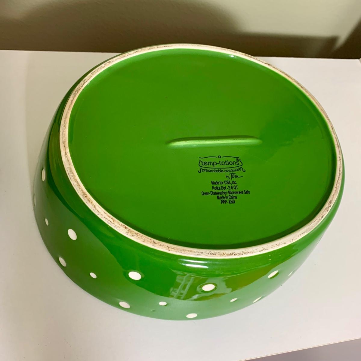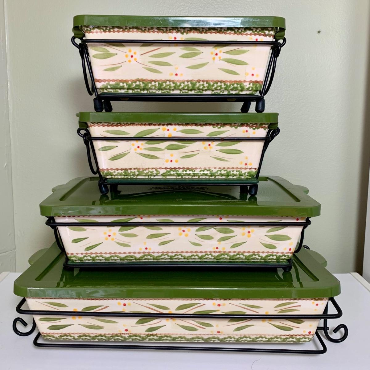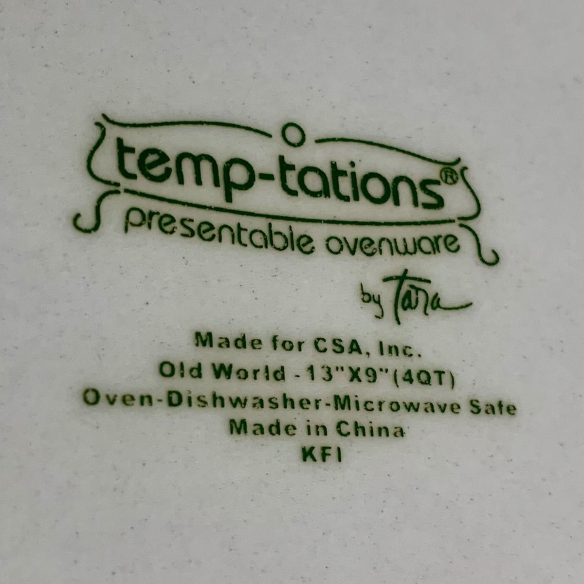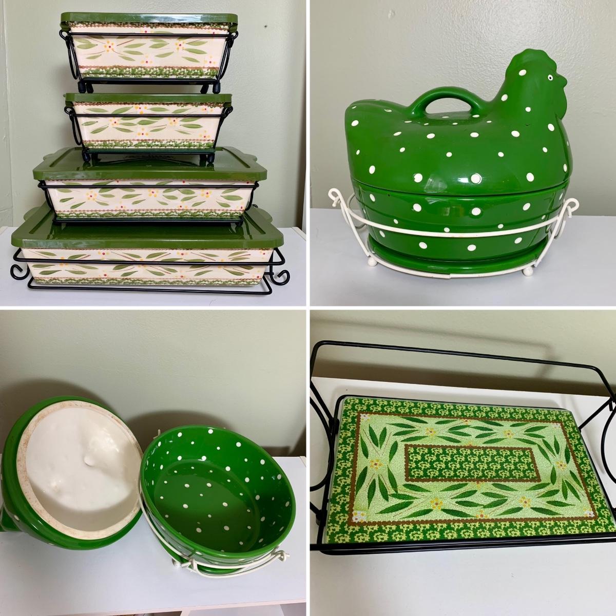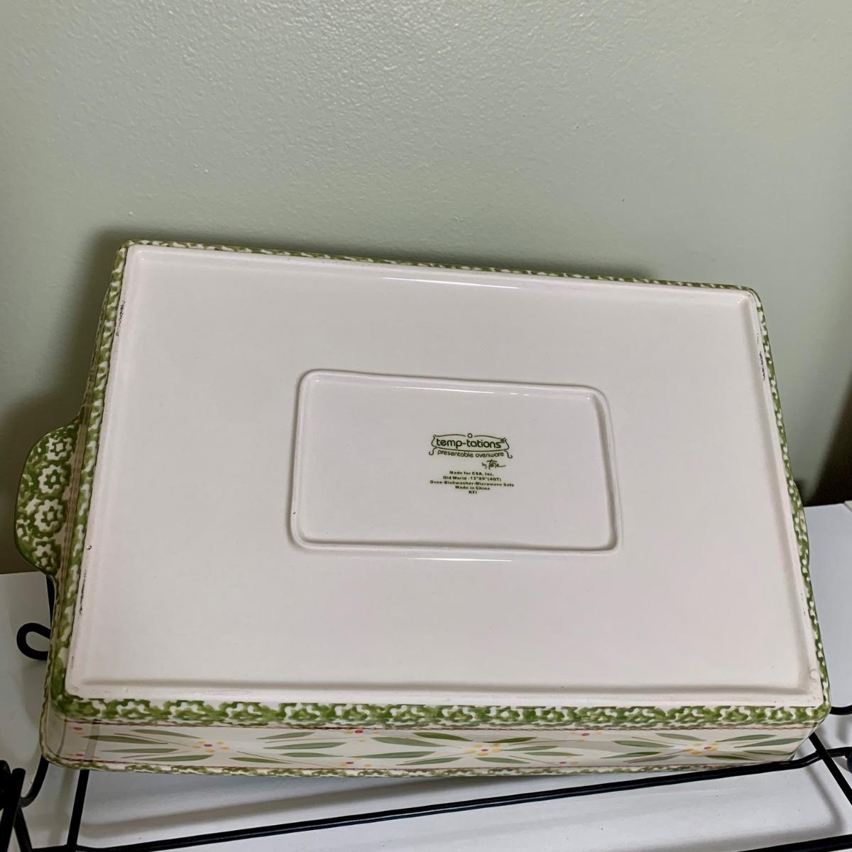 LOT 202 K: Temp-tations Ovenware Collection: 2 Old World 1.5 QT Dishes, 2.5 QT Dish, & 4 QT Dish w/ Racks & Polka Dot 2 QT Chicken Dish
