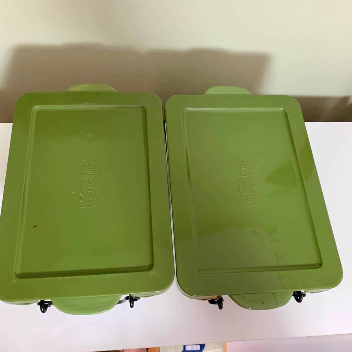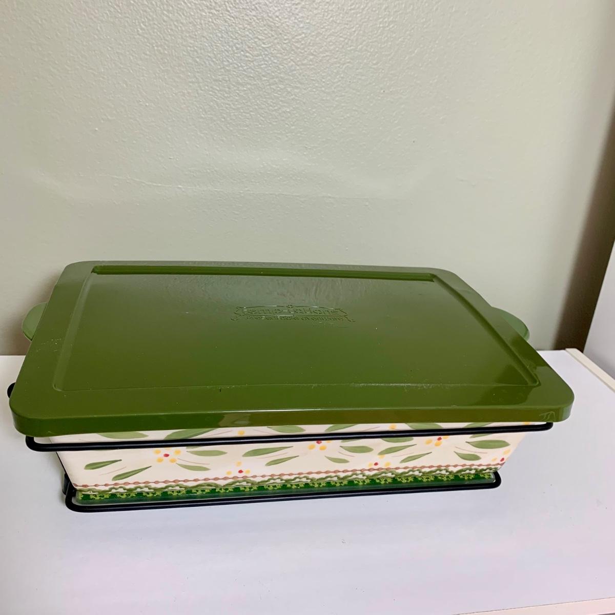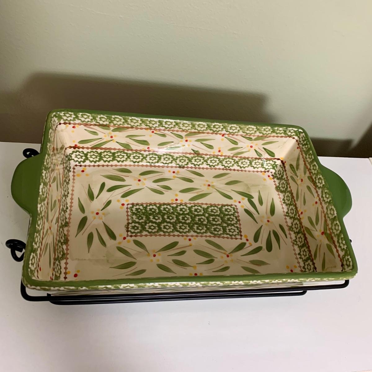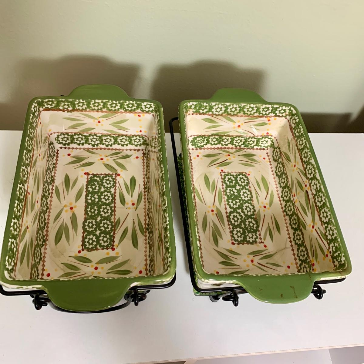 LOT 202 K: Temp-tations Ovenware Collection: 2 Old World 1.5 QT Dishes, 2.5 QT Dish, & 4 QT Dish w/ Racks & Polka Dot 2 QT Chicken Dish